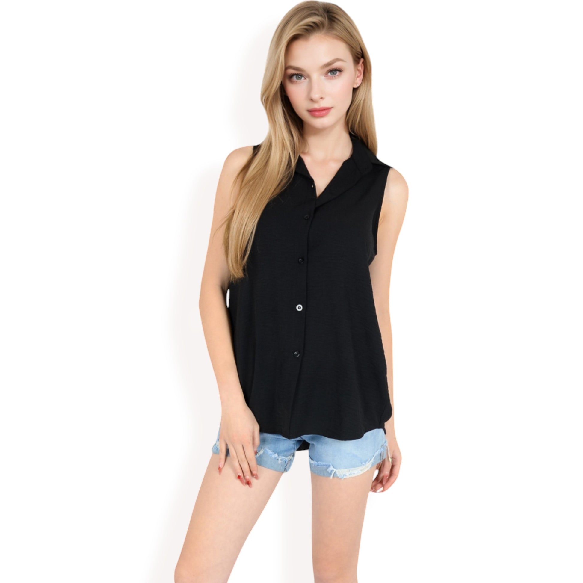 Sleeveless Button-Down Collared Top with Lightweight Textured Fabric and Classic Design