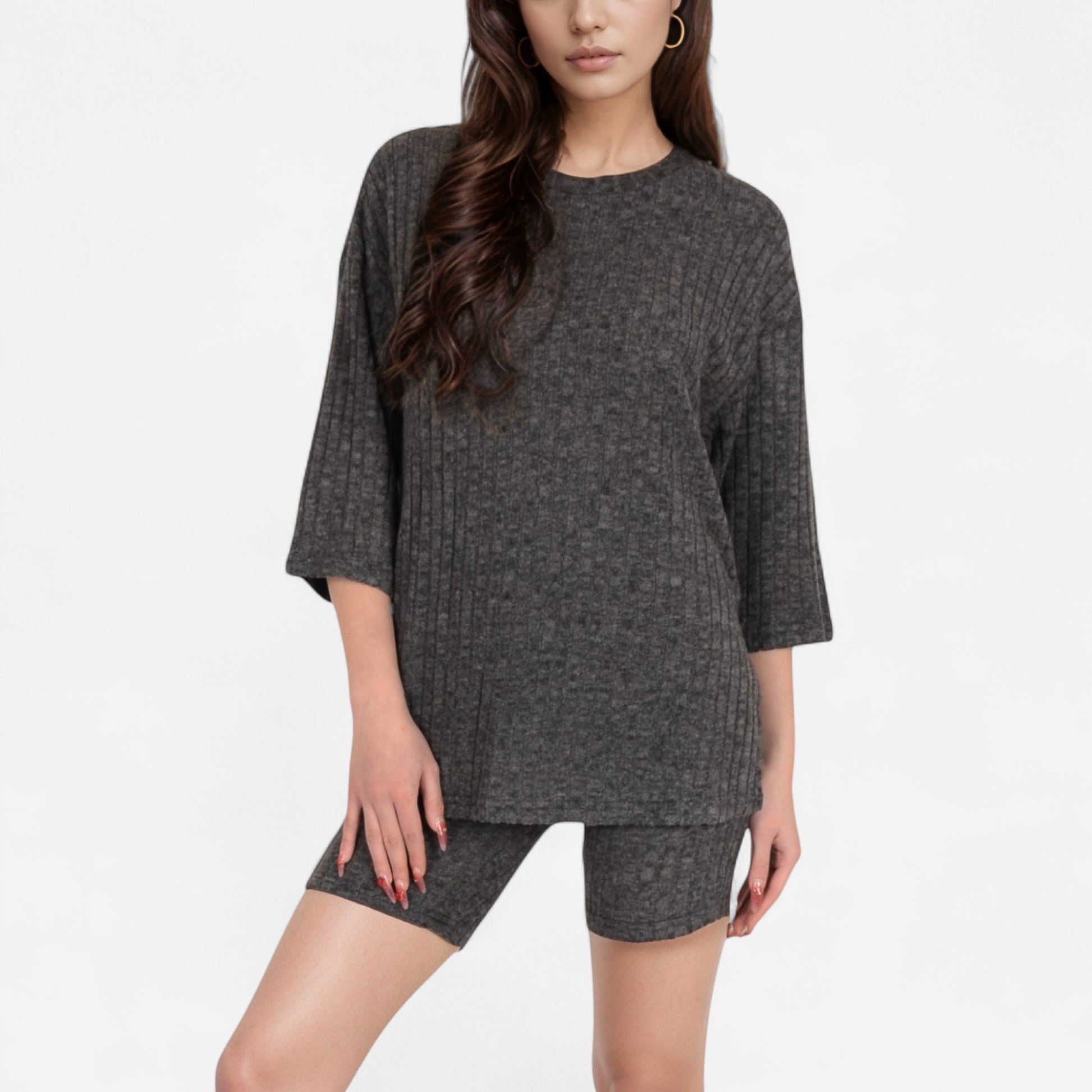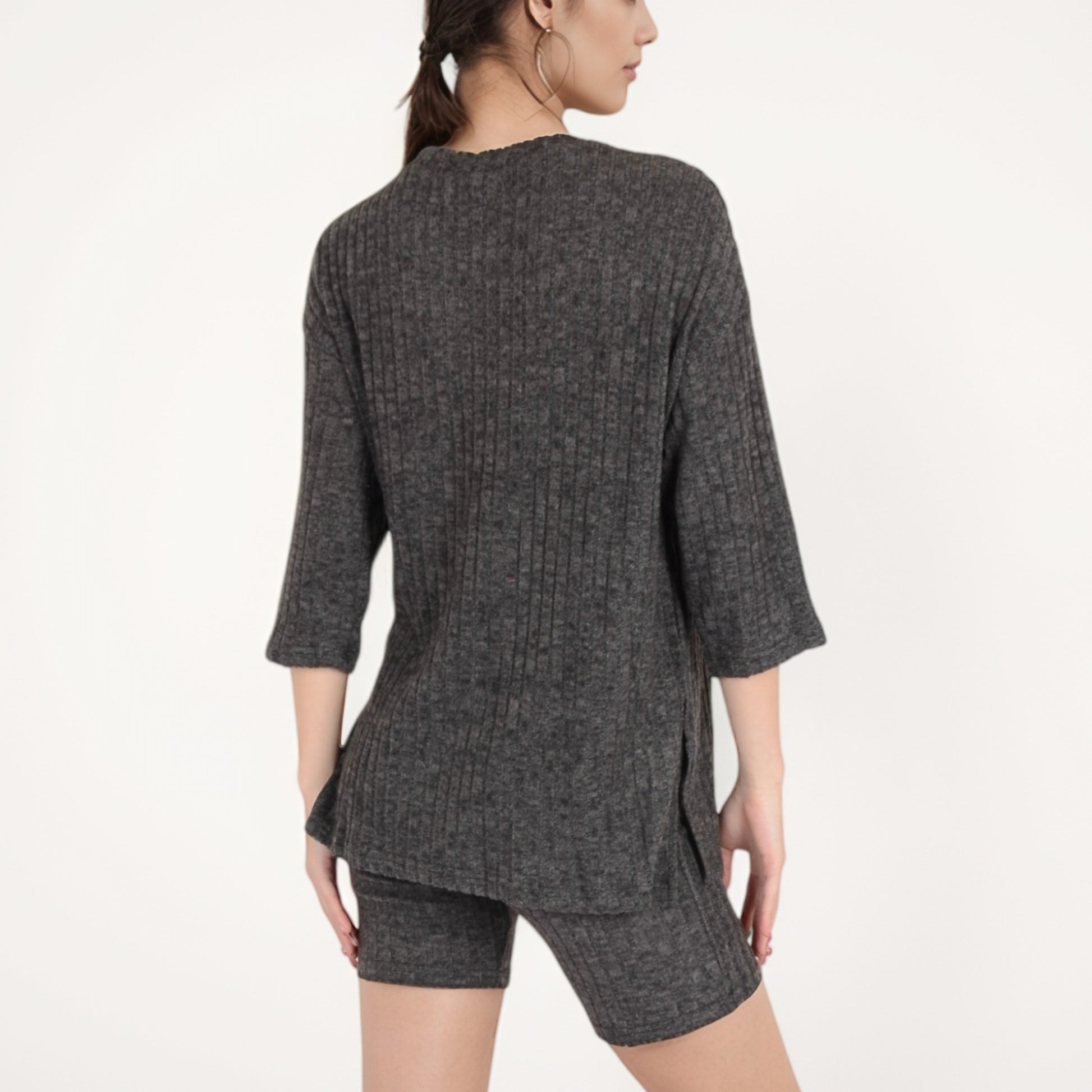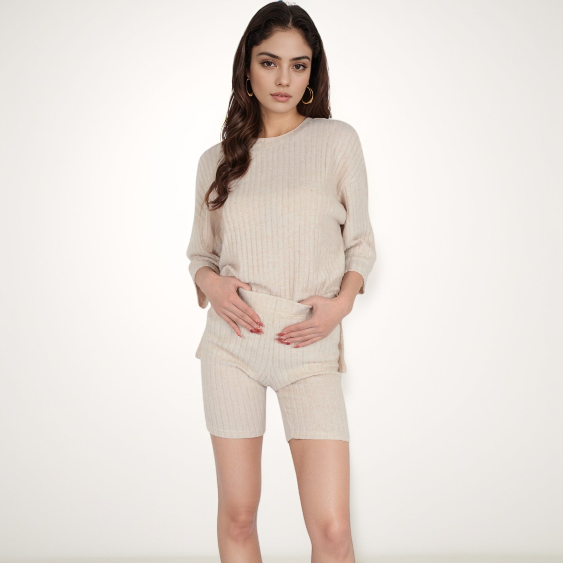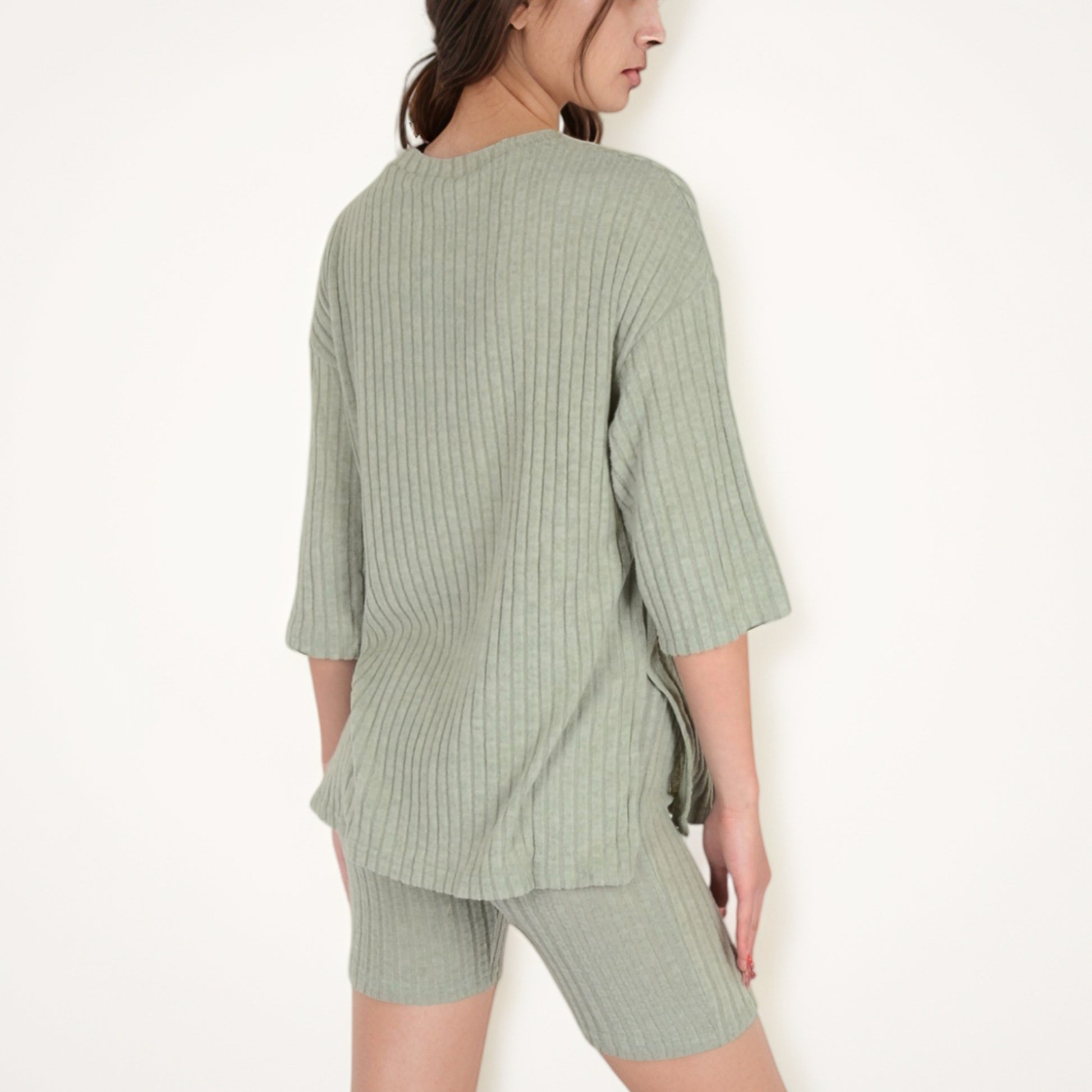 Ribbed Knit Lounge Set with 3/4 Sleeve Top and Fitted Shorts