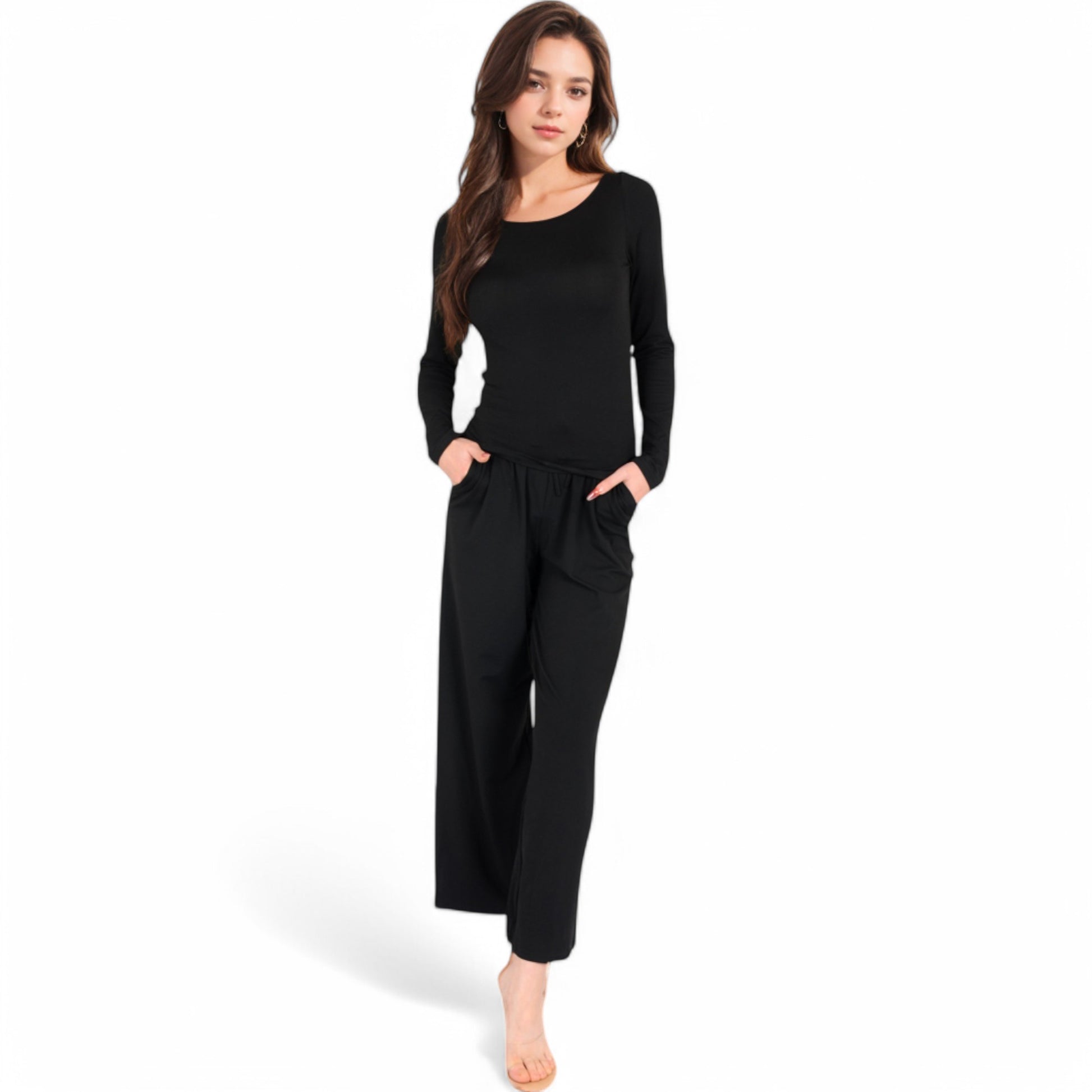 Wide-Leg Lounge Set with Elastic Waist and Drawstring Closure- Black,Small