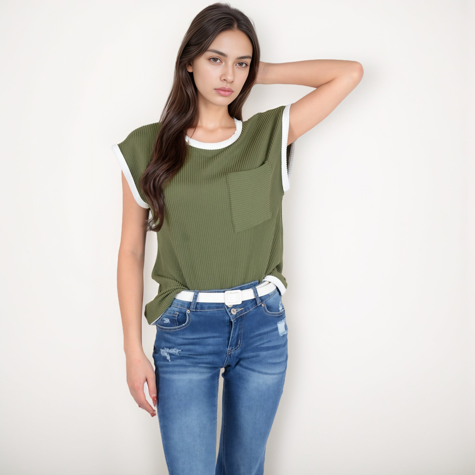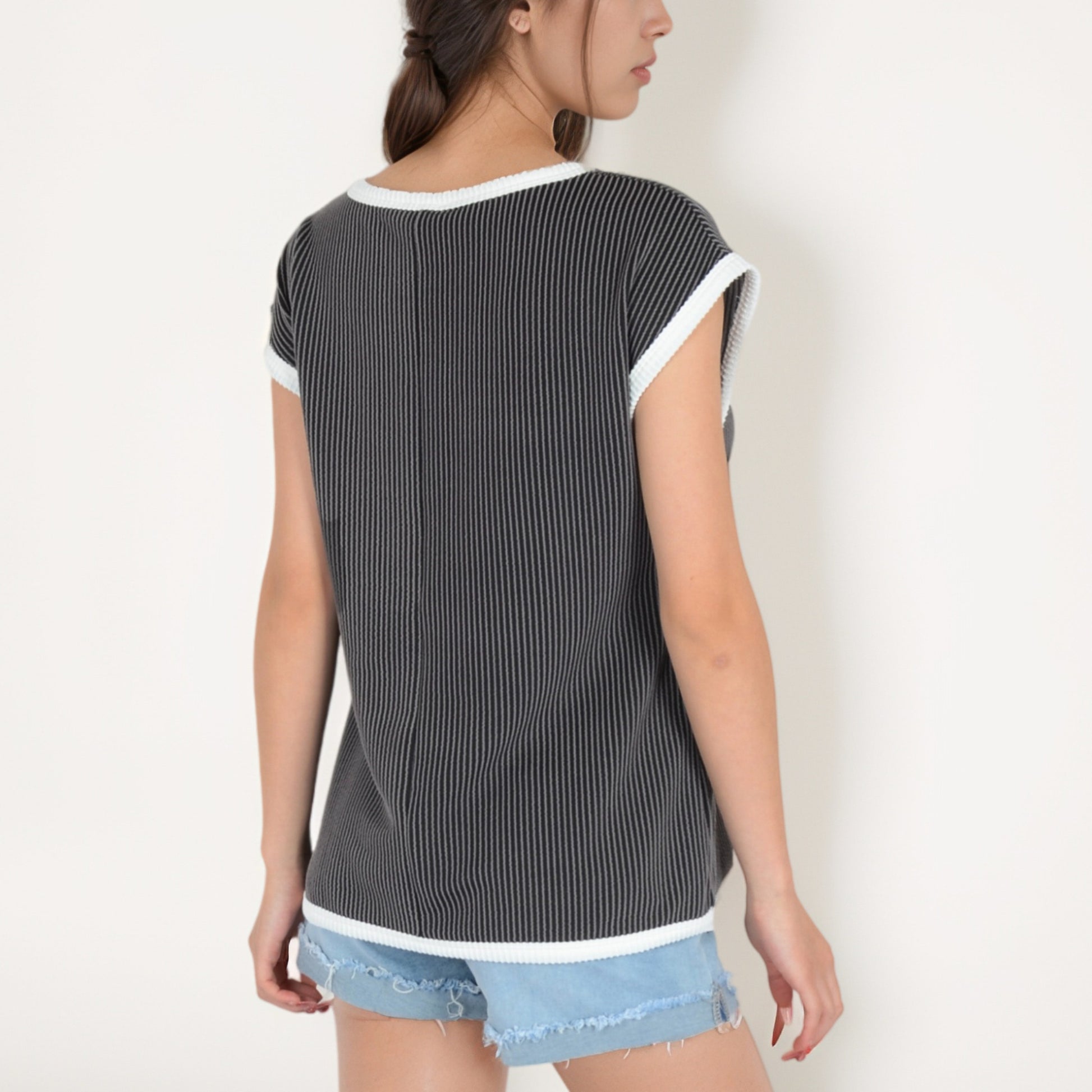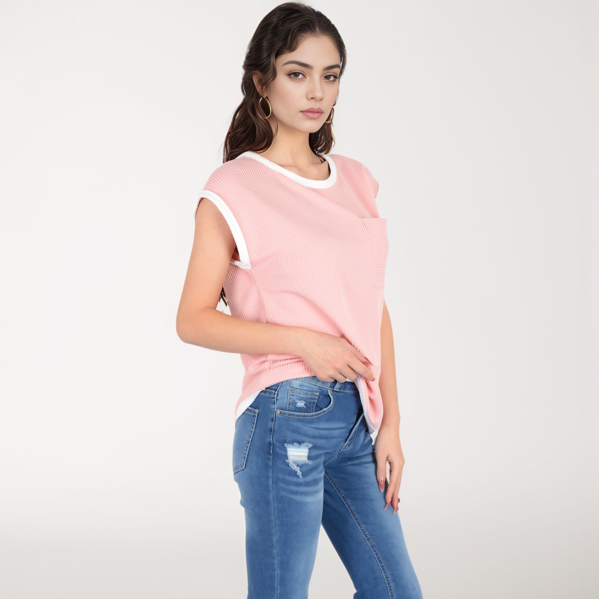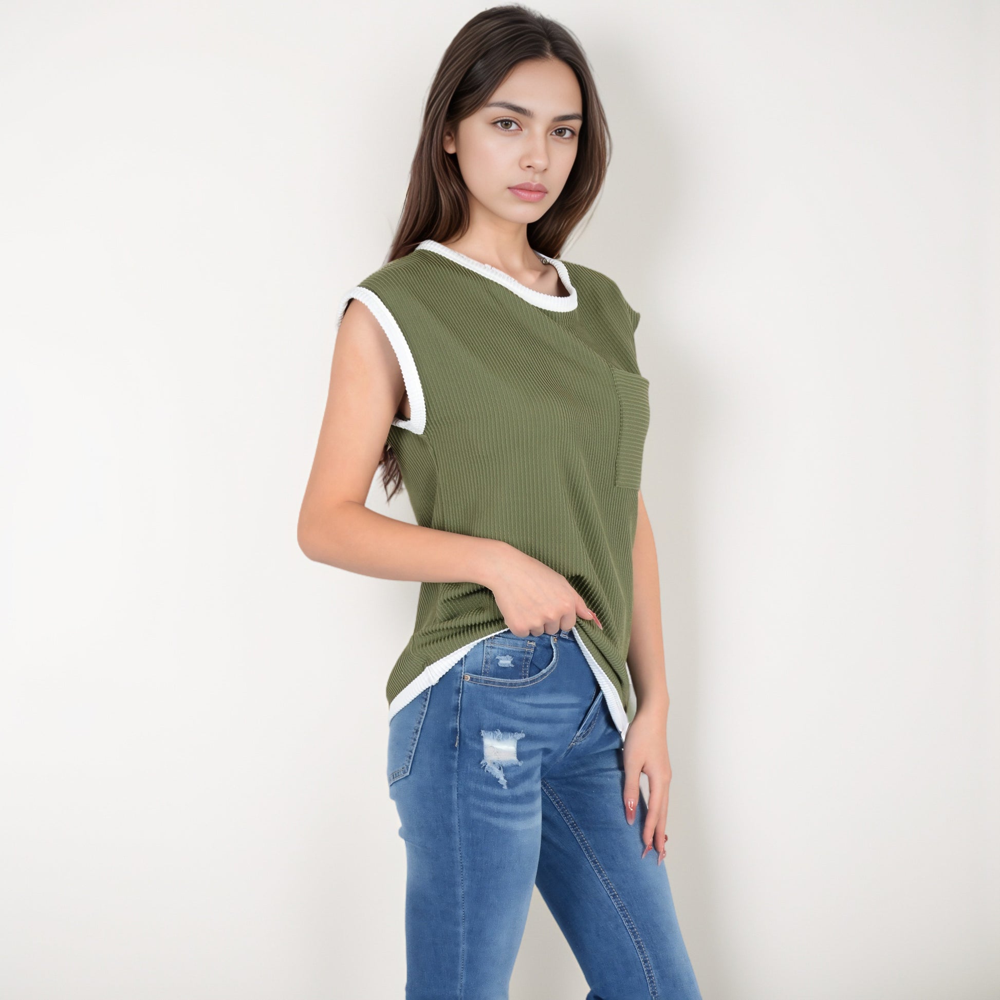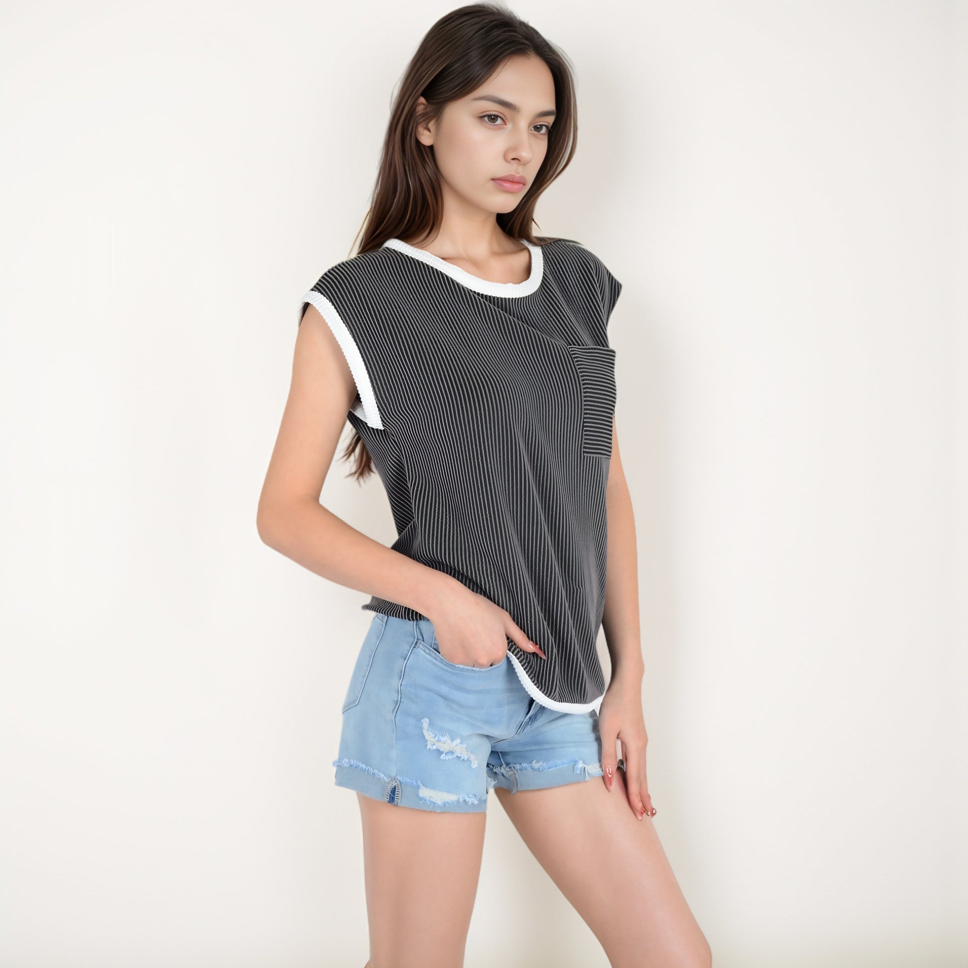 Sleeveless Striped Knit Top with Contrast Trim and Chest Pocket Detail