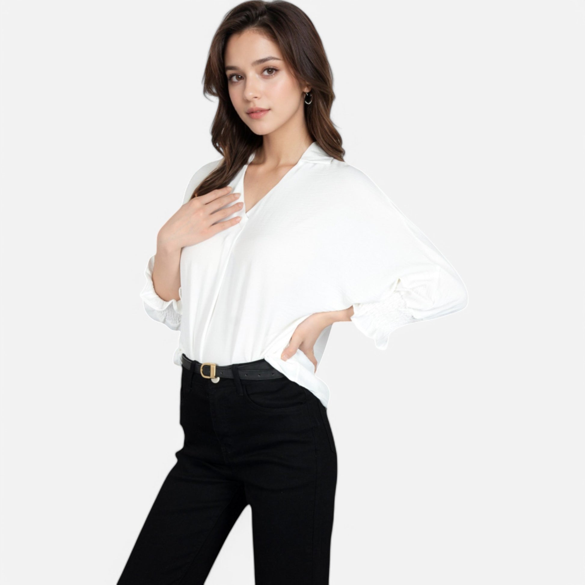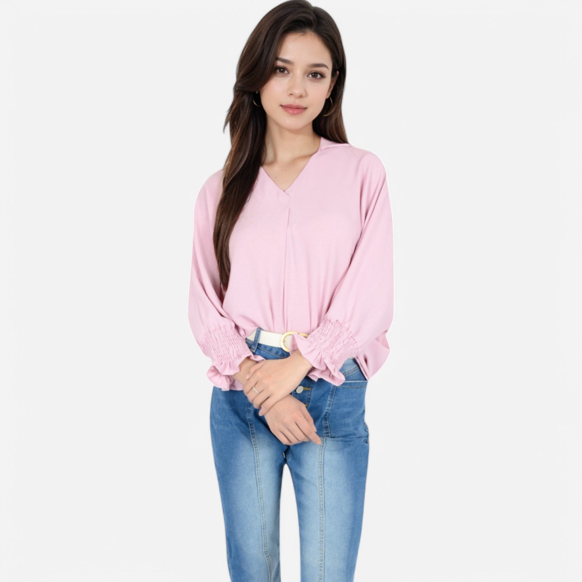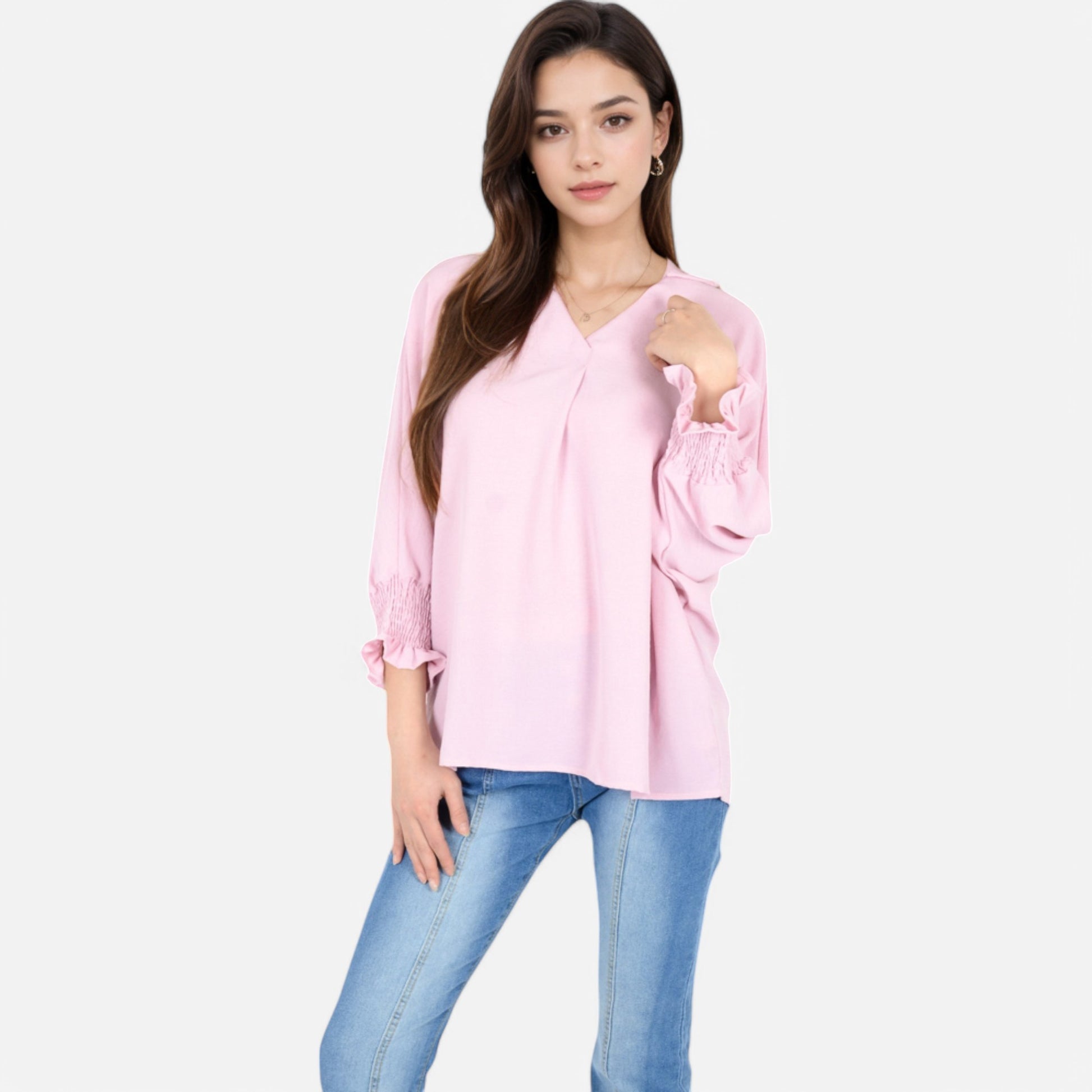 V-Neck Blouse with 3/4 Lantern Sleeves and Ruffle Cuffs