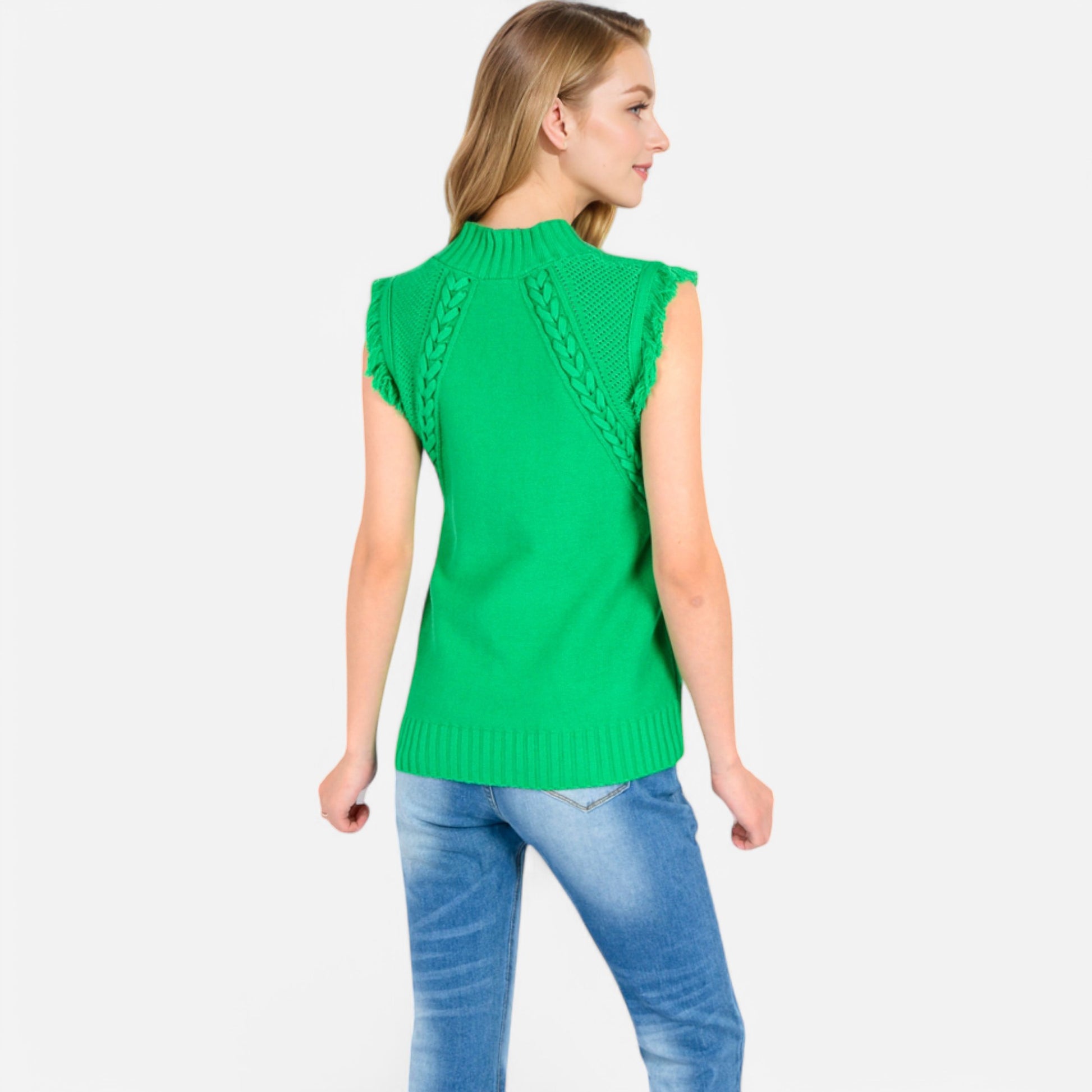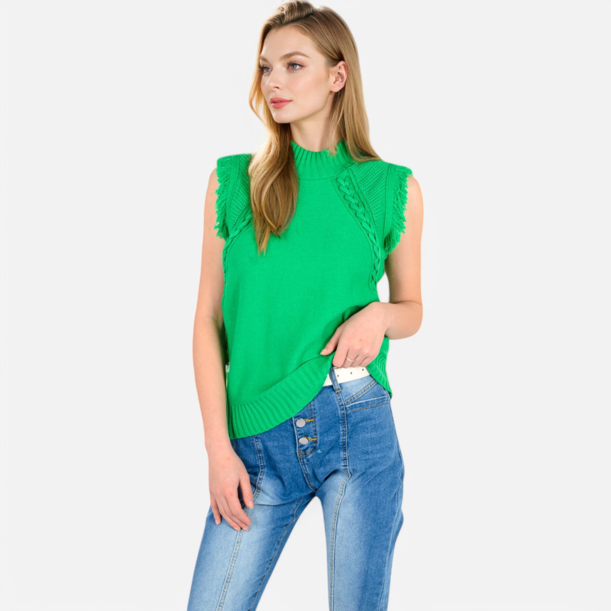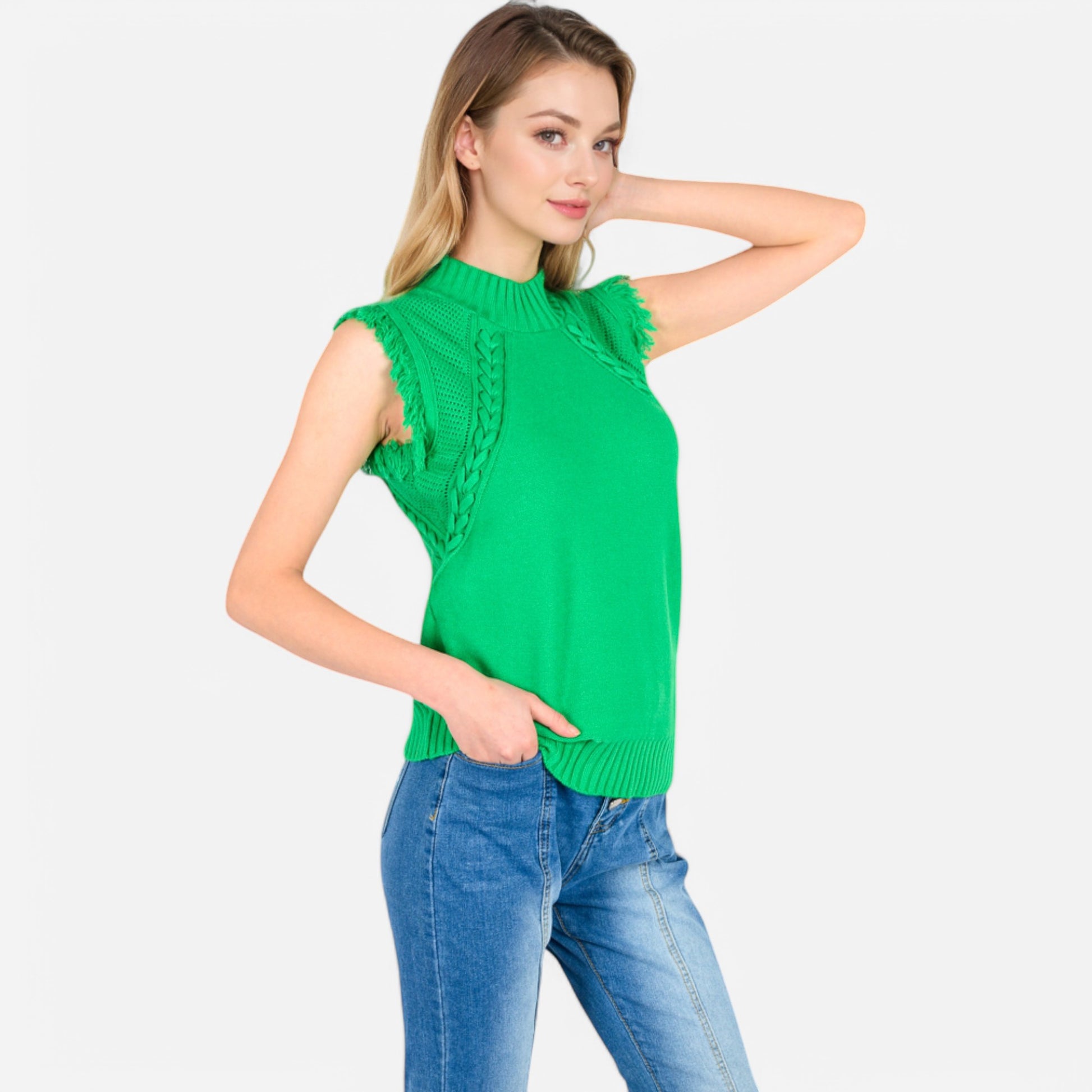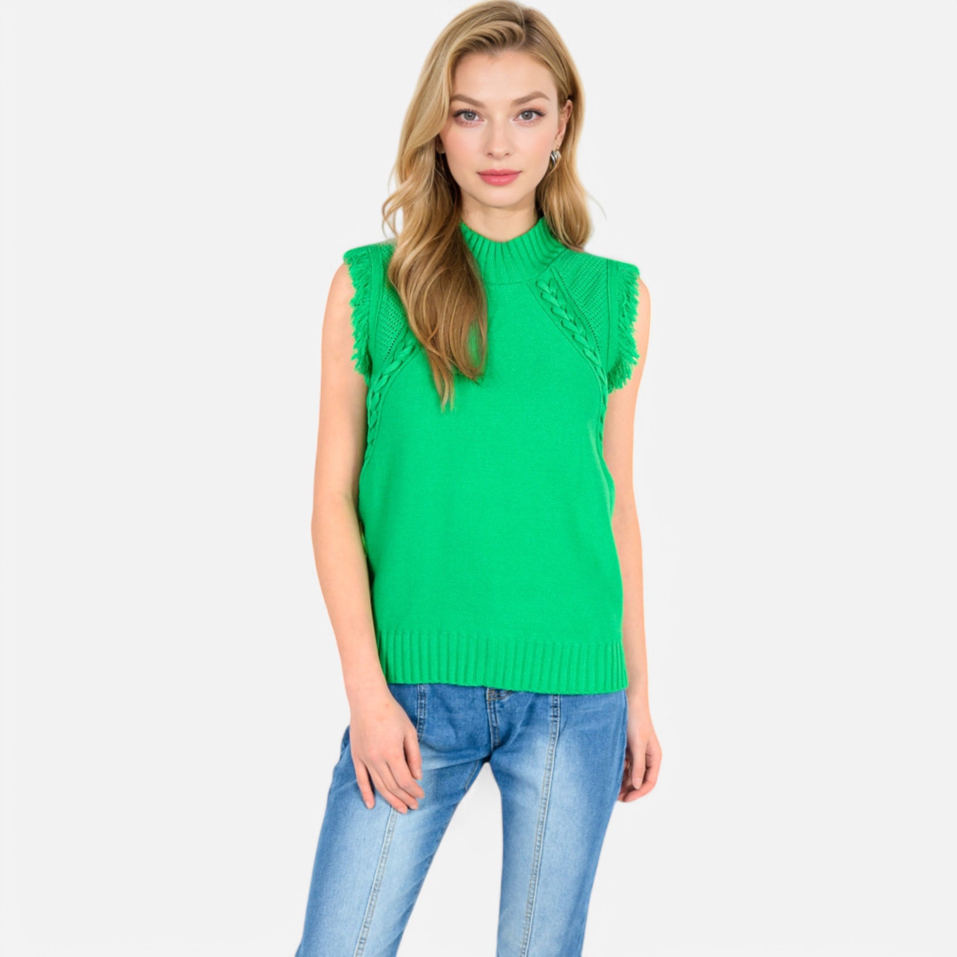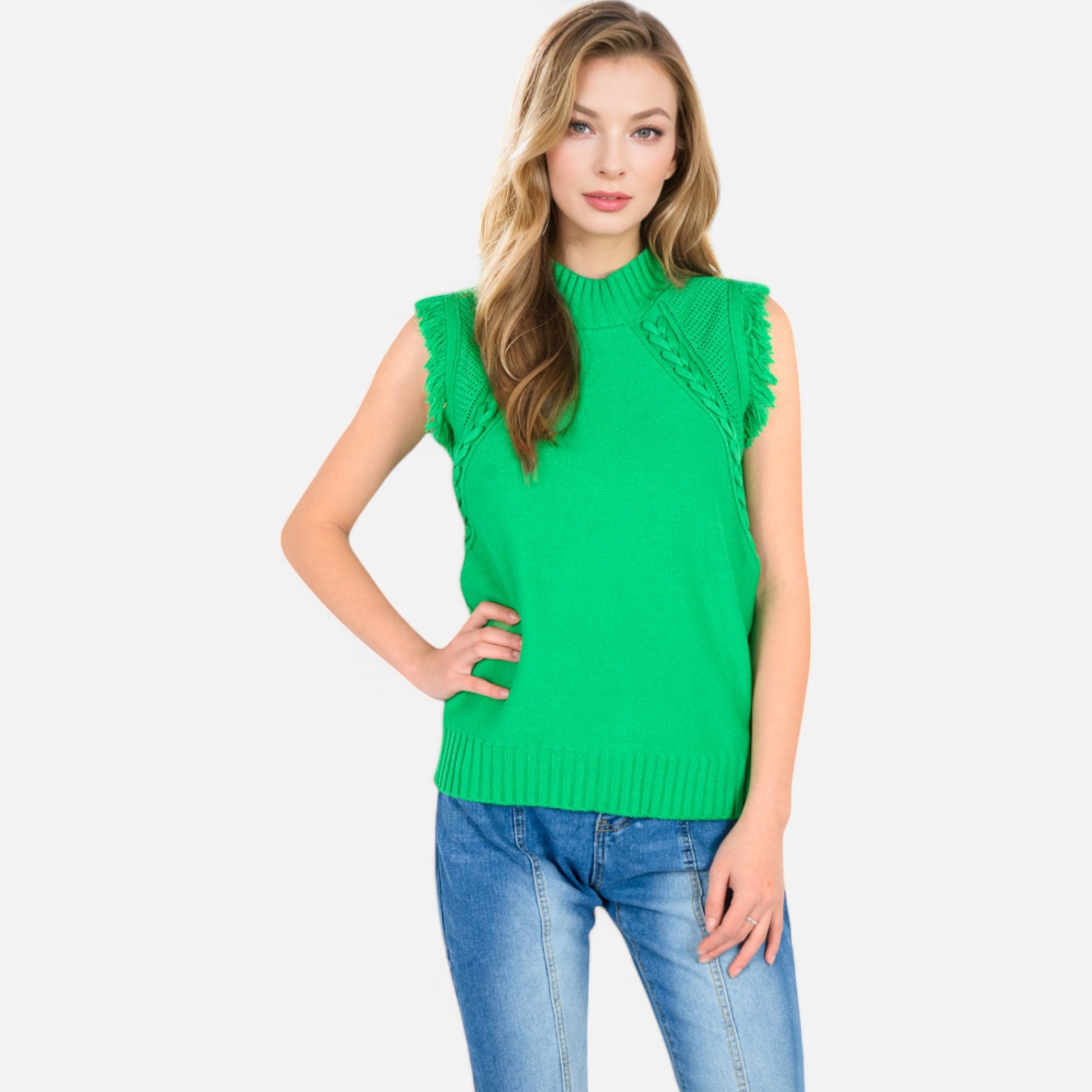 The Anna-Kaci Women's Sleeveless Knit Sweater Top blends effortless style with unique fringe detailing. Crafted from a soft, textured knit fabric, this top features a high mock neckline and braided accents along the shoulders, leading to playful fringe trim. The fitted silhouette adds a polished touch, making it perfect for layering or wearing on its own. Style it with denim and statement jewelry for a chic, fashion-forward look.