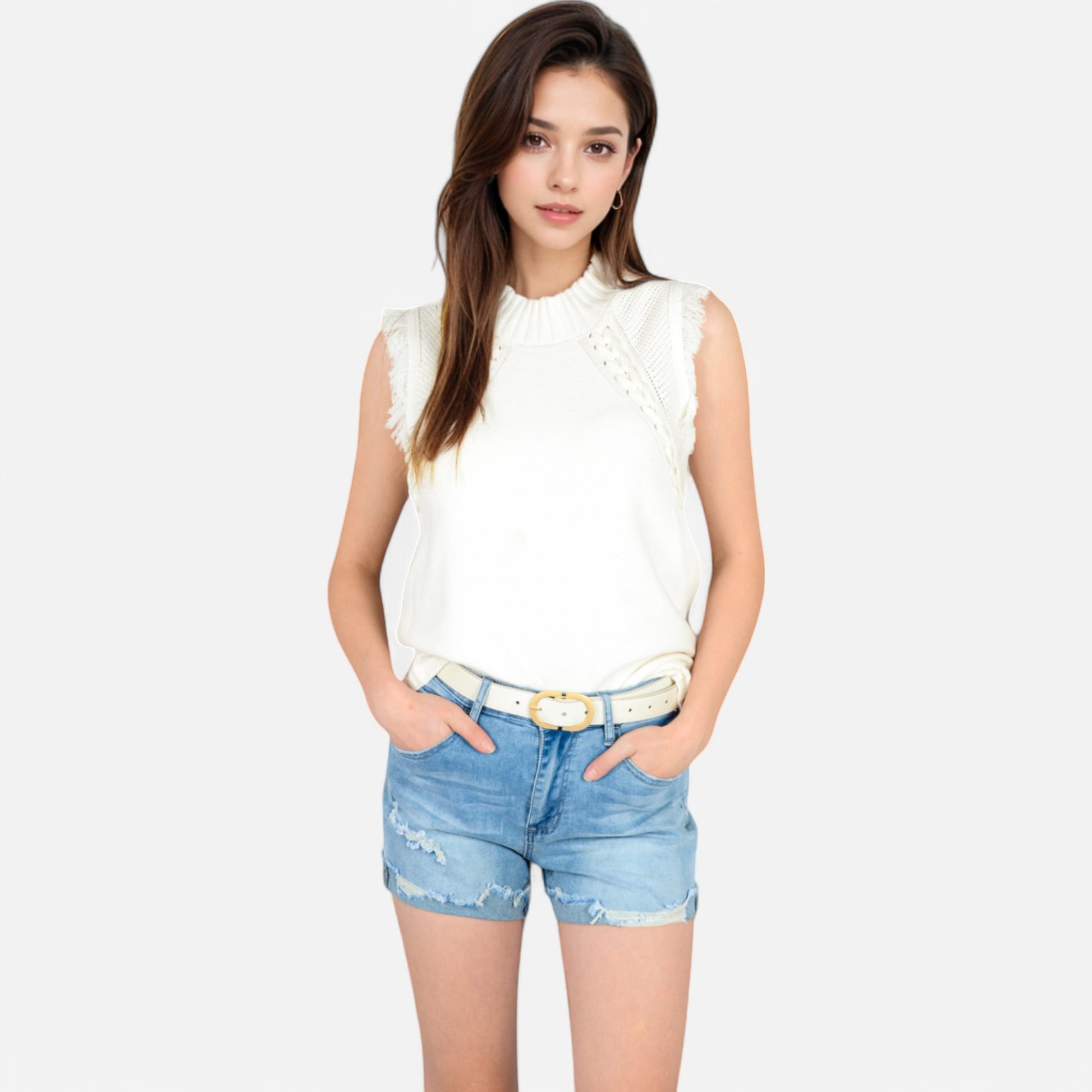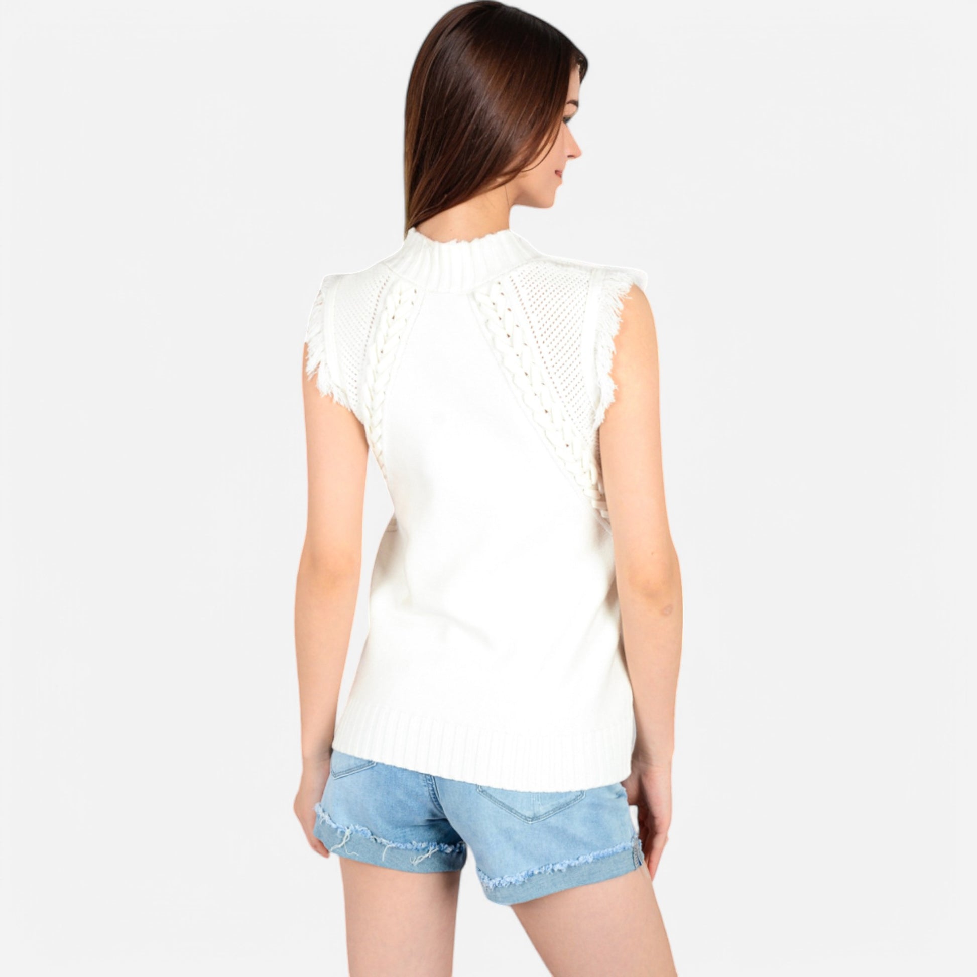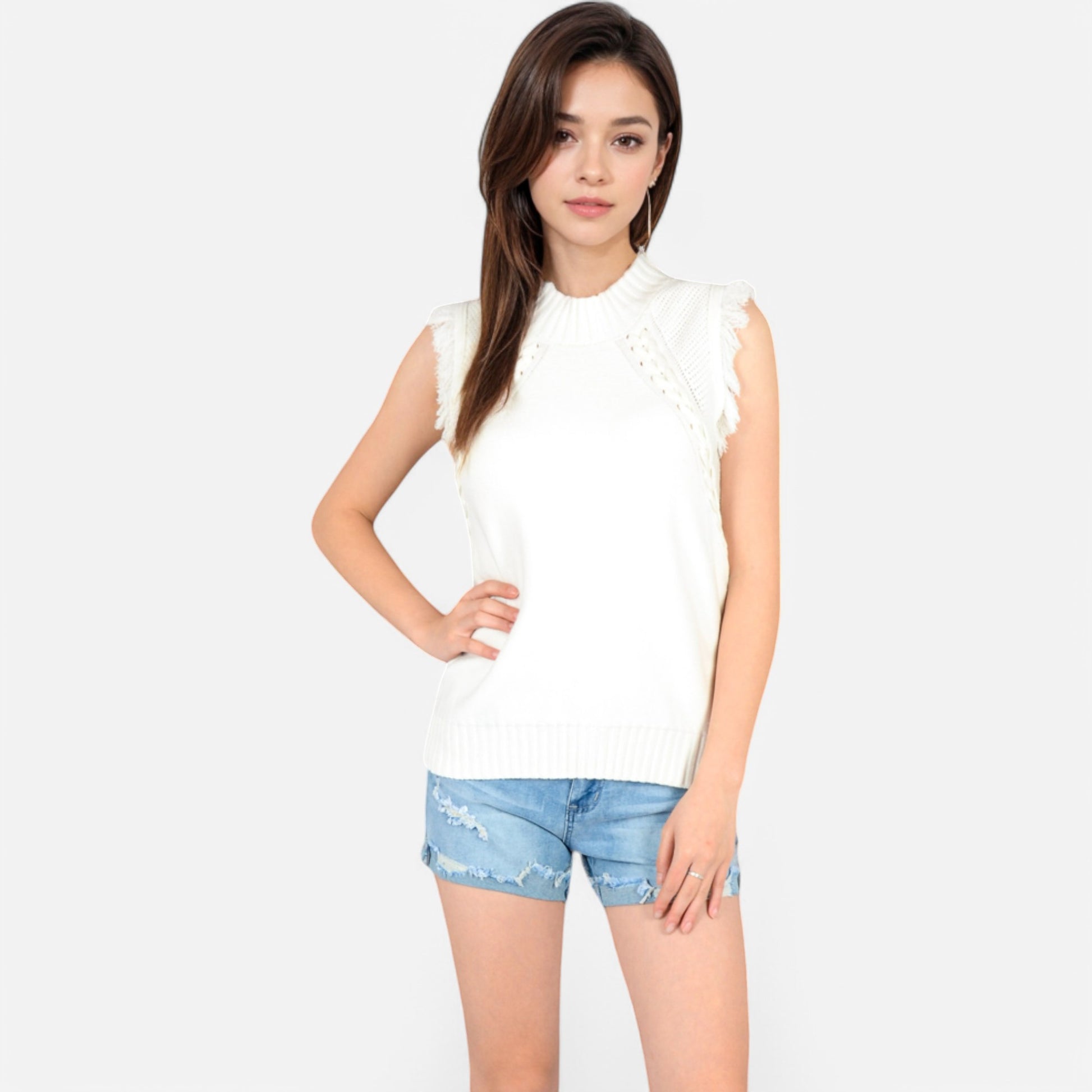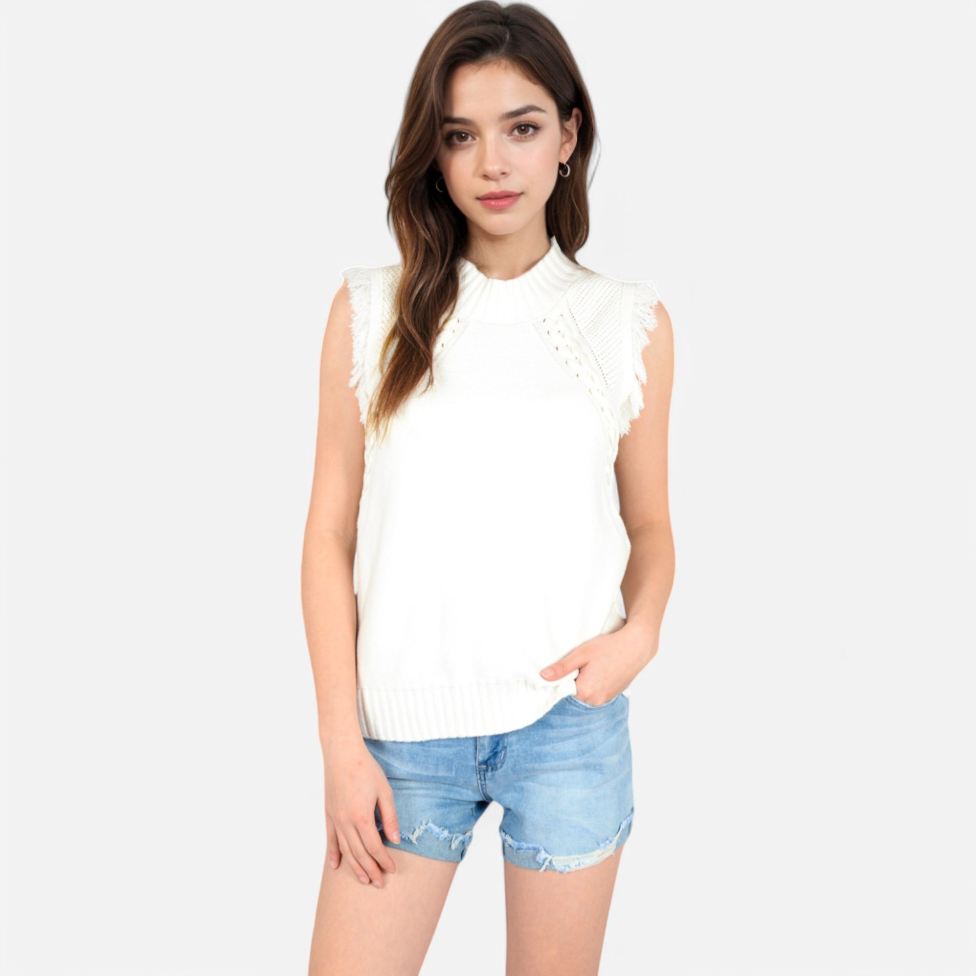Women's Sleeveless Knit Sweater Top with Fringe Shoulder Detail