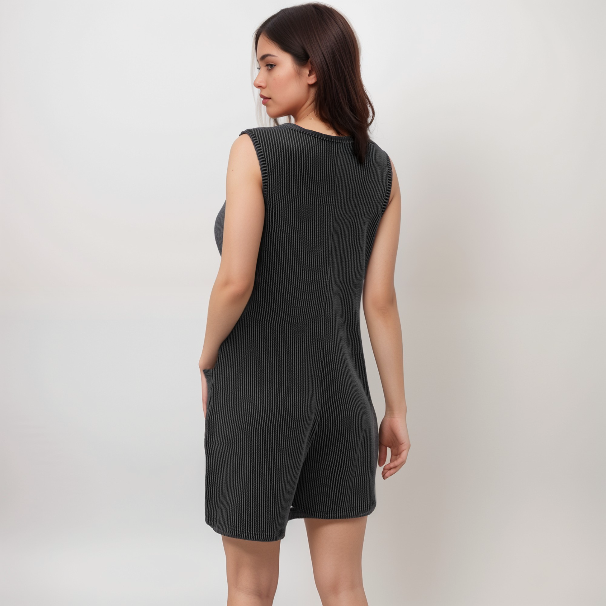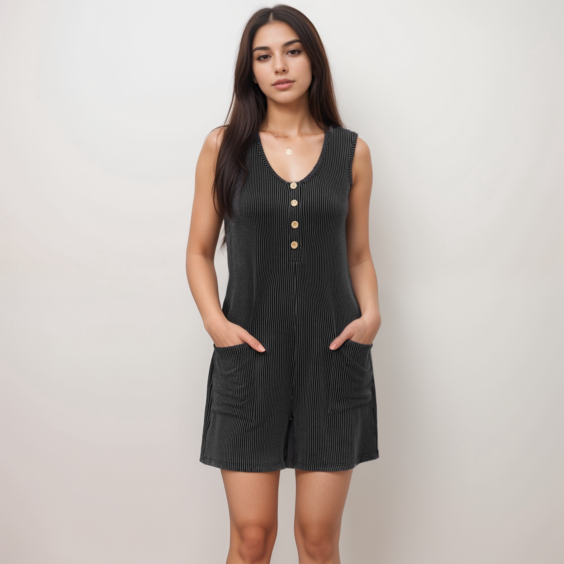 Women's Textured Knit Sleeveless Romper with Button Front Detail and Side Pockets