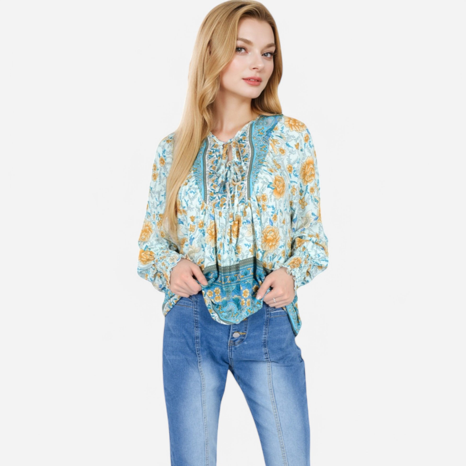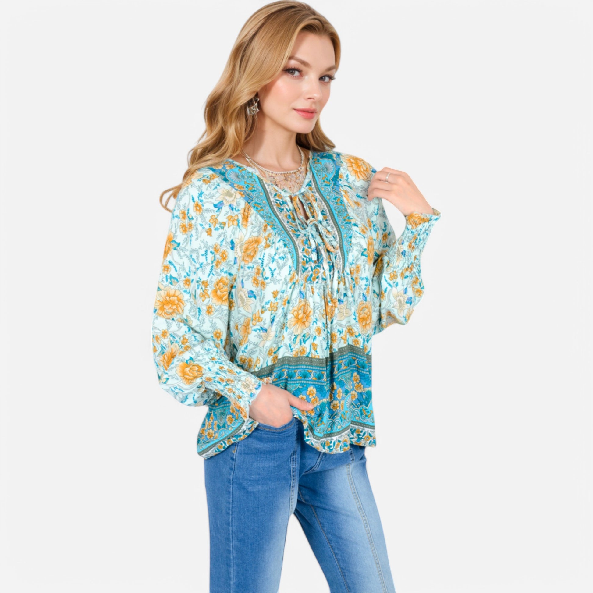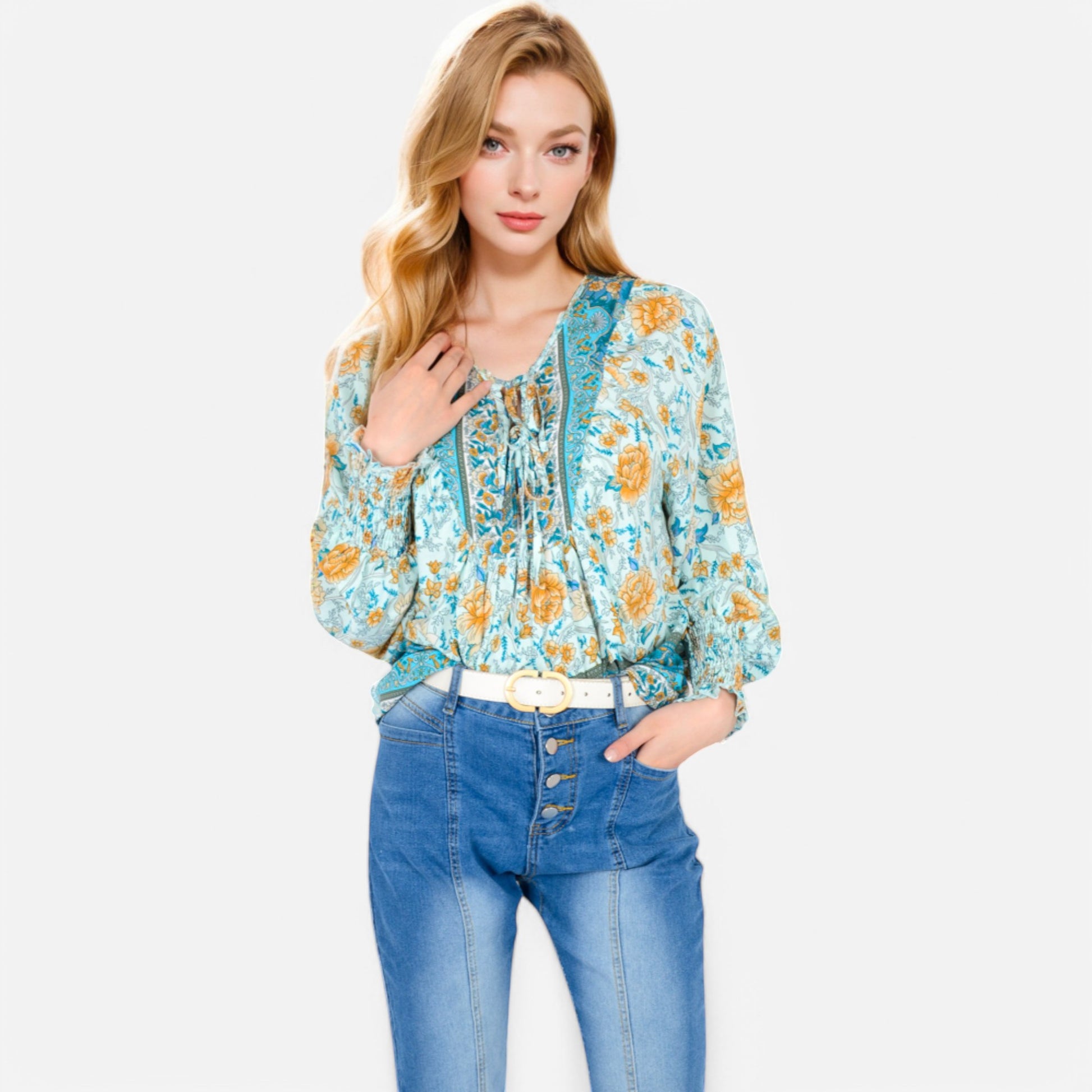 Women's Floral Boho Peasant Blouse with Long Sleeves and Tassel Tie