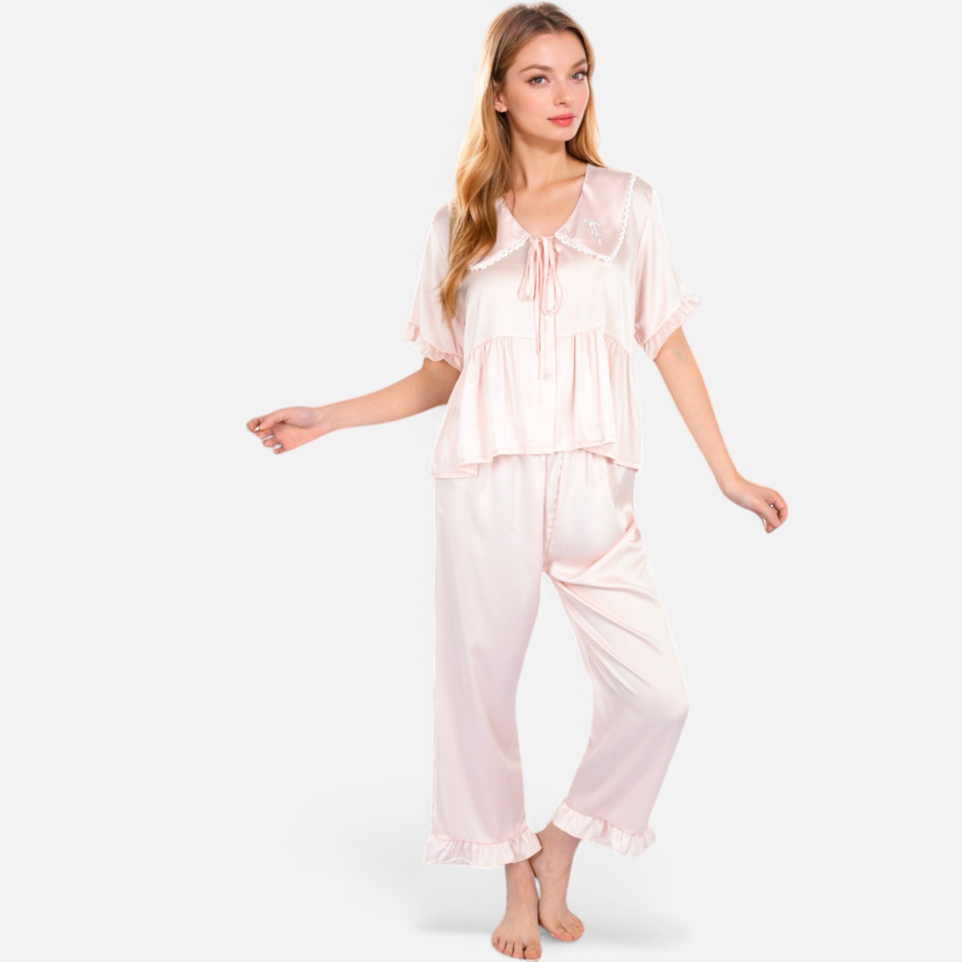 The Anna-Kaci Women's Embroidered Collar Pajama Set blends elegance and comfort for a luxurious loungewear experience. The set includes a relaxed-fit button-up top with a charming scalloped embroidered collar and flutter sleeves. The matching wide-leg pants feature ruffle trim at the hem for a delicate, feminine touch. Made from a soft and breathable fabric, this pajama set is perfect for relaxing in style at home.