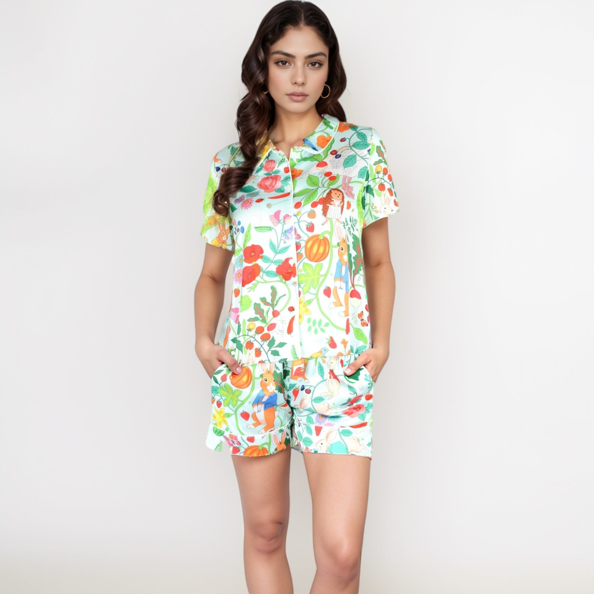 The Anna-Kaci Women's Whimsical Garden Animal Print Pajama Set is bursting with playful charm. This short sleeve button-up top pairs with matching shorts, both adorned in a colorful garden scene filled with rabbits, florals, and fresh produce. Crafted from lightweight satin fabric, it offers a smooth, breathable feel for all-night comfort.