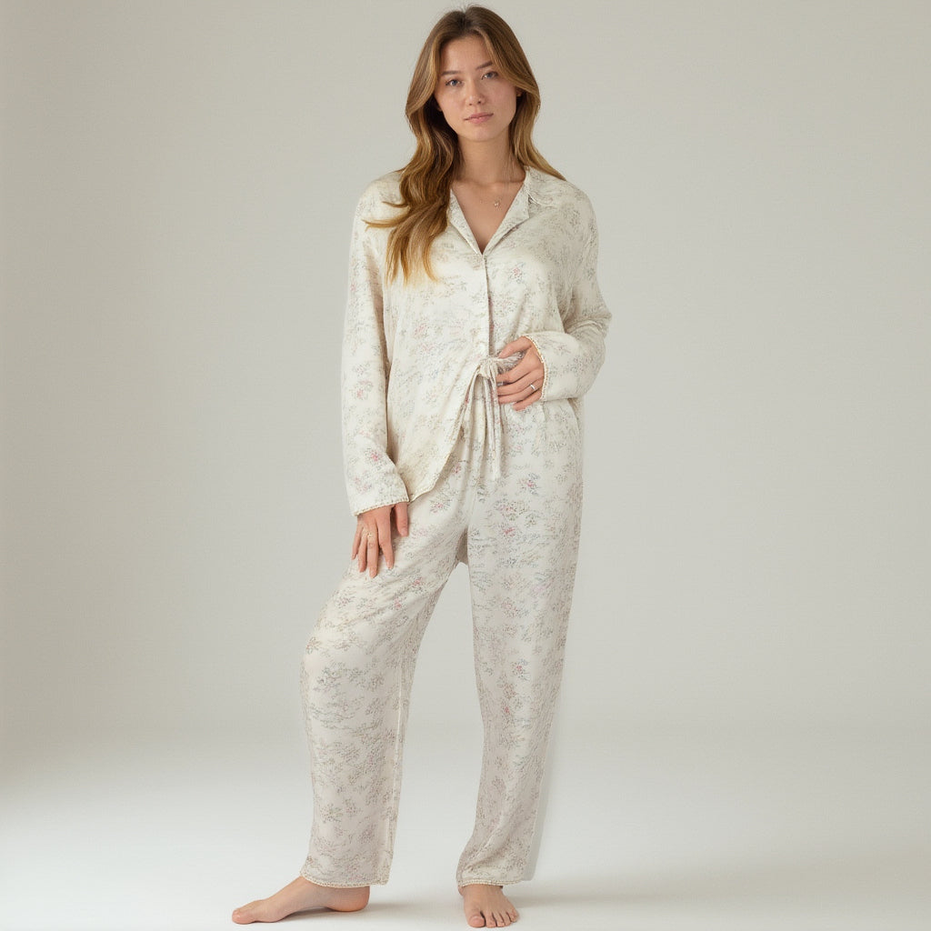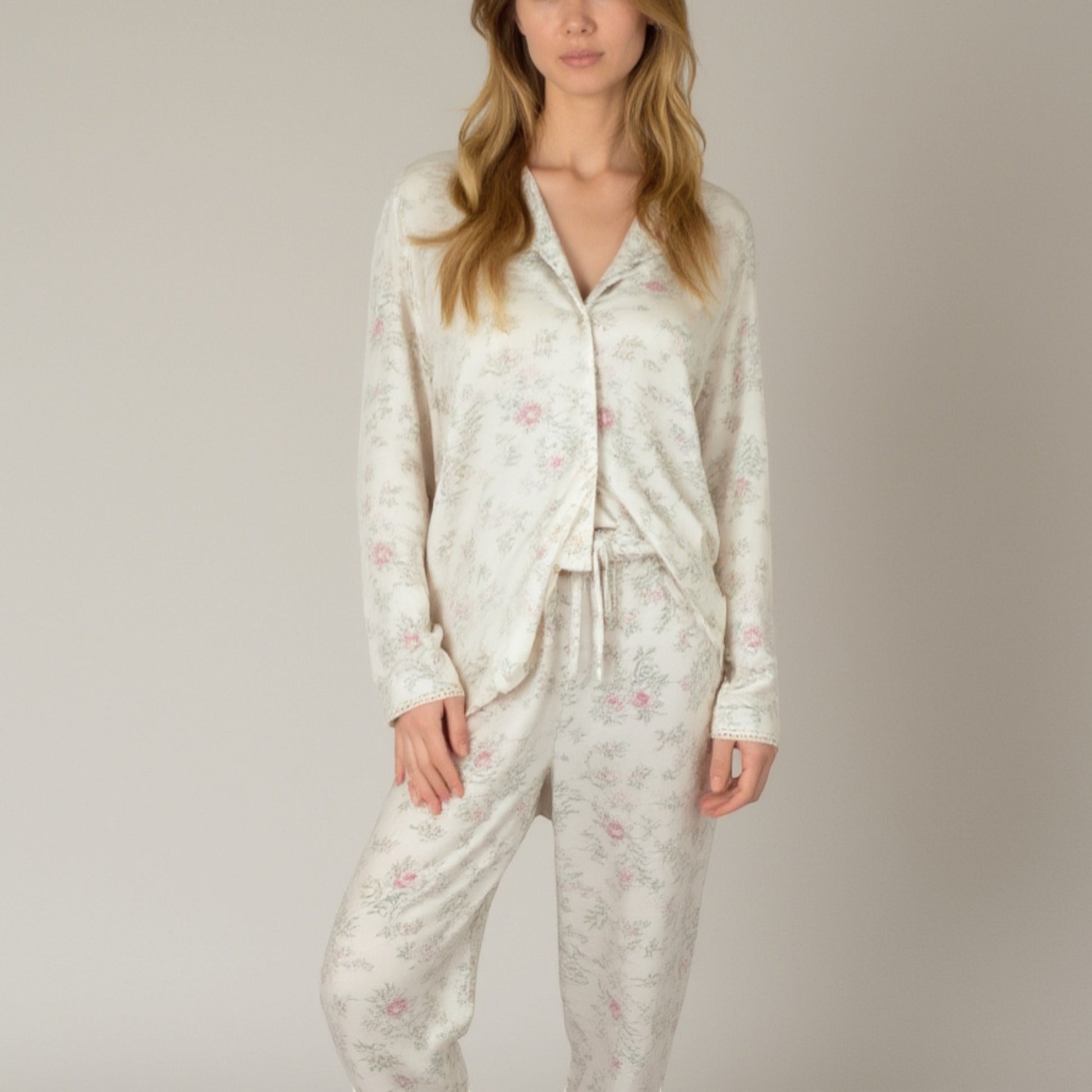 Lounge Women's Soft Brushed Pajama Set with Subtle Floral Print Long Sleeve Button-Up Top and Drawstring Pants