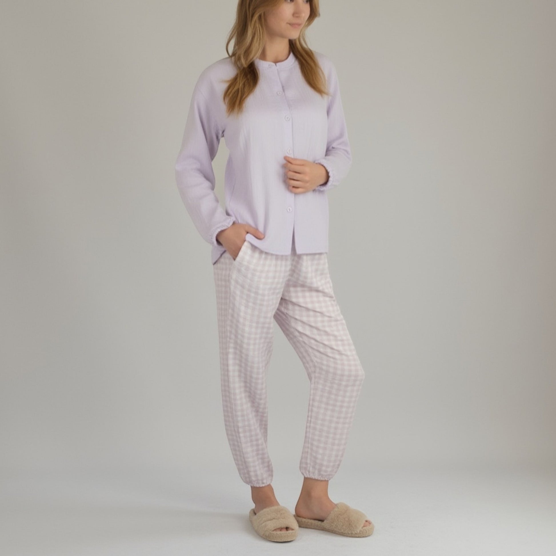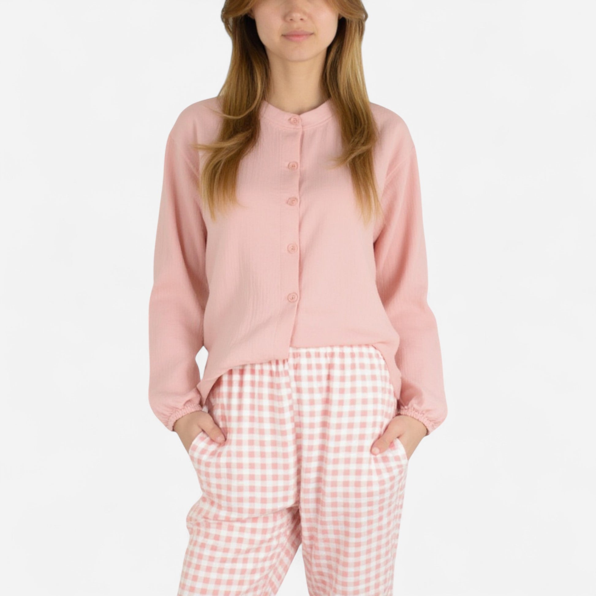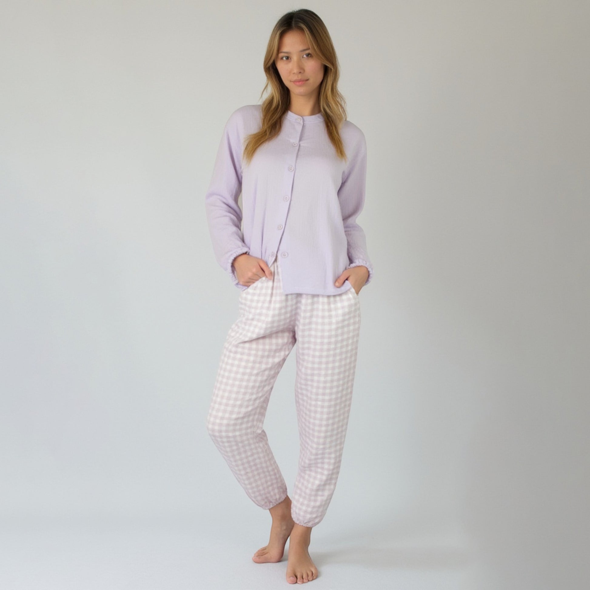 Woven Pajama Set with Long Sleeve Button-Up Top Elastic Cuff Sleeves and Relaxed Gingham Print Lounge Pants