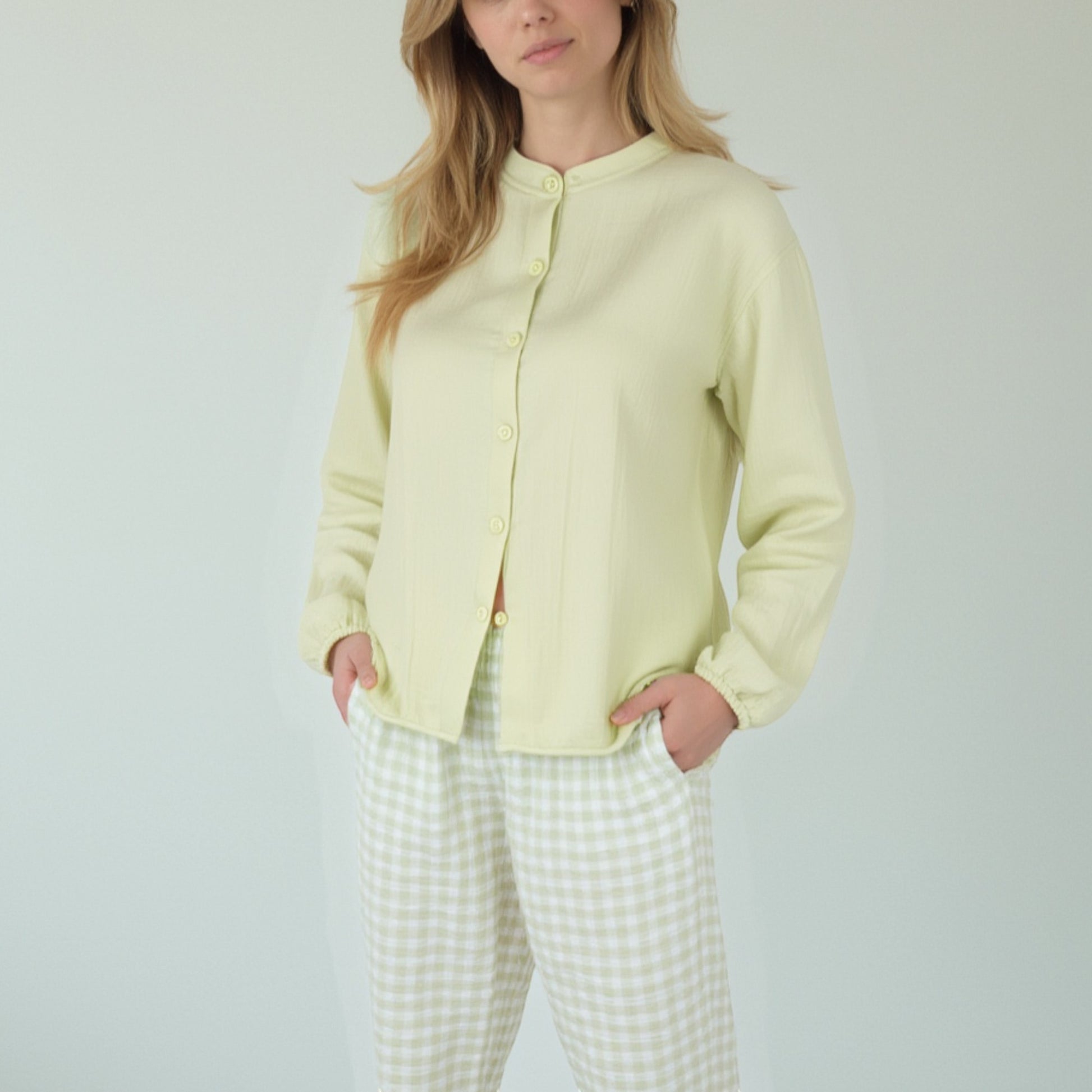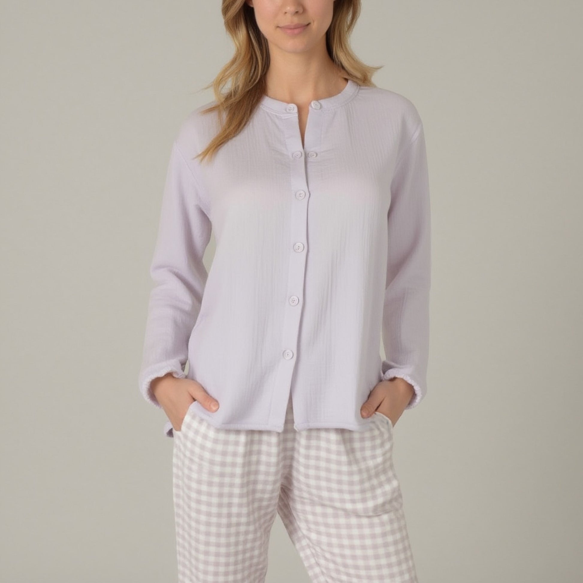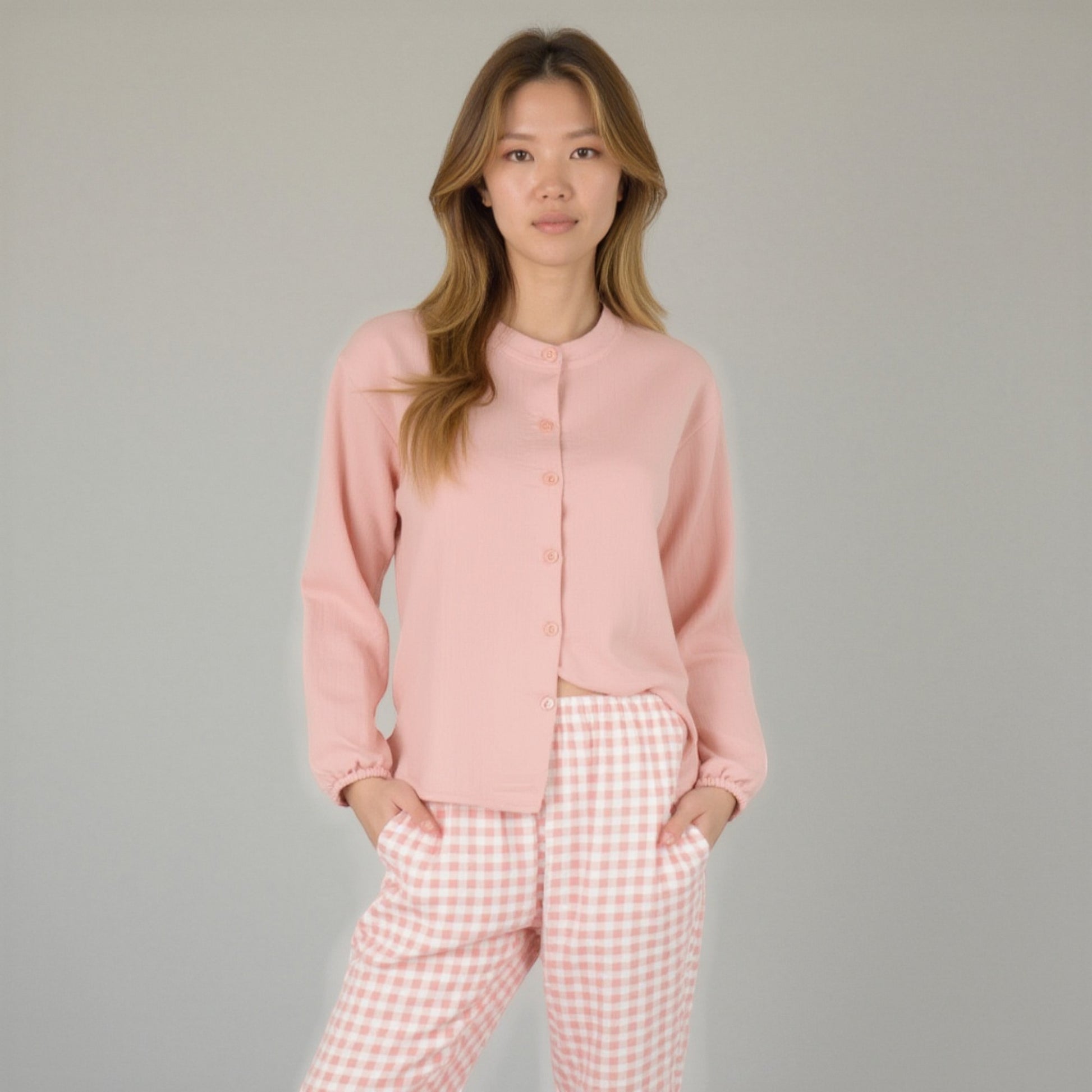 Woven Pajama Set with Long Sleeve Button-Up Top Elastic Cuff Sleeves and Relaxed Gingham Print Lounge Pants