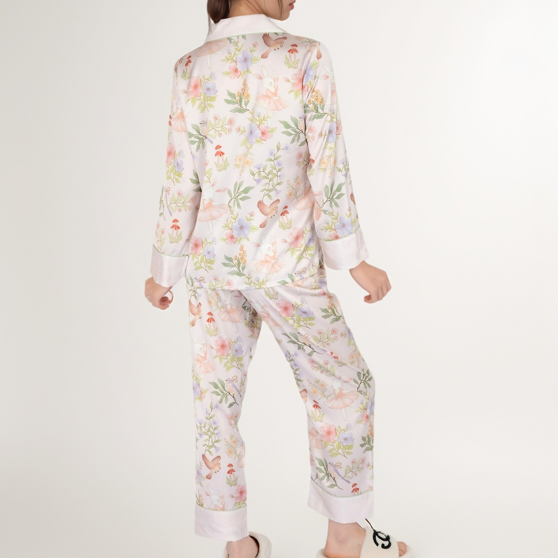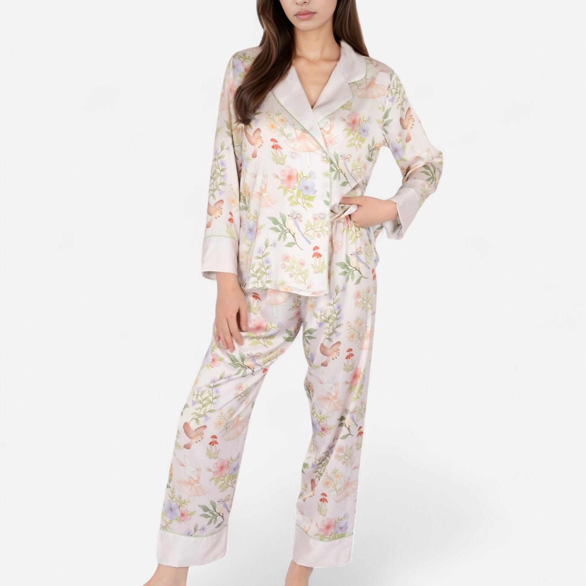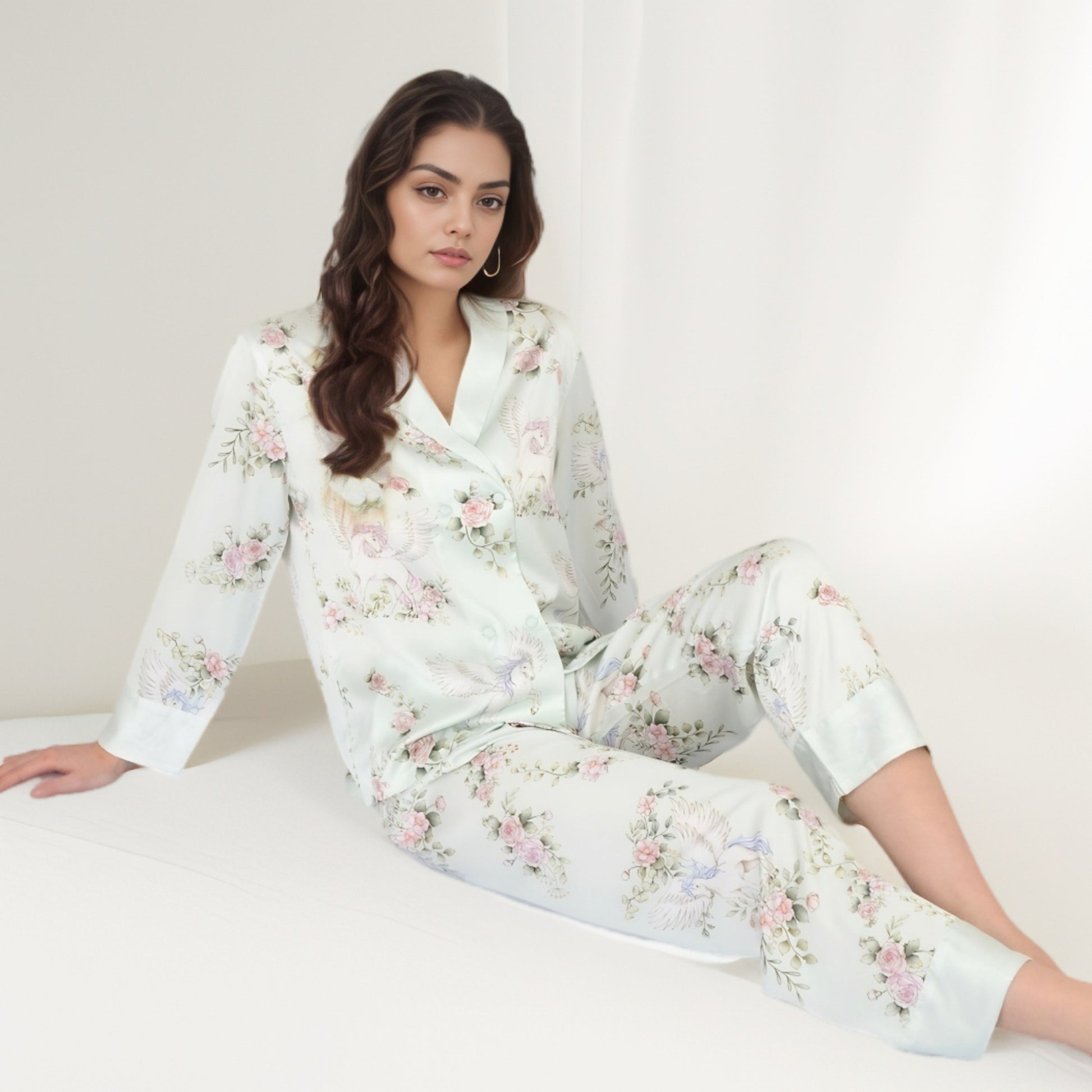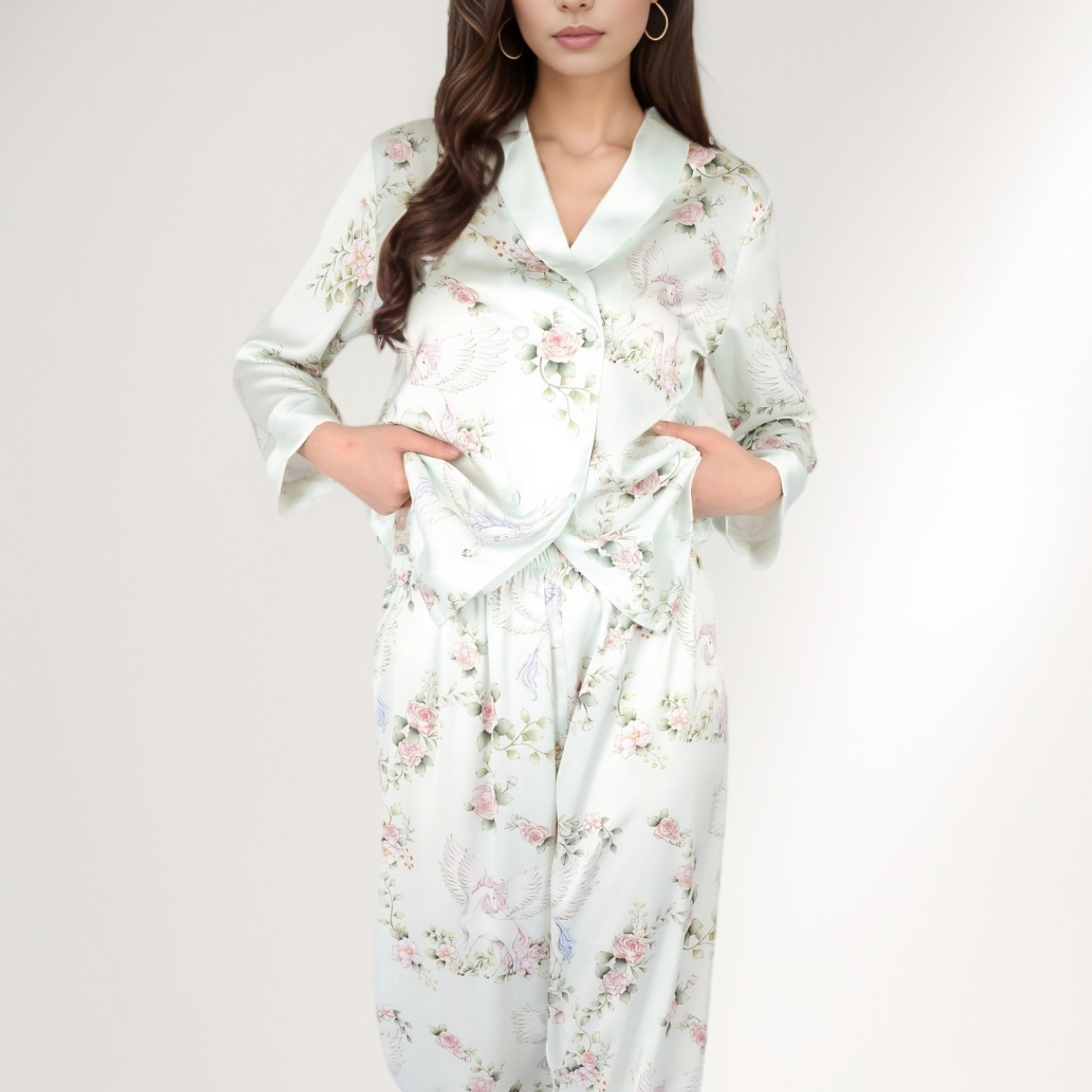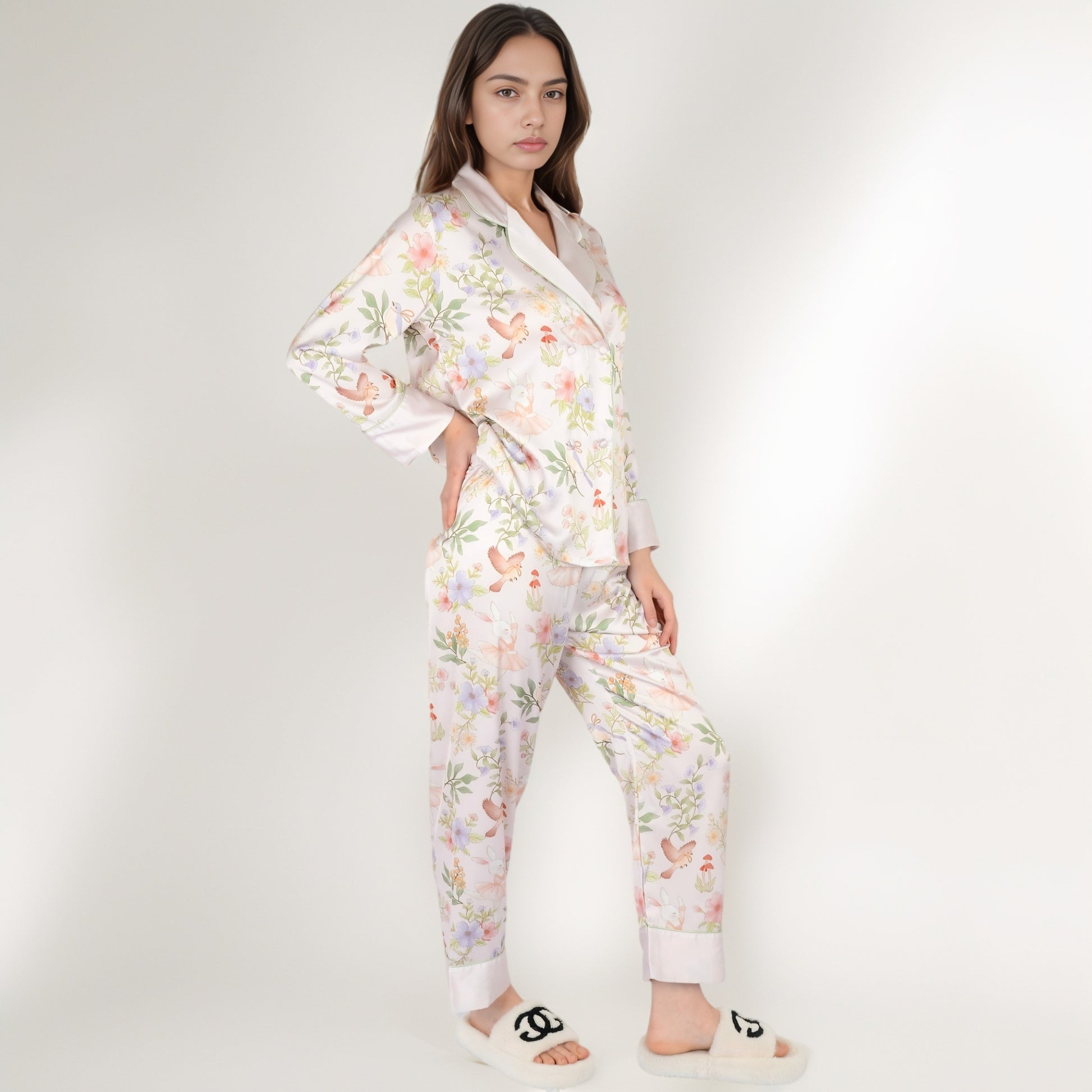 Satin Floral Pajama Set with Long Sleeve Notched Collar Button-Up Top and Relaxed Fit Full-Length Pants