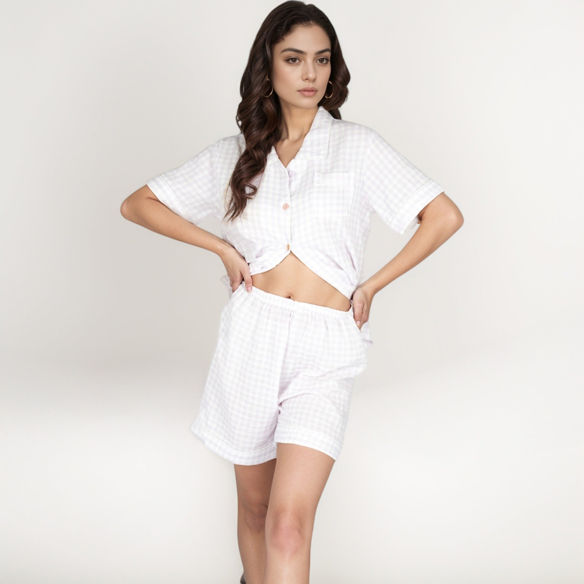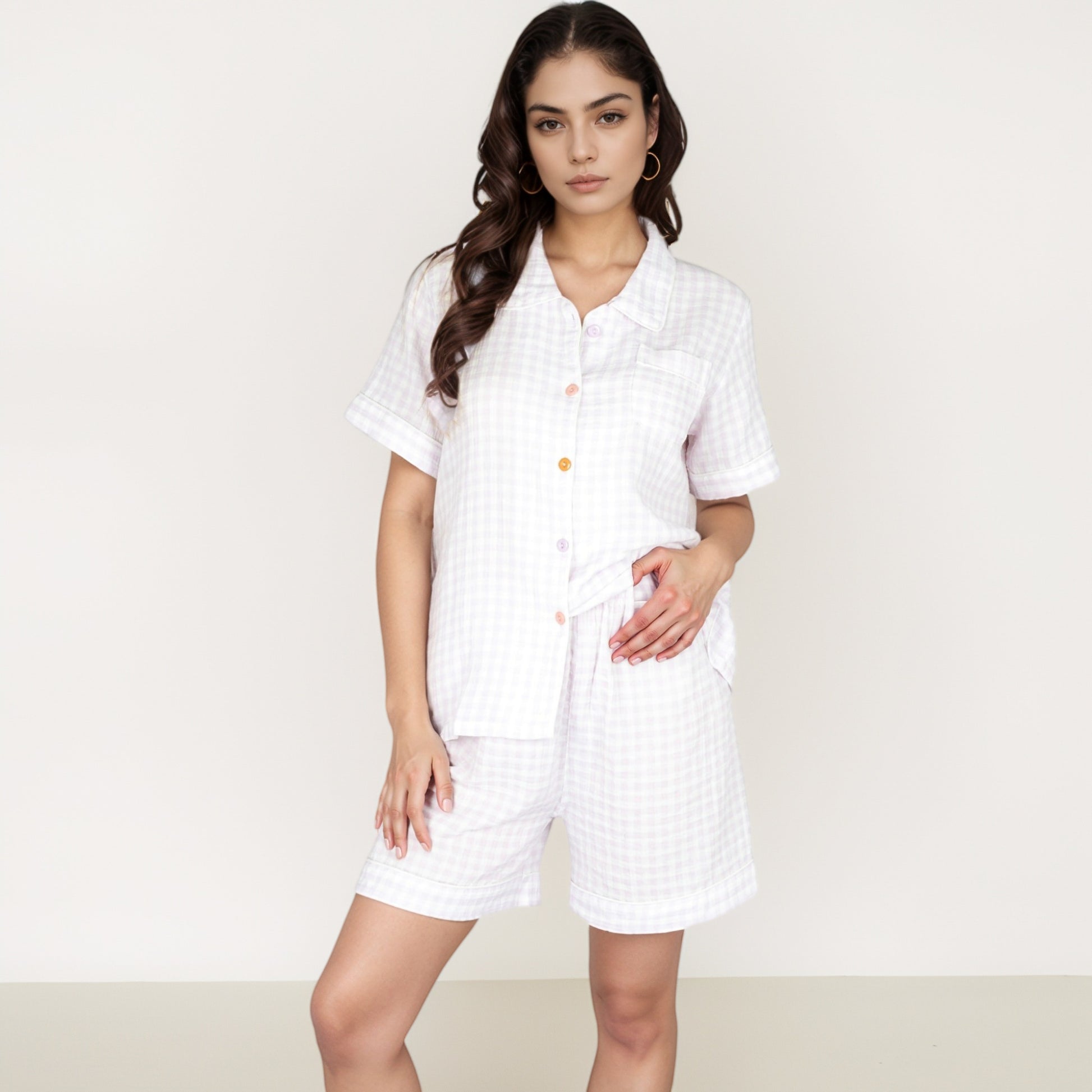 Gingham Short Sleeve Pajama Set with Contrast Buttons and Matching Shorts