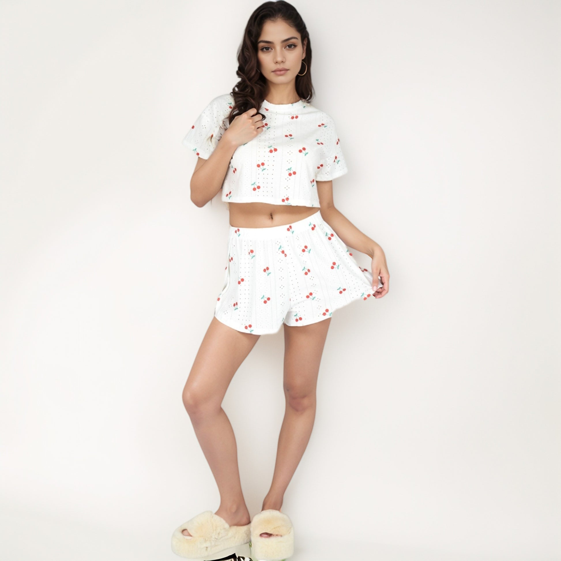 Cherry Print Pajama Set with Cropped Short Sleeve Top and High Waist Relaxed Fit Lounge Shorts
