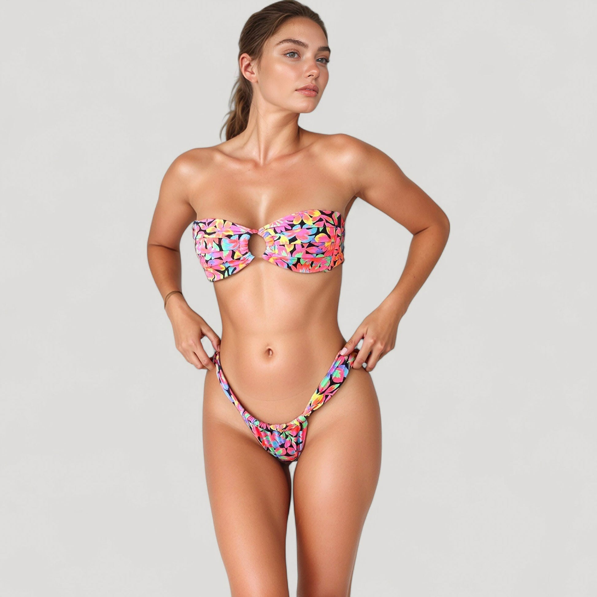 The Anna-Kaci Women's Bandeau Bikini Set features a standout checkered texture and a sleek bandeau top with a center keyhole ring accent. The top provides a secure, strapless fit while the matching high-leg bikini bottoms offer a flattering silhouette. Made from stretchy, textured swim fabric, this bikini ensures comfort and a bold, modern look. Perfect for those who prefer a clean and minimal beach-ready style.