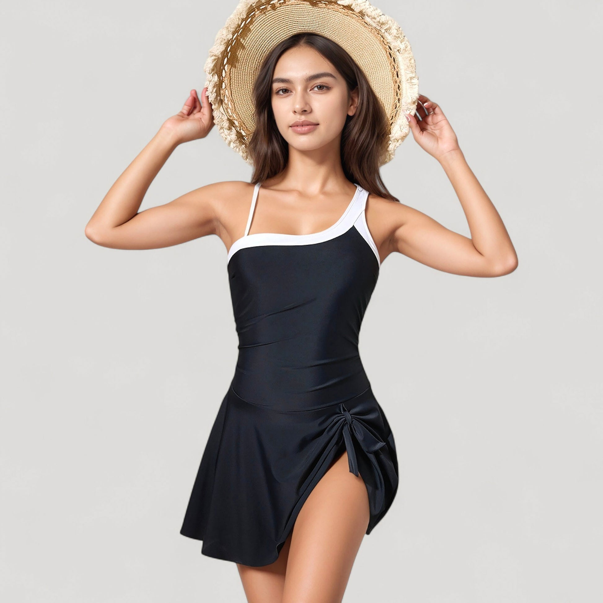 One Shoulder Swim Dress with Contrast Trim and Side Tie Detail