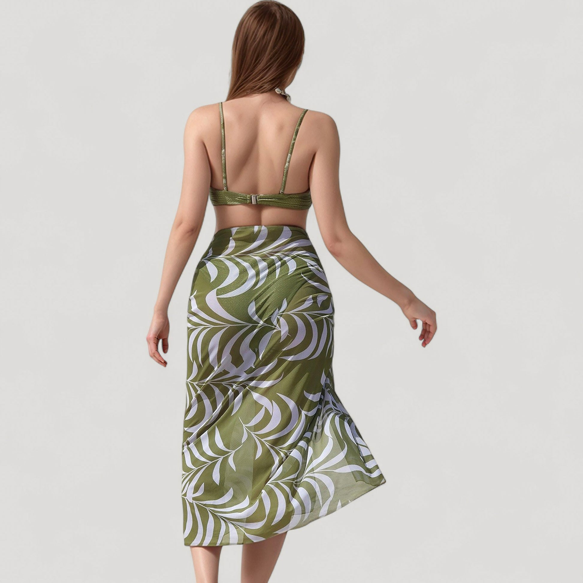Ring Front Bikini Top with Adjustable Straps and Tropical Leaf Print Sarong Cover-Up Skirt
