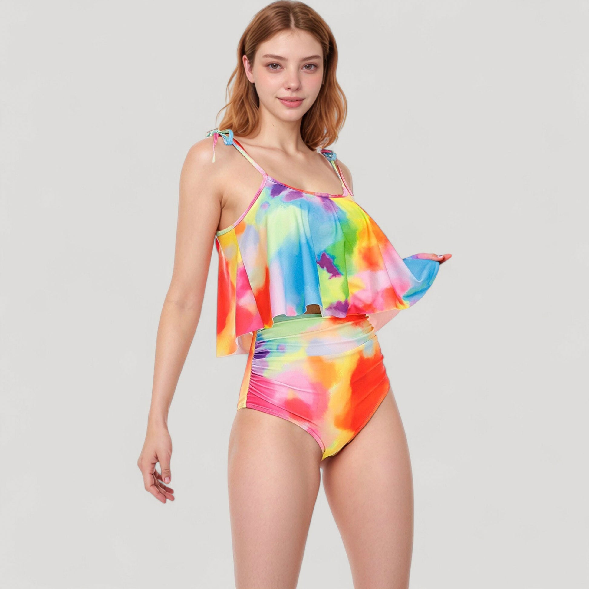 This tankini swimsuit features a relaxed-fit top with a scoop neckline and a high waist bottom with a vibrant tropical print. The flowy design of the top adds flattering coverage while allowing freedom of movement. Adjustable straps provide a personalized fit and added support. A stylish and comfortable option for enjoying the sun with confidence.