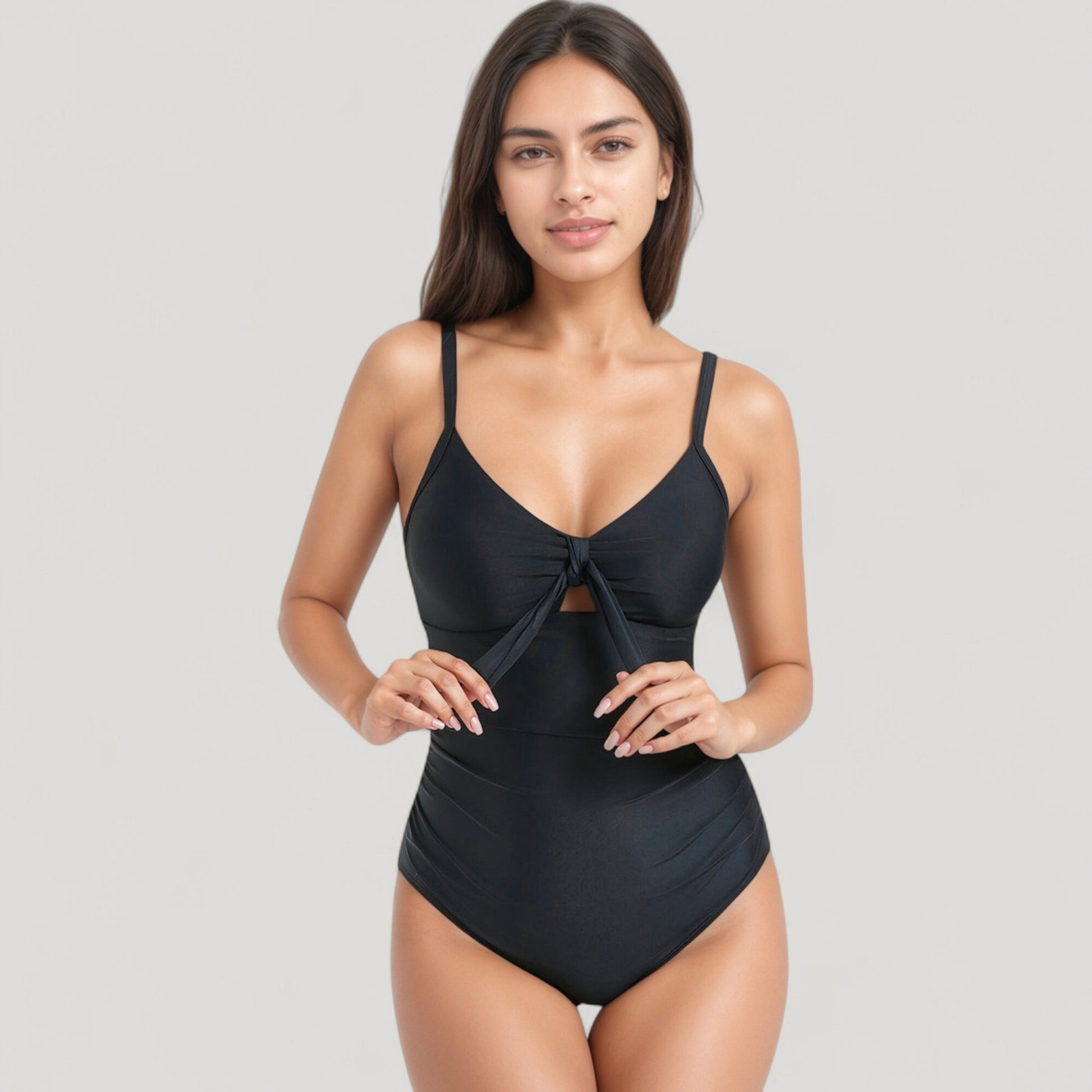 This elegant one piece swimsuit features a flattering V-neckline and a charming front tie that adds a stylish touch to the design. The subtle ruching along the torso helps shape and smooth the waistline, creating a streamlined silhouette. With adjustable shoulder straps and soft stretch fabric, this swimsuit ensures both comfort and support. Ideal for modern, confident swimwear looks that combine simplicity with sophistication.