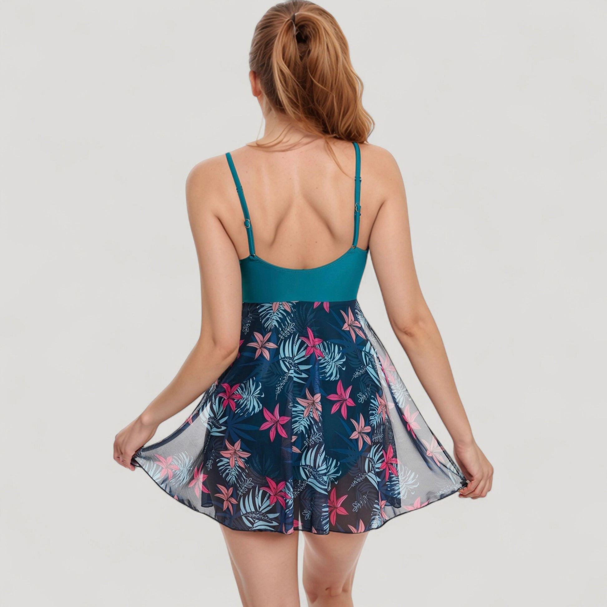 This stylish one piece swim dress features a flattering twist-front bodice and a keyhole cutout at the center for added detail. The flowy sheer mesh overlay creates a soft, dress-like silhouette, offering both style and coverage. With adjustable spaghetti straps and built-in bottoms, this swim dress combines comfort and elegance. Perfect for adding a feminine, flirty touch to your swimwear collection.