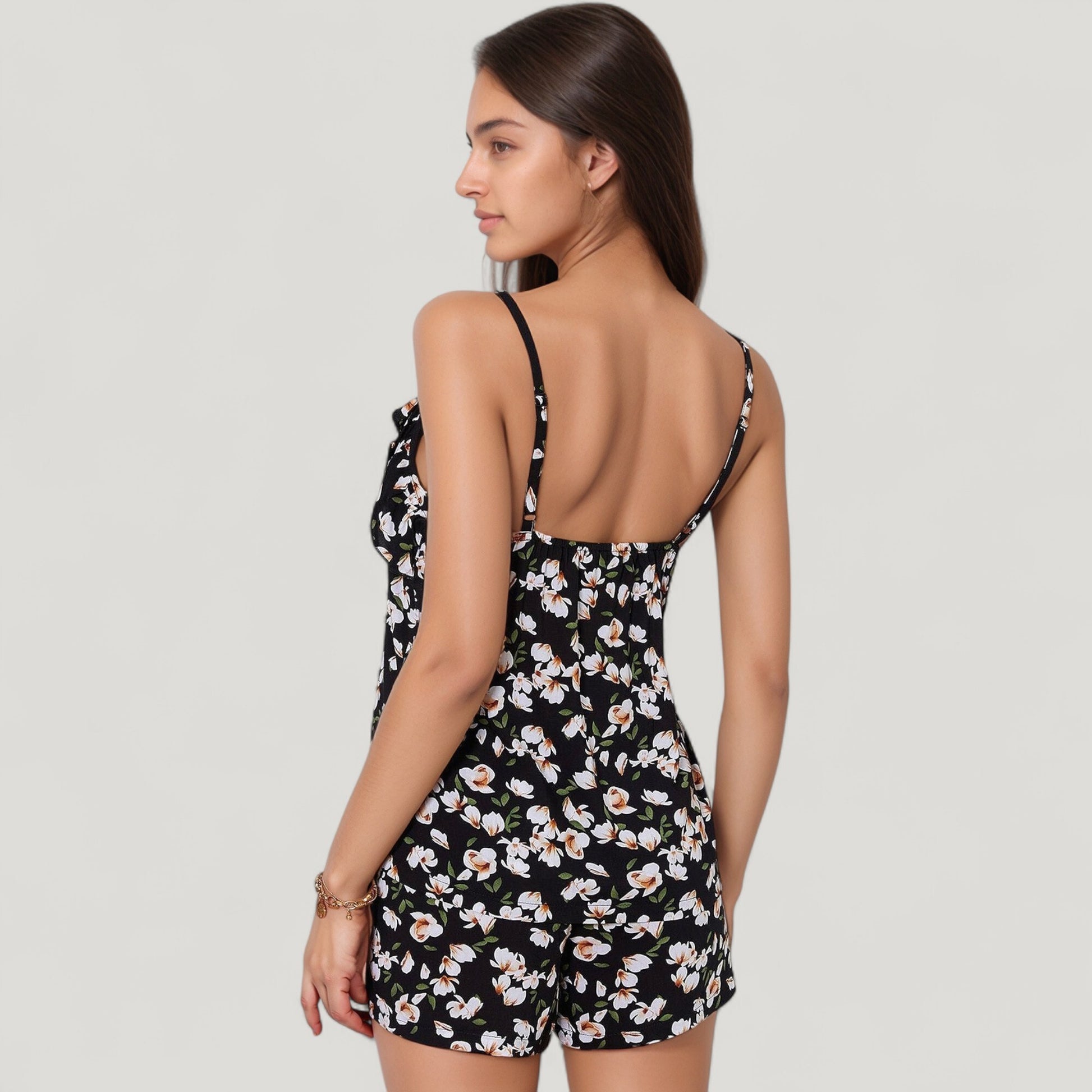 Floral Print Cami Top and Shorts Pajama Set with Adjustable Spaghetti Straps and Front Tie Detail
