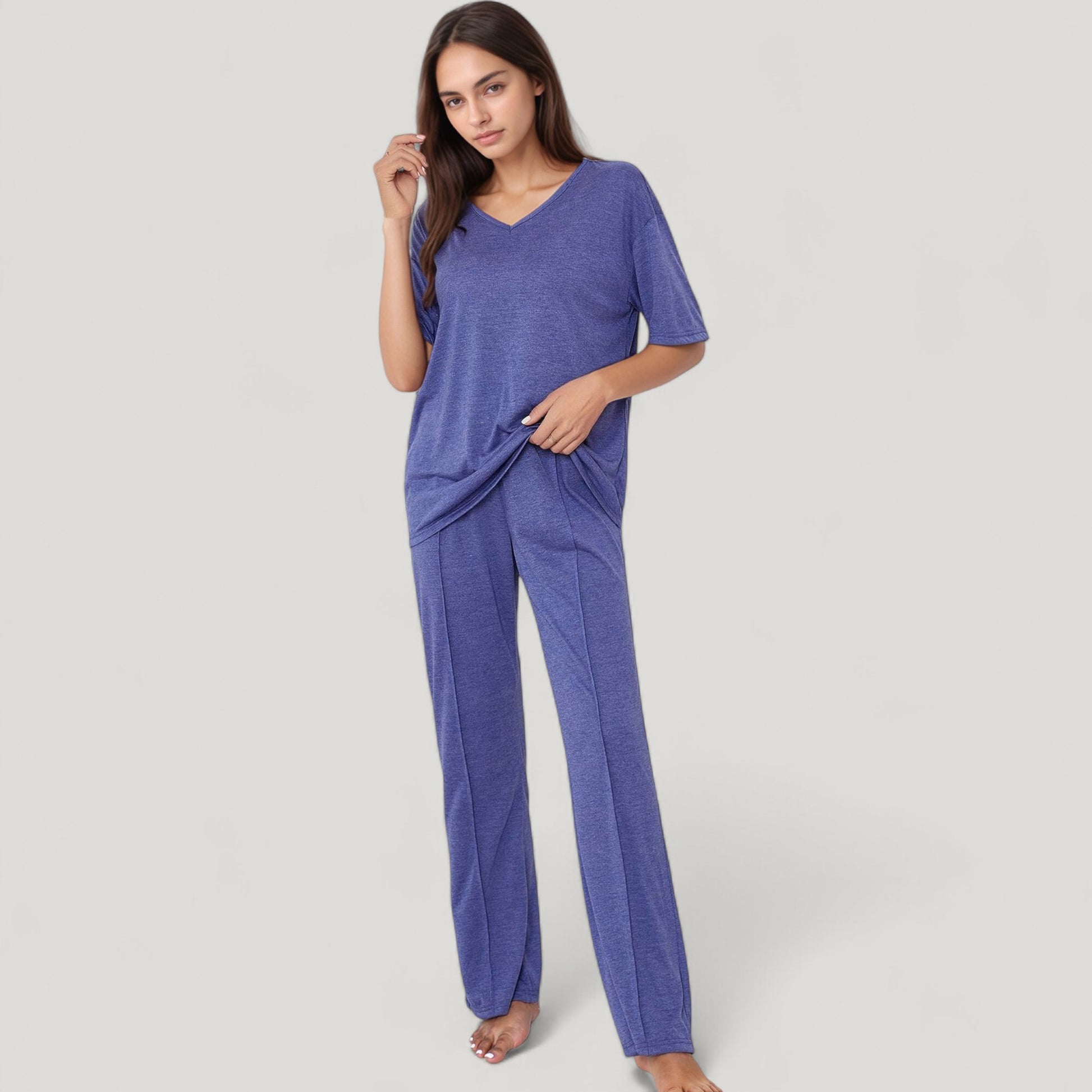 The Anna-Kaci Women's Pajama Set is designed for laid-back comfort with a relaxed silhouette and ultra-soft knit fabric. Featuring a short sleeve V-neck top and matching wide leg pants, this set offers breathable stretch and easy movement. Ideal for restful nights or cozy mornings, the lightweight construction and loose fit keep you feeling cool and comfortable all day long.
