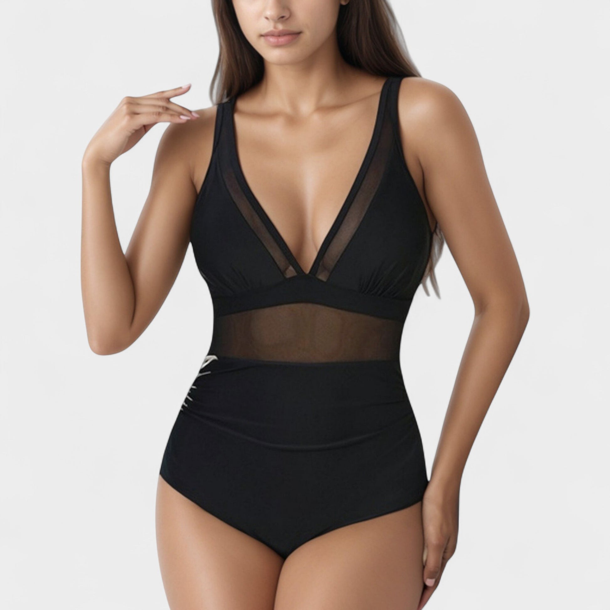 Deep V Mesh Panel One Piece Swimsuit with Sheer Waist Detail and Adjustable Straps