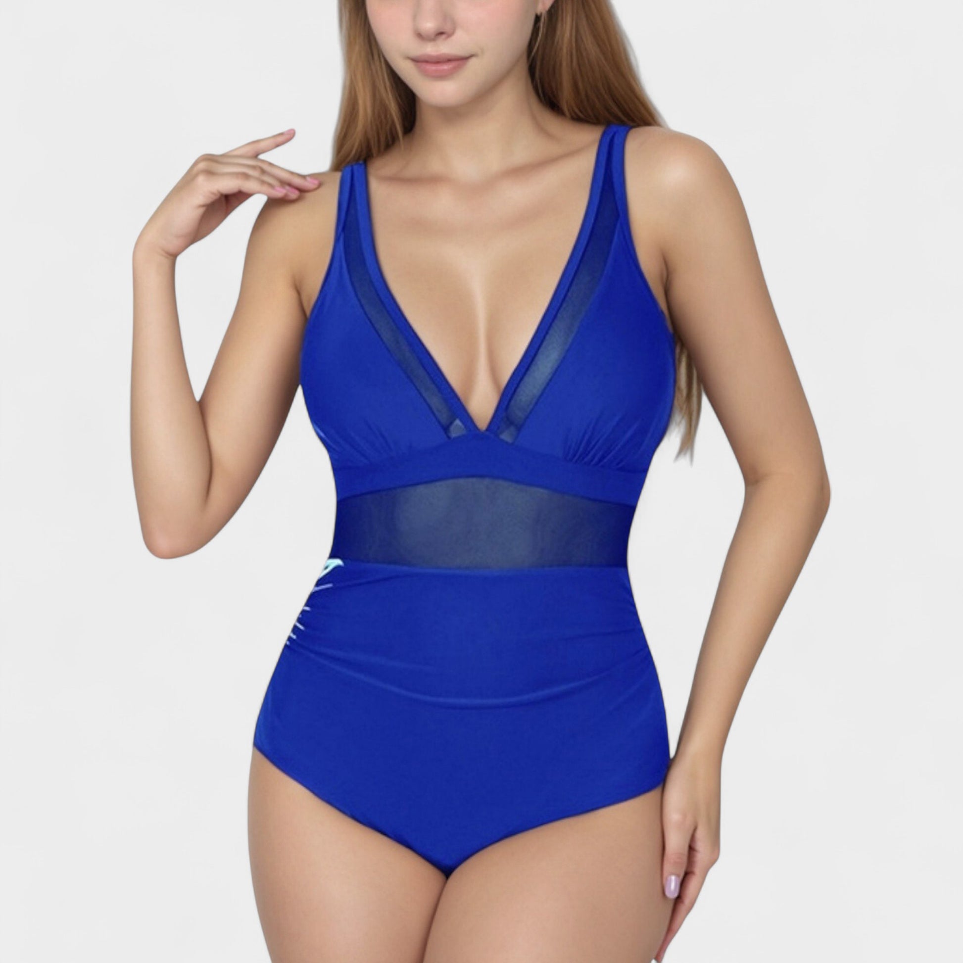 The Anna-Kaci Women's Deep V Mesh Panel One Piece Swimsuit features a plunging neckline with sheer mesh inserts for a sophisticated, modern look. Designed with a transparent waistband for added dimension, this suit combines elegance with a flattering fit. The supportive construction and adjustable straps ensure customizable comfort. Crafted from smooth stretch fabric, this swimsuit hugs your curves and delivers both style and confidence.