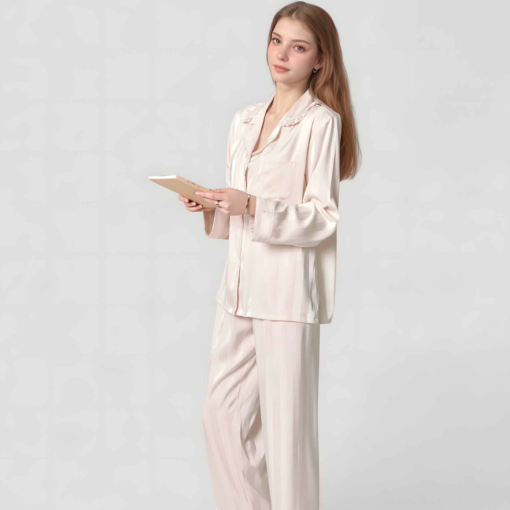 Long Sleeve Button-Down Satin Pajama Top with Ruffle Collar and Wide Leg Pants Sleepwear Set