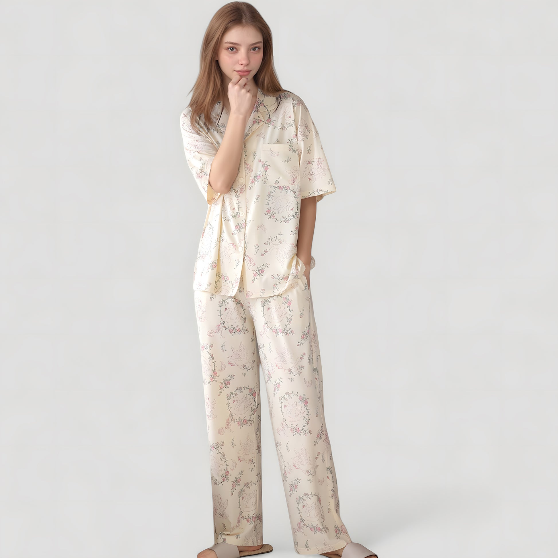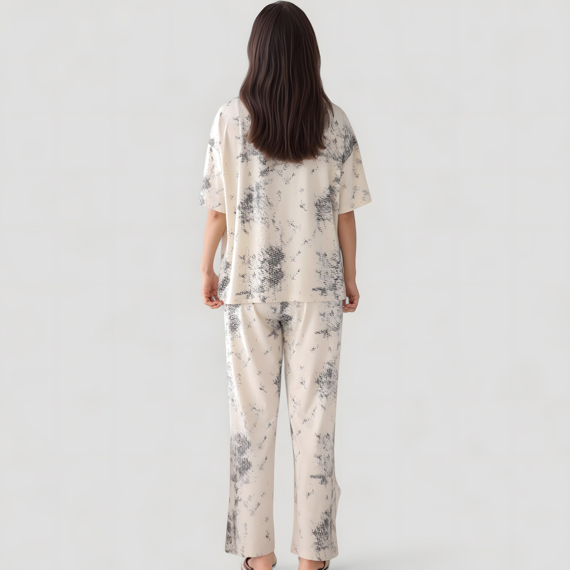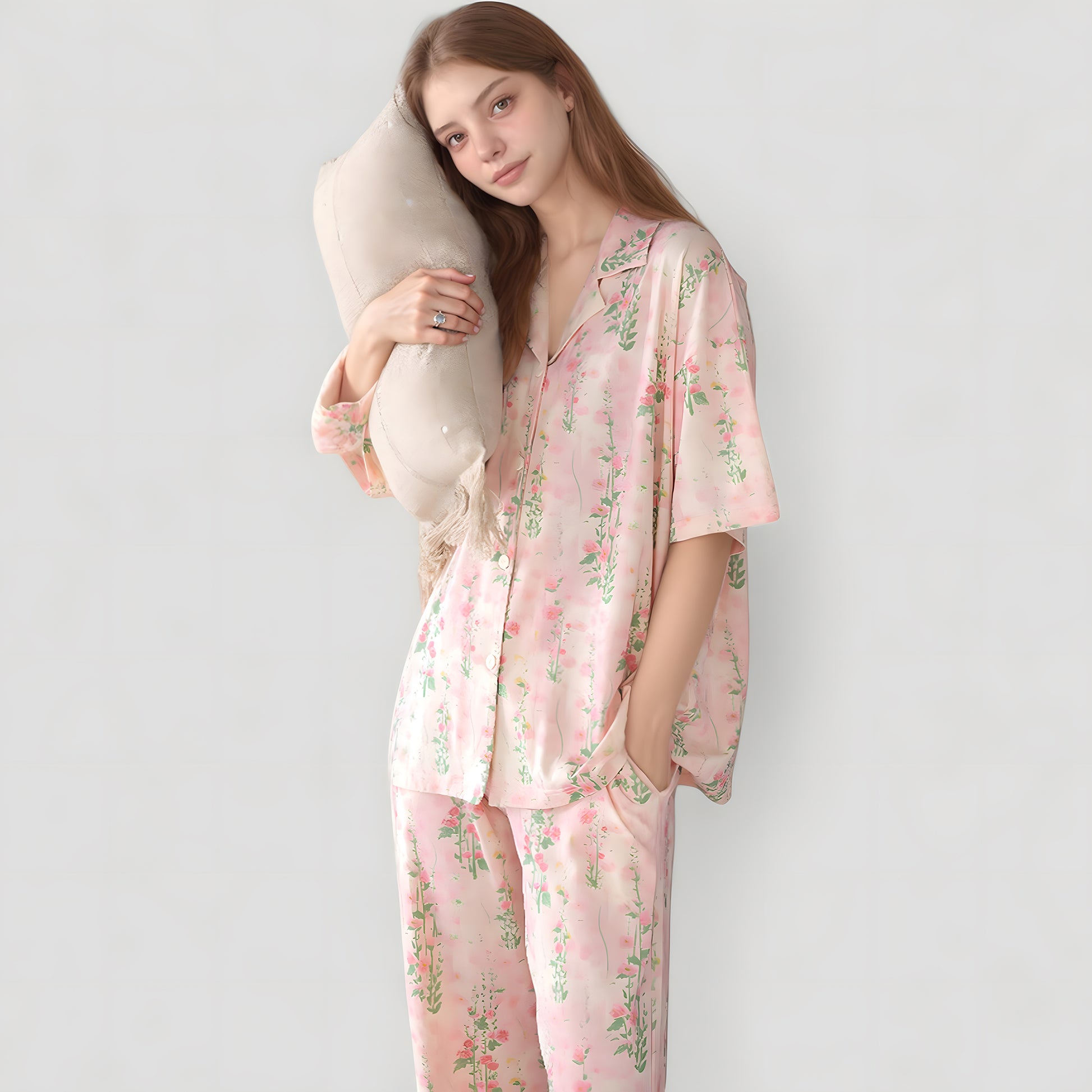 Short Sleeve Watercolor Print Satin Pajama Set with Button Up Top and Wide Leg Pants