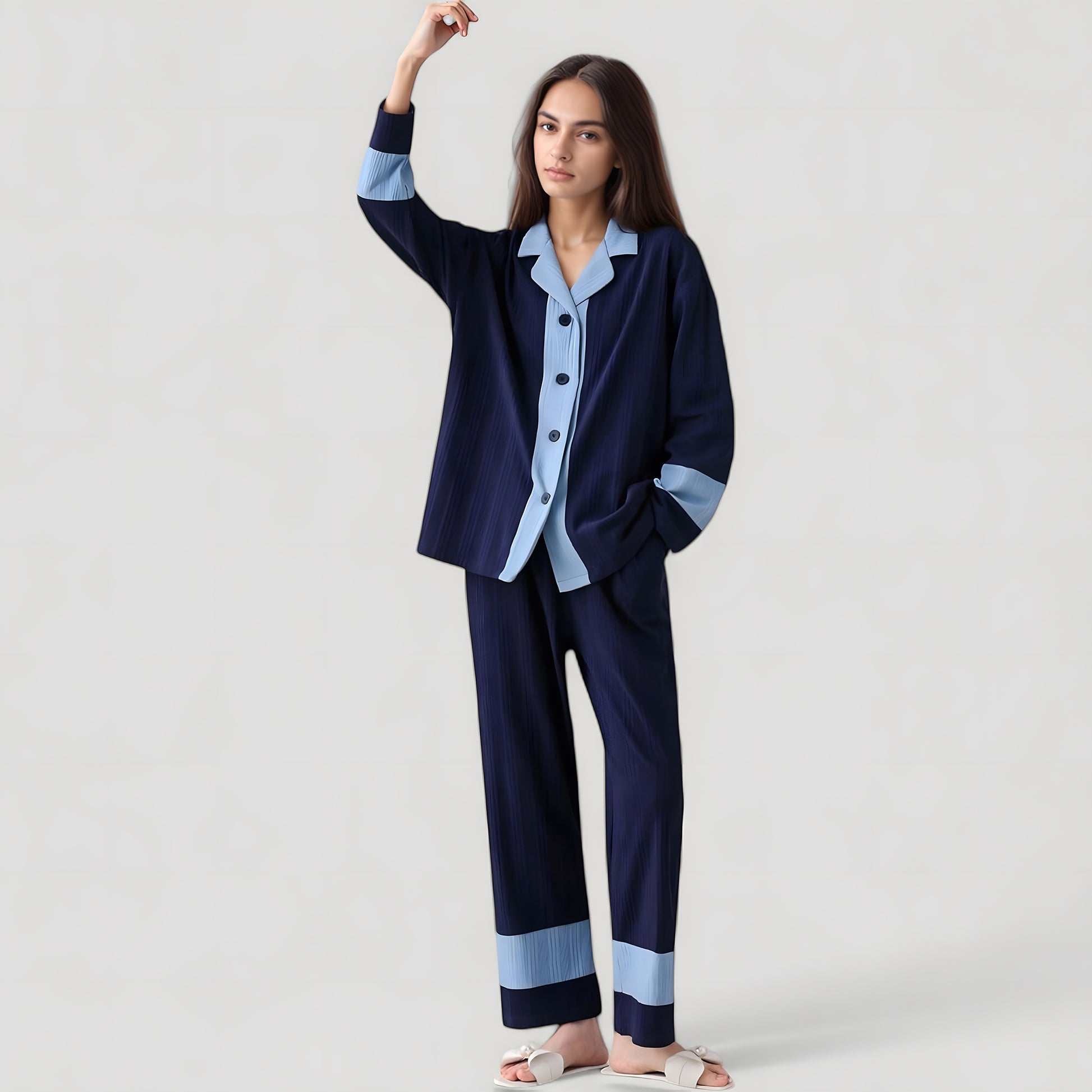 The Anna-Kaci Women's Colorblock Pajama Set delivers a modern take on classic loungewear. Featuring bold contrast trim, this long sleeve button-up top pairs effortlessly with straight leg pants for a polished yet relaxed silhouette. Designed with subtle vertical texture for added dimension, the set combines chic details with soft, drapey fabric. Perfect for upgrading your homewear look.