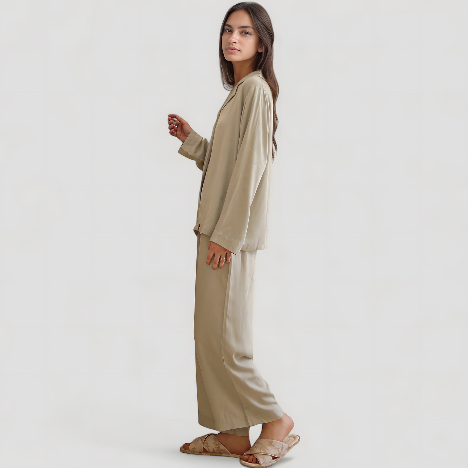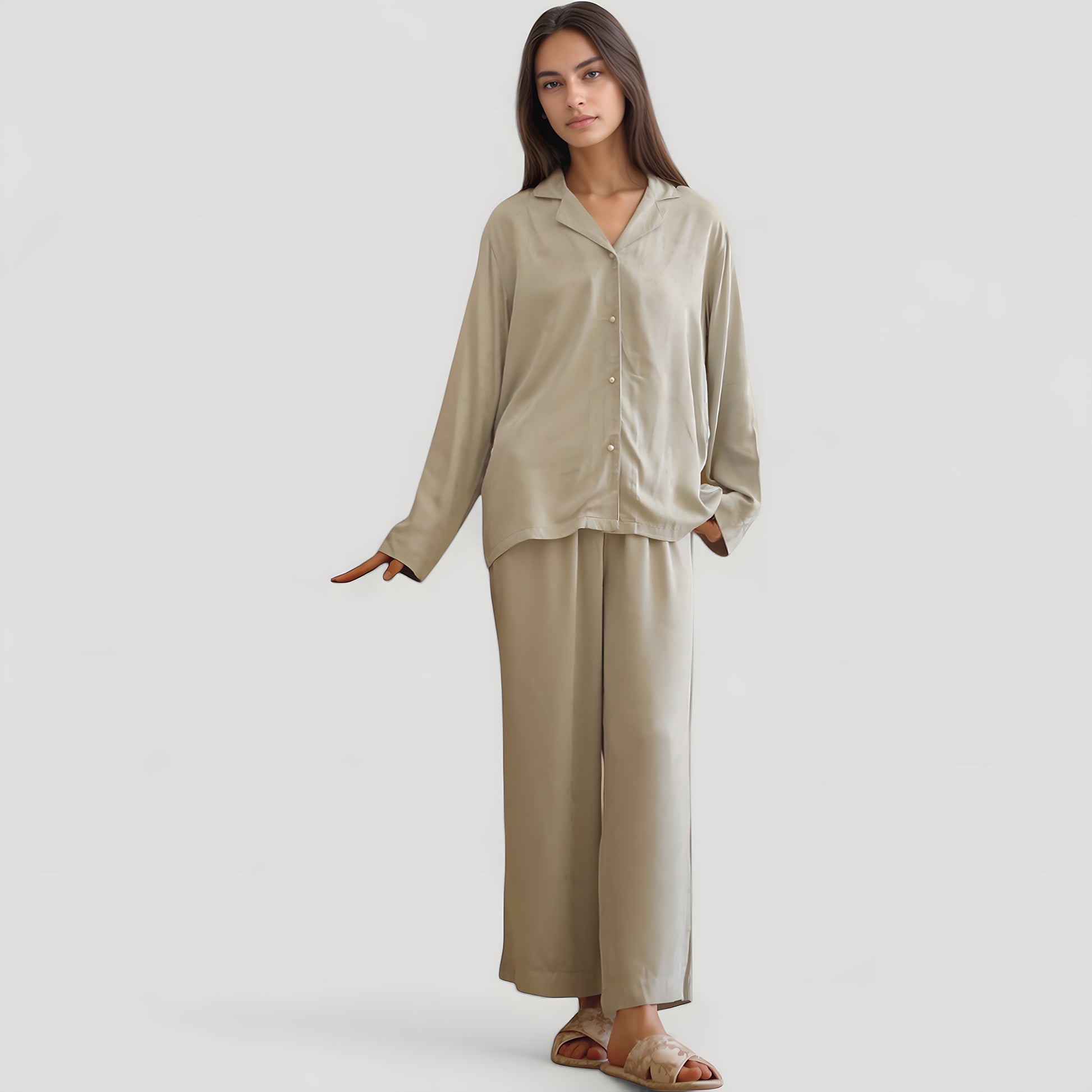 The Anna-Kaci Women's Satin Button-Up Pajama Set combines timeless ease with soft elegance. Featuring a short sleeve button-up top and wide-leg pants, this set is designed for maximum comfort and a flattering drape. The satin fabric gives a polished finish, while the relaxed silhouette offers breathable wear throughout the day. A refined choice for cozy lounging or laid-back evenings.