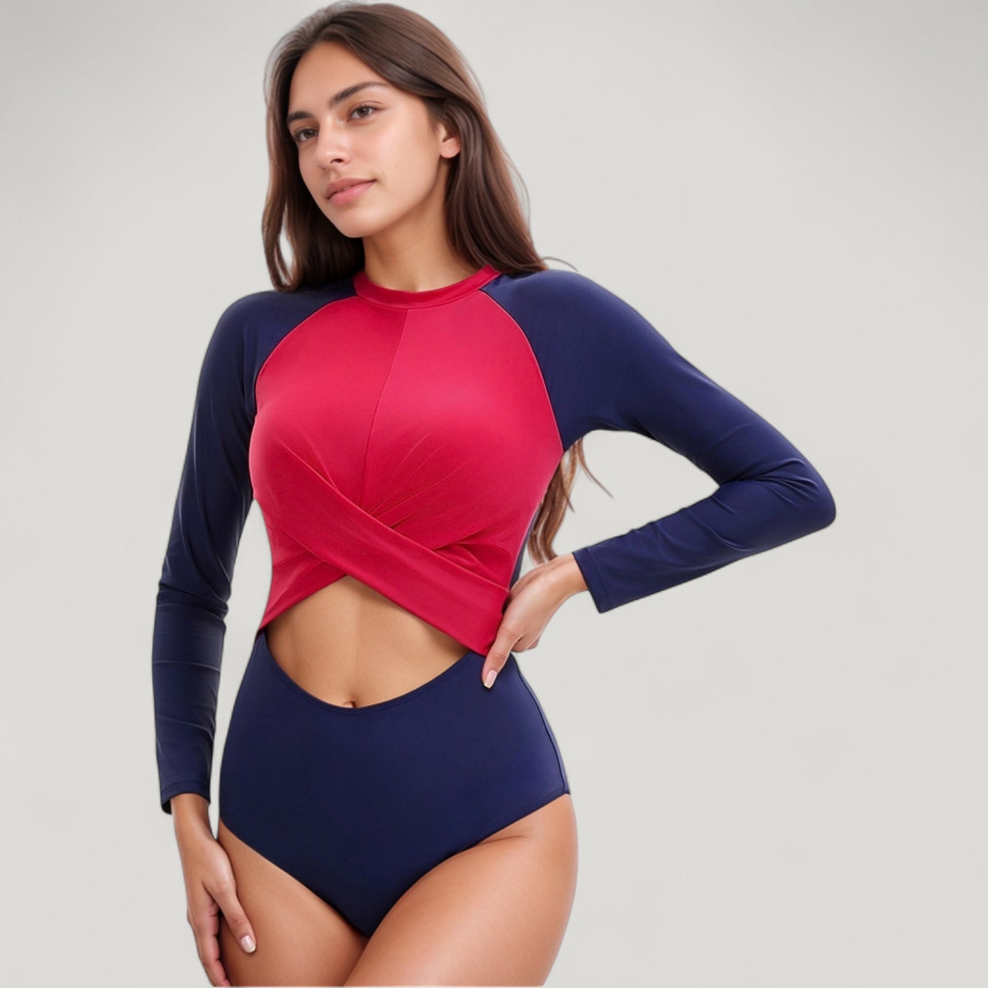 Long Sleeve One Piece Swimsuit with Cut-Out Waist and Cross Front Detail