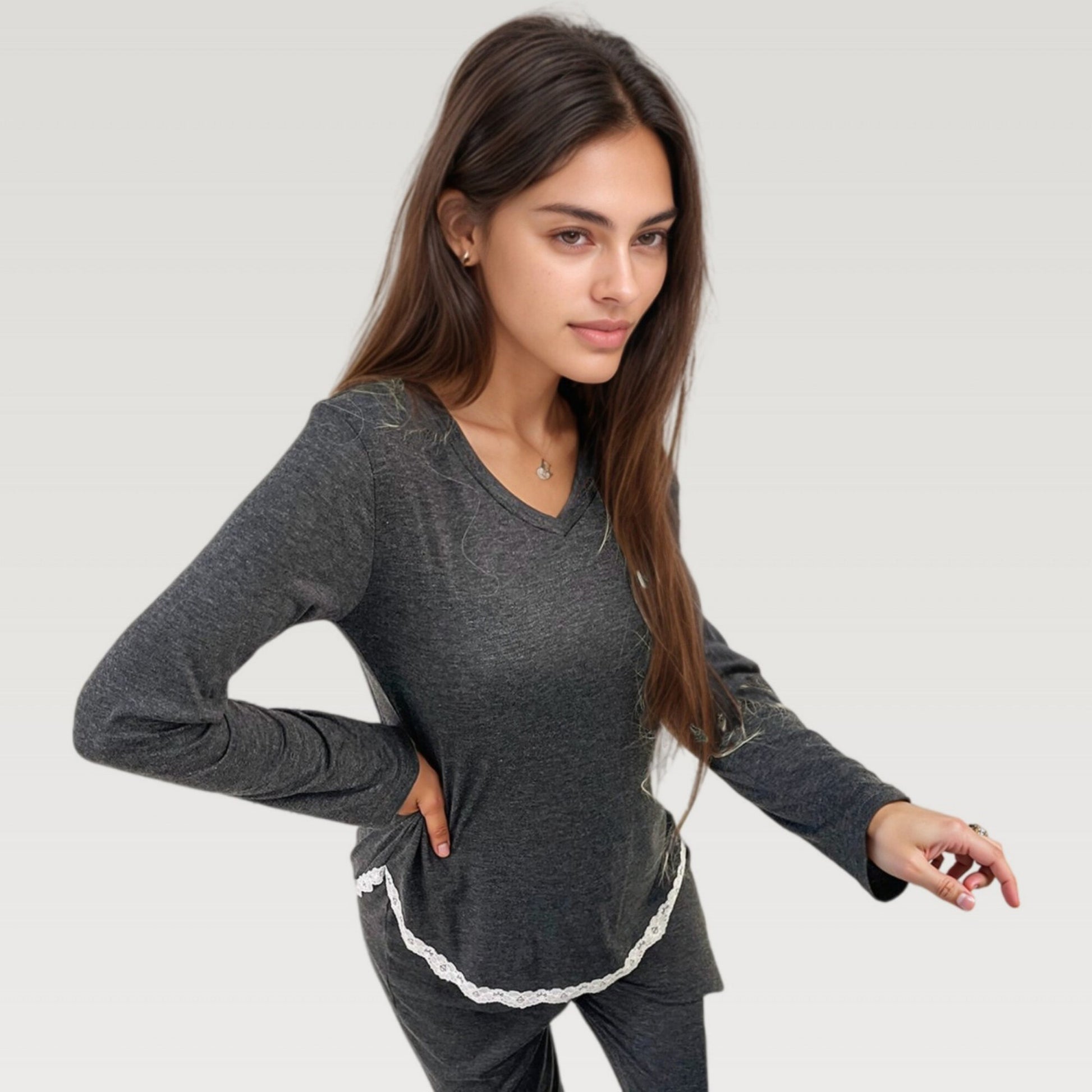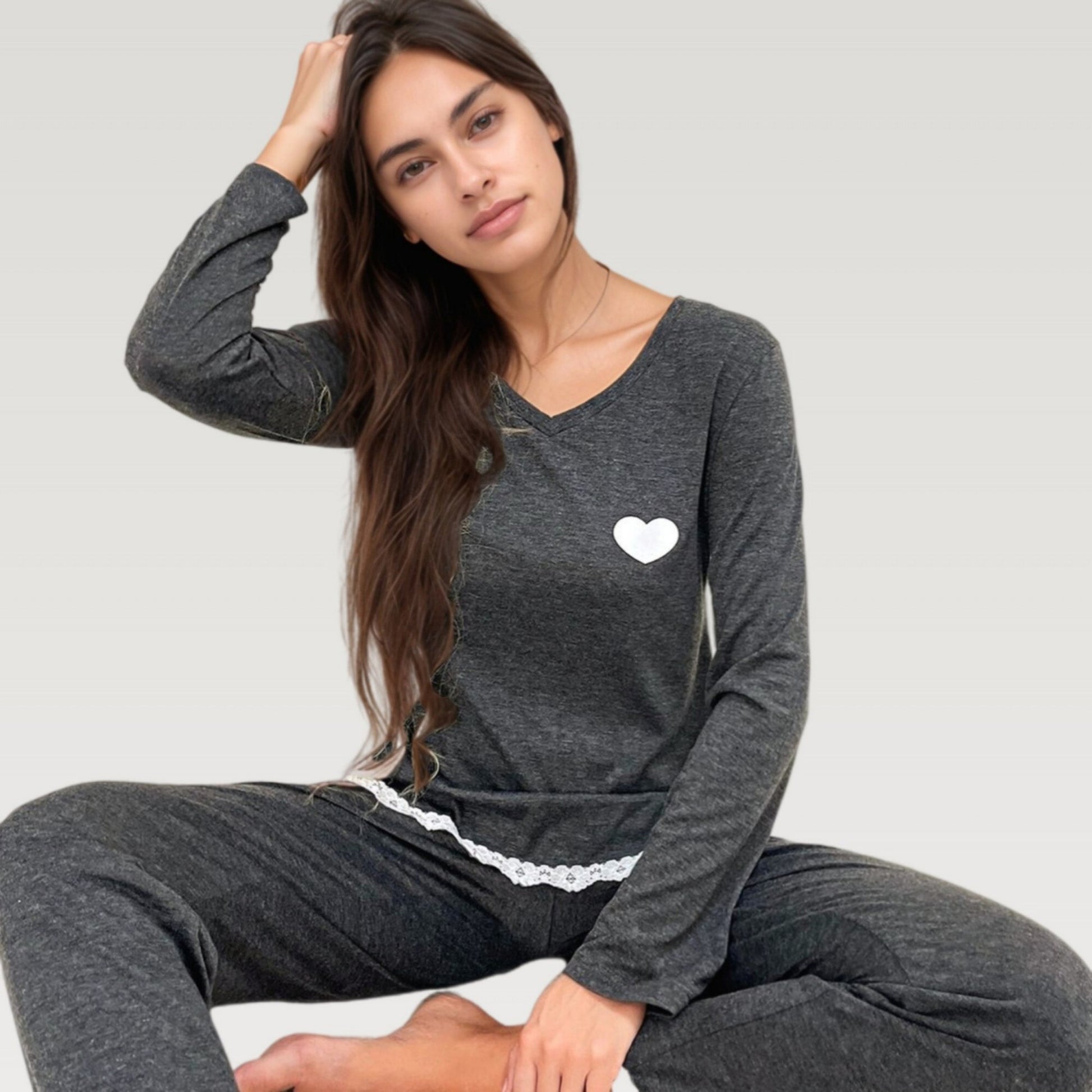 Long Sleeve Pajama Set with Lace Trim and Heart Detail