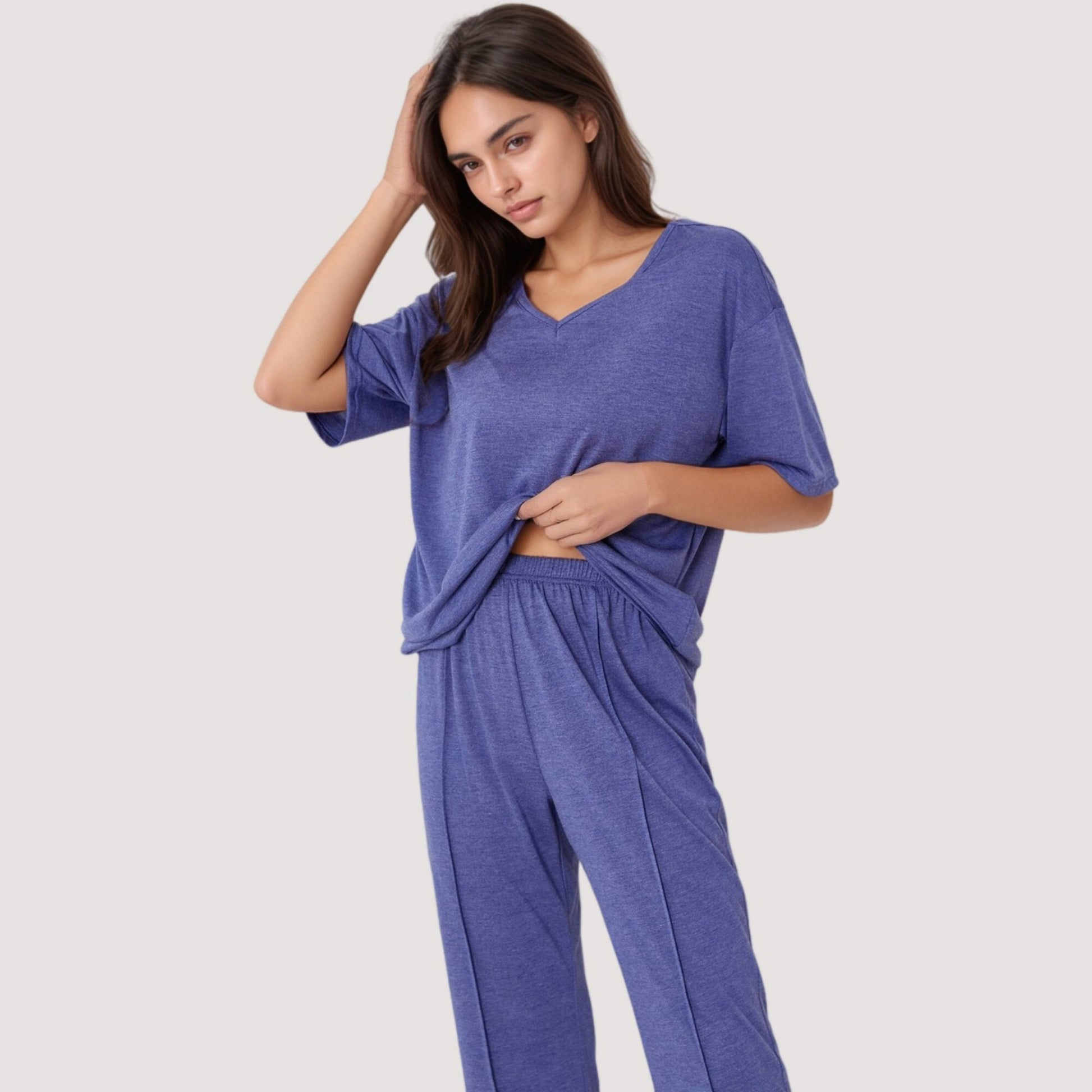 Relaxed Fit Lounge Set with V-Neck Short Sleeve Top and Full-Length Pants