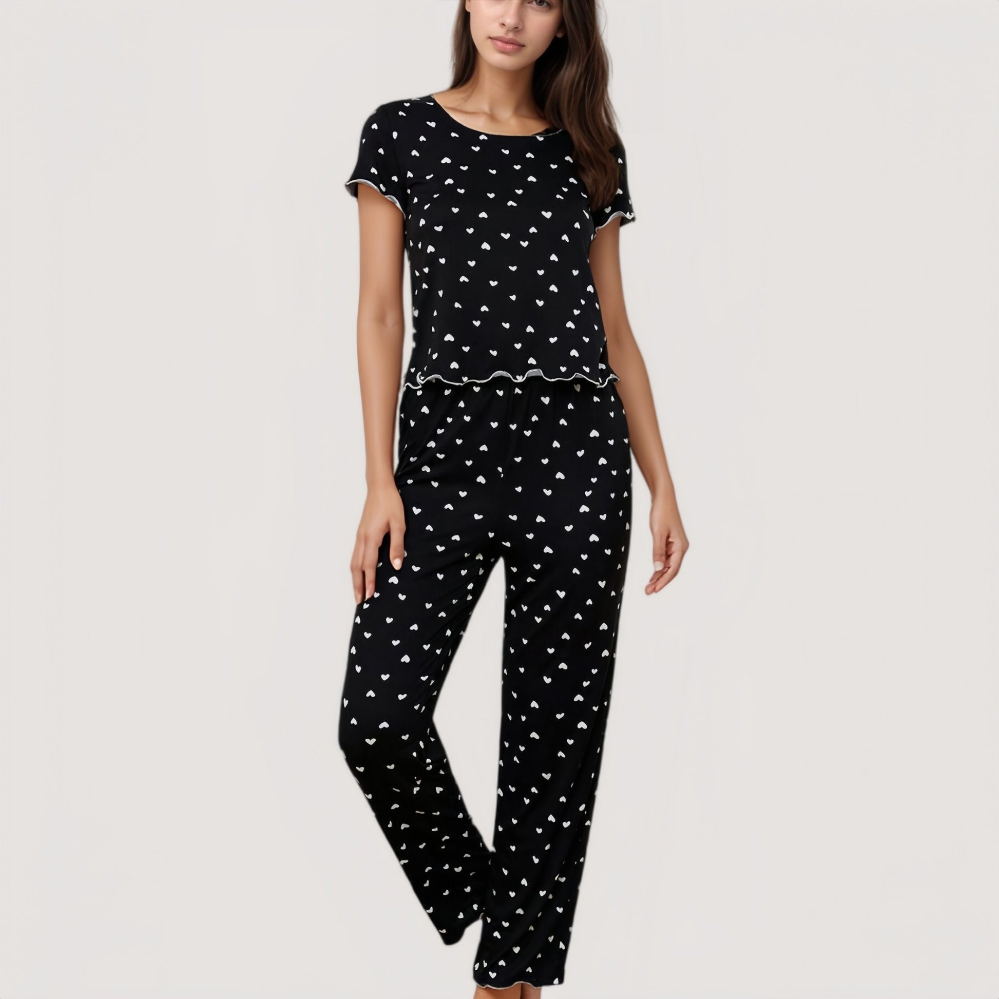 Heart Print Pajama Set with Short Sleeve Lettuce Trim Top and Full-Length Pants