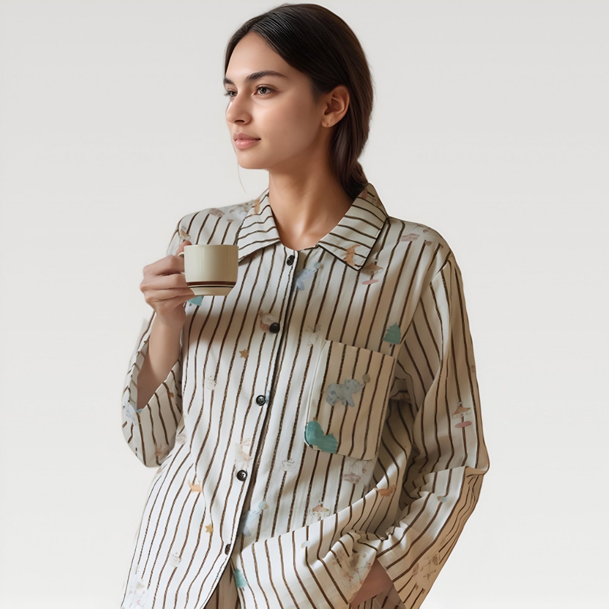 Satin Striped Pajama Set with Button Up Long Sleeve Shirt and Illustrated Tree Print Pants