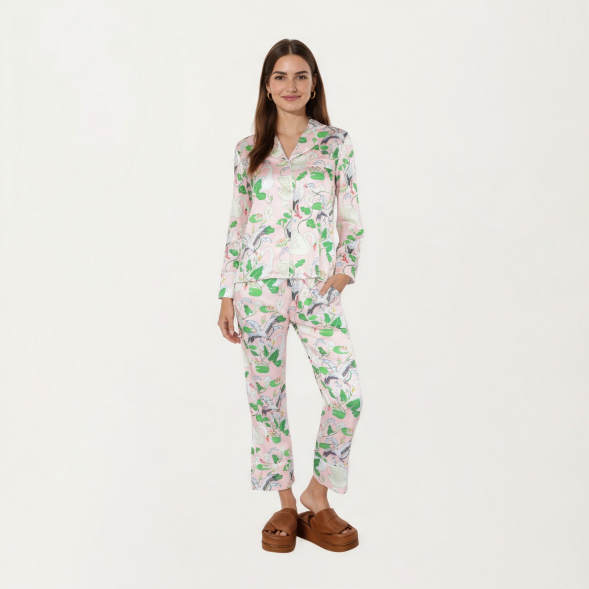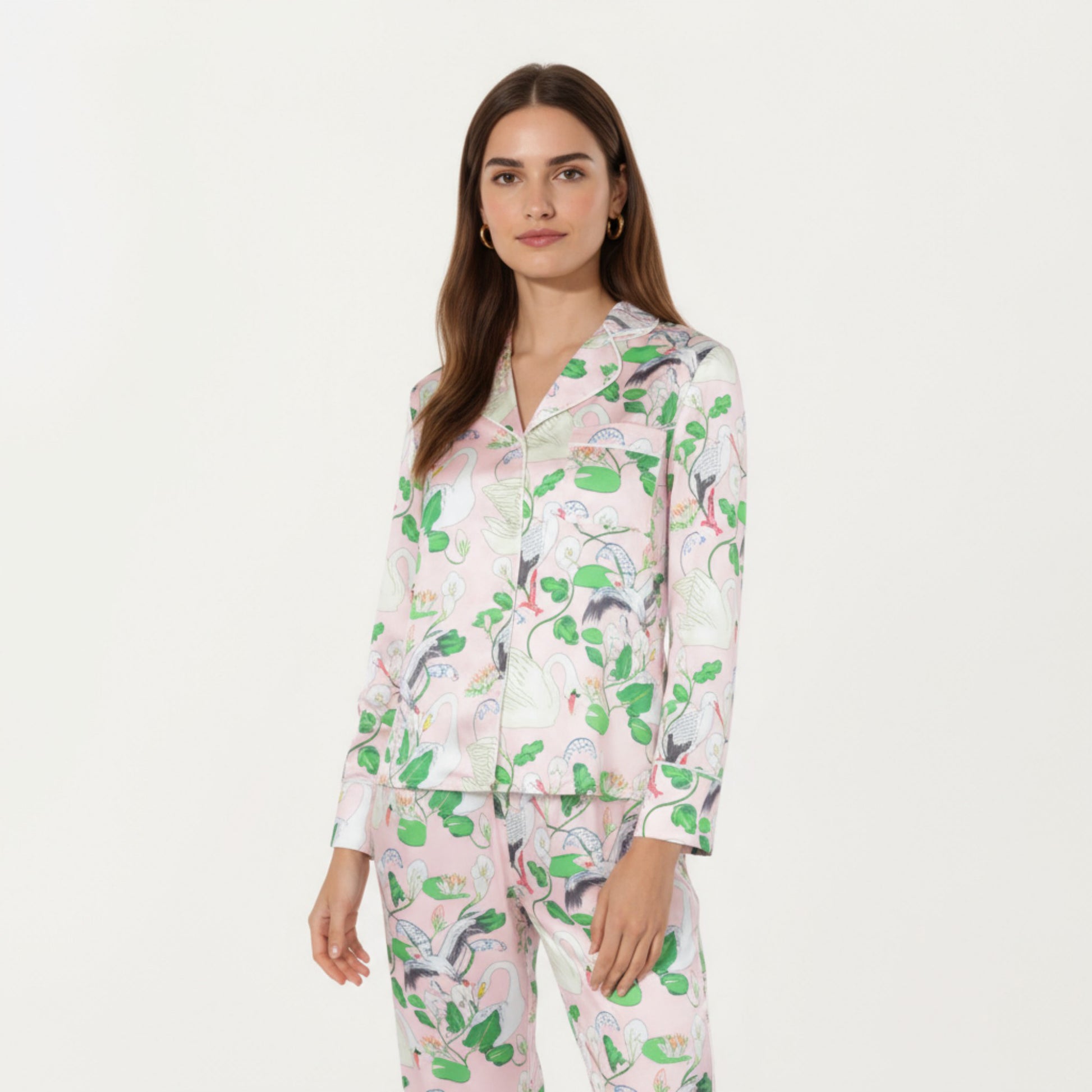 2-Piece Set Long Sleeve Button Front Pajama Set with Crane Print and Soft Silky Fabric for Relaxed Comfort