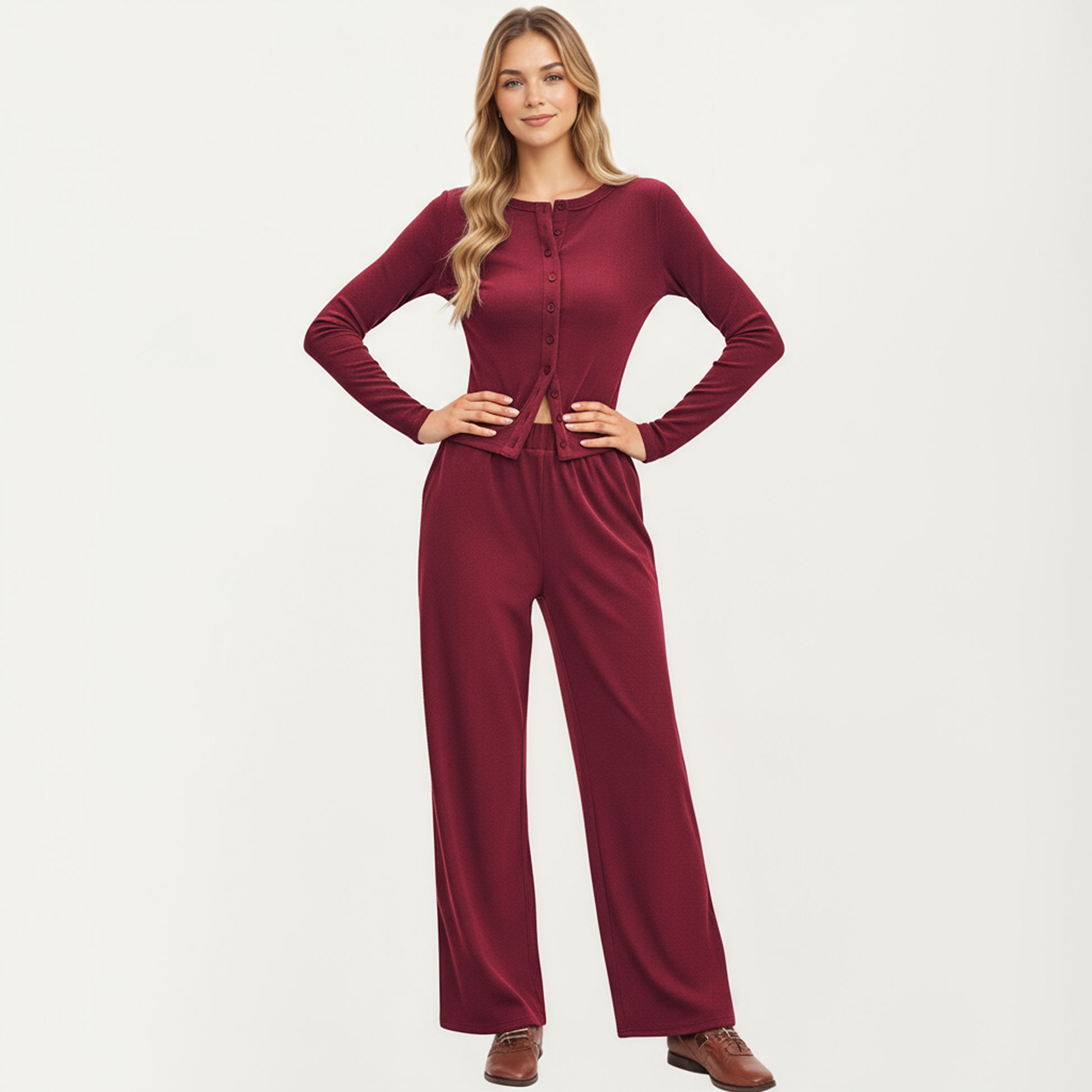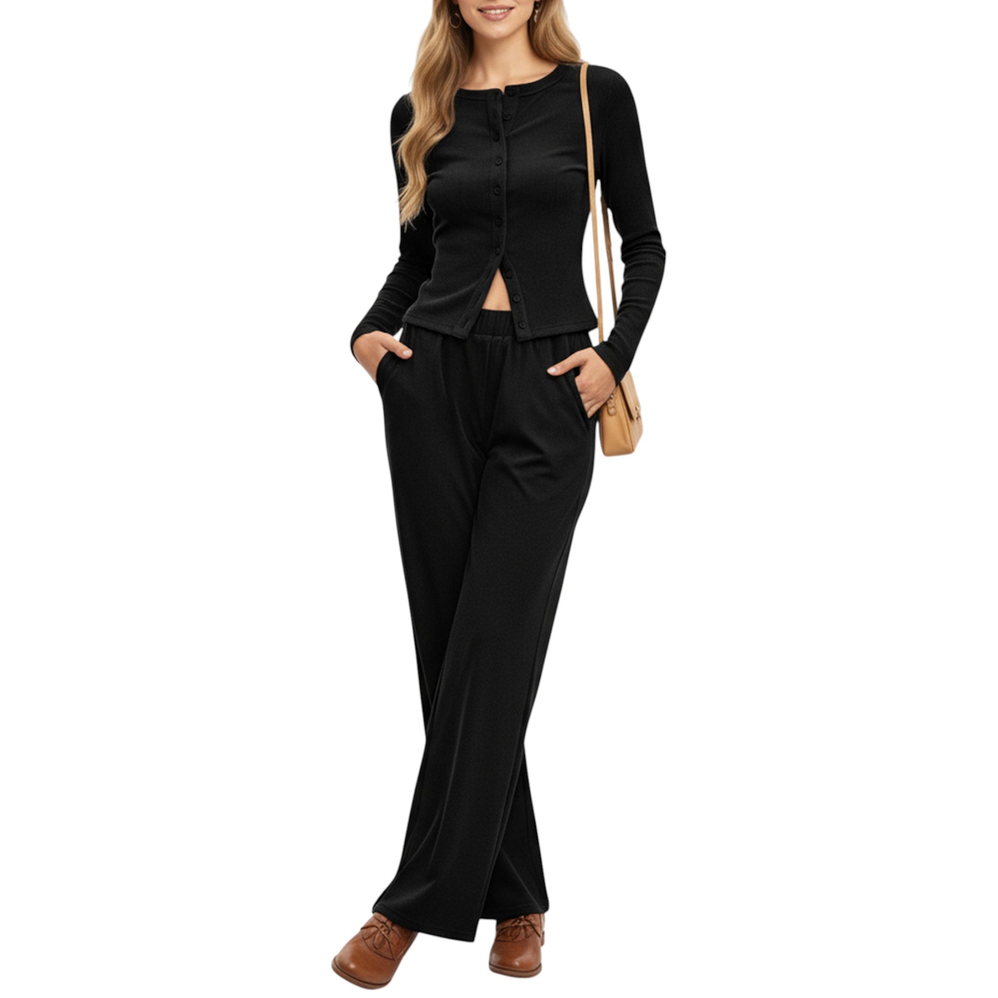 2-Piece Set Long Sleeve Button Front Top and Wide Leg Pants