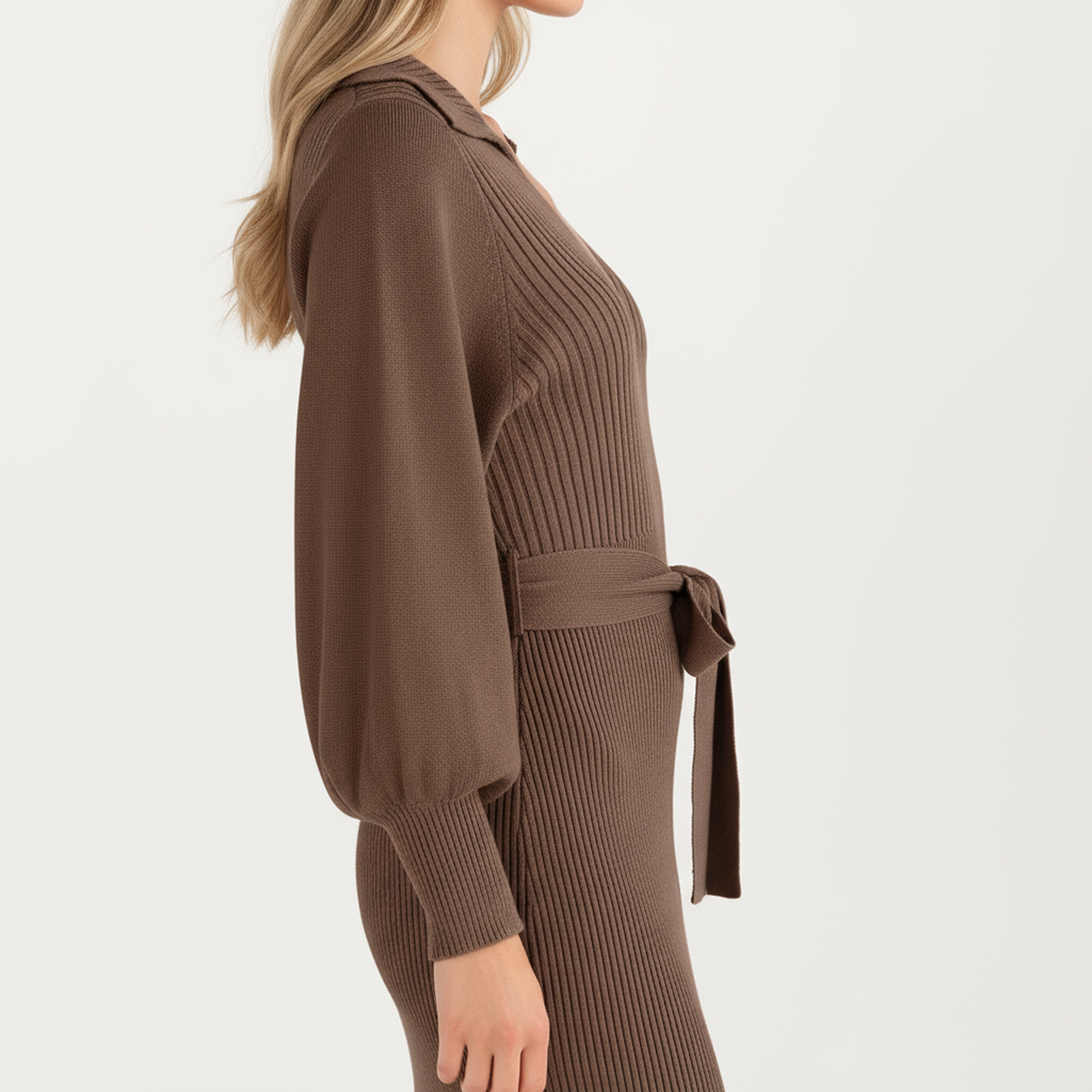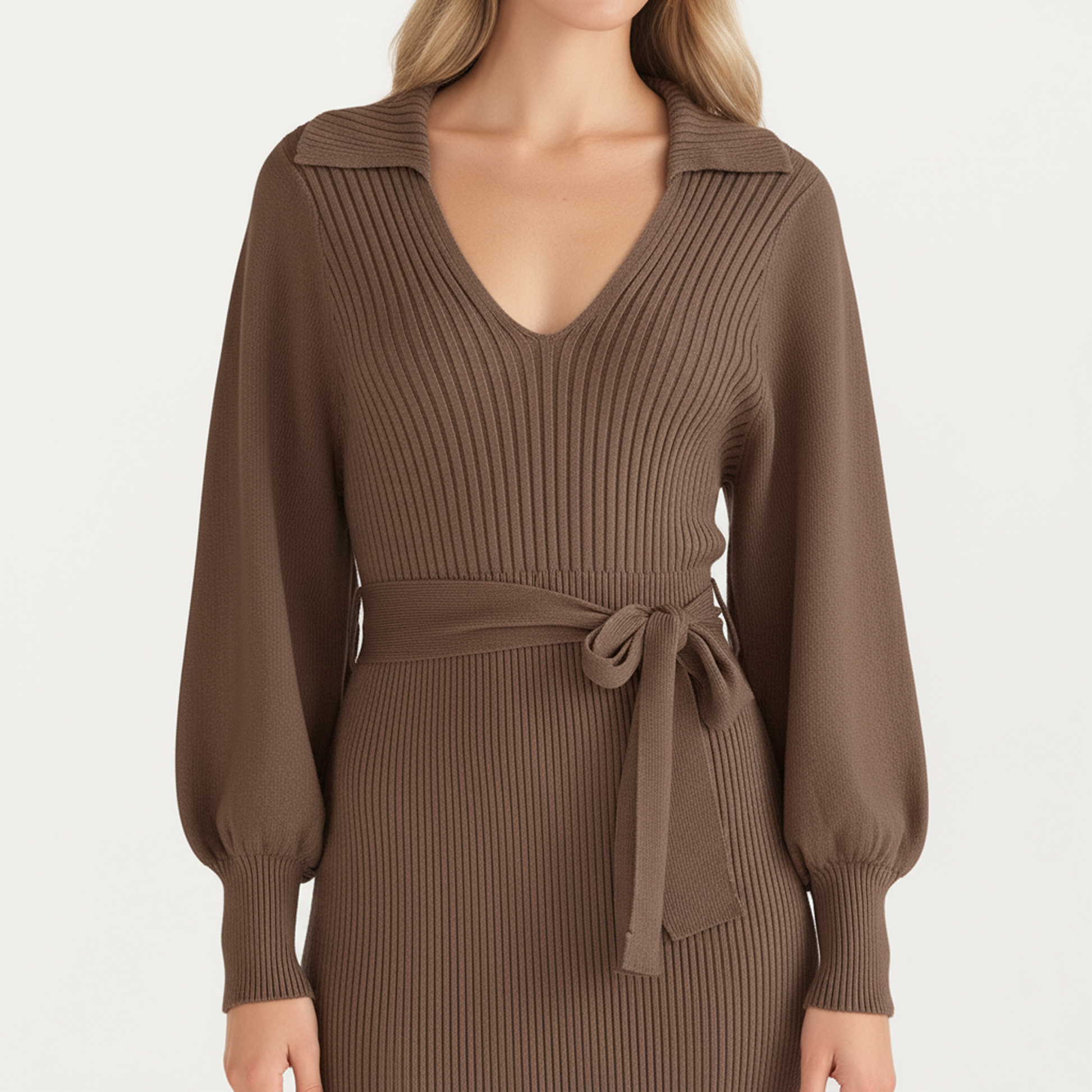 Long Sleeve Ribbed Knit Midi Dress with V-Neck and Waist Tie