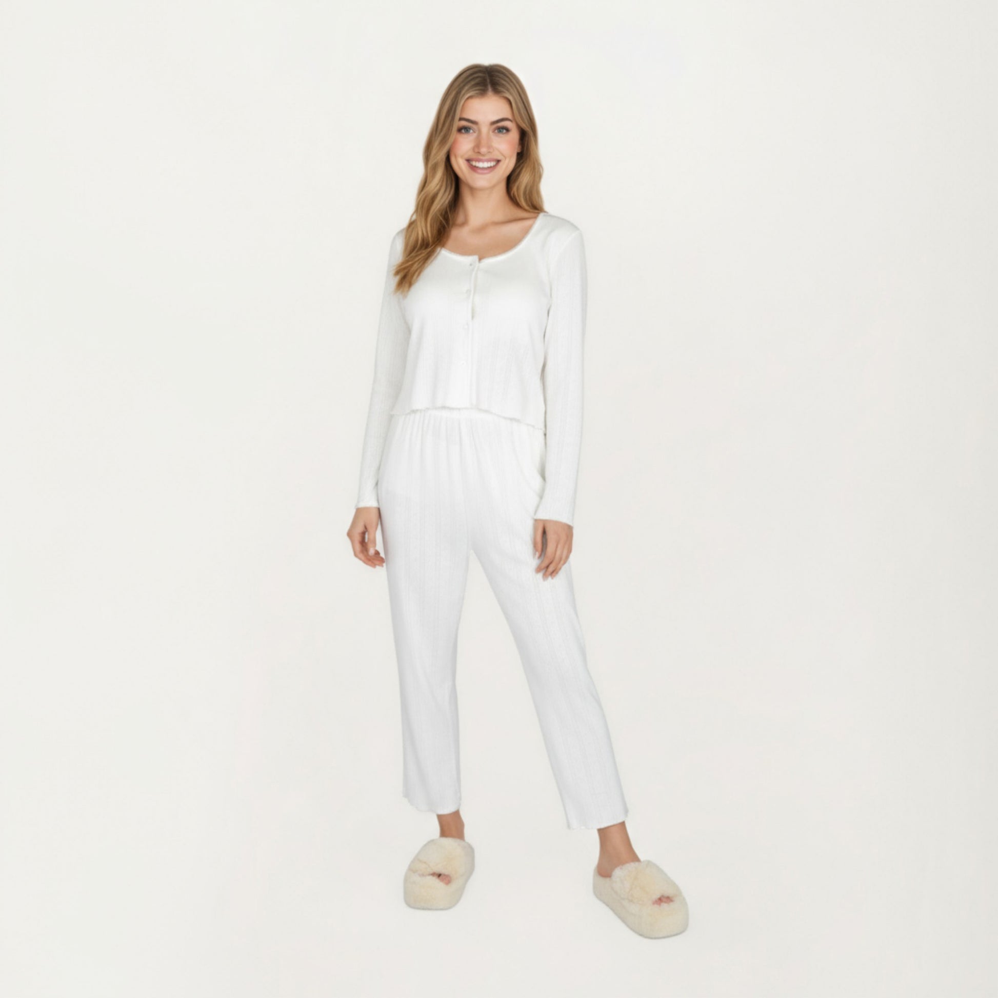 The Anna-Kaci Women's 2-Piece Set Long Sleeve Button Front Top with Built-In Chest Pads and Relaxed Fit Pants Pajama Set combines practical design with ultimate comfort. Featuring a long sleeve button-front top with built-in chest pads for light support and matching elastic waist pants, this set is crafted from soft, breathable knit fabric for a cozy yet stylish look. Perfect for bedtime or lounging, it offers ease and everyday comfort.