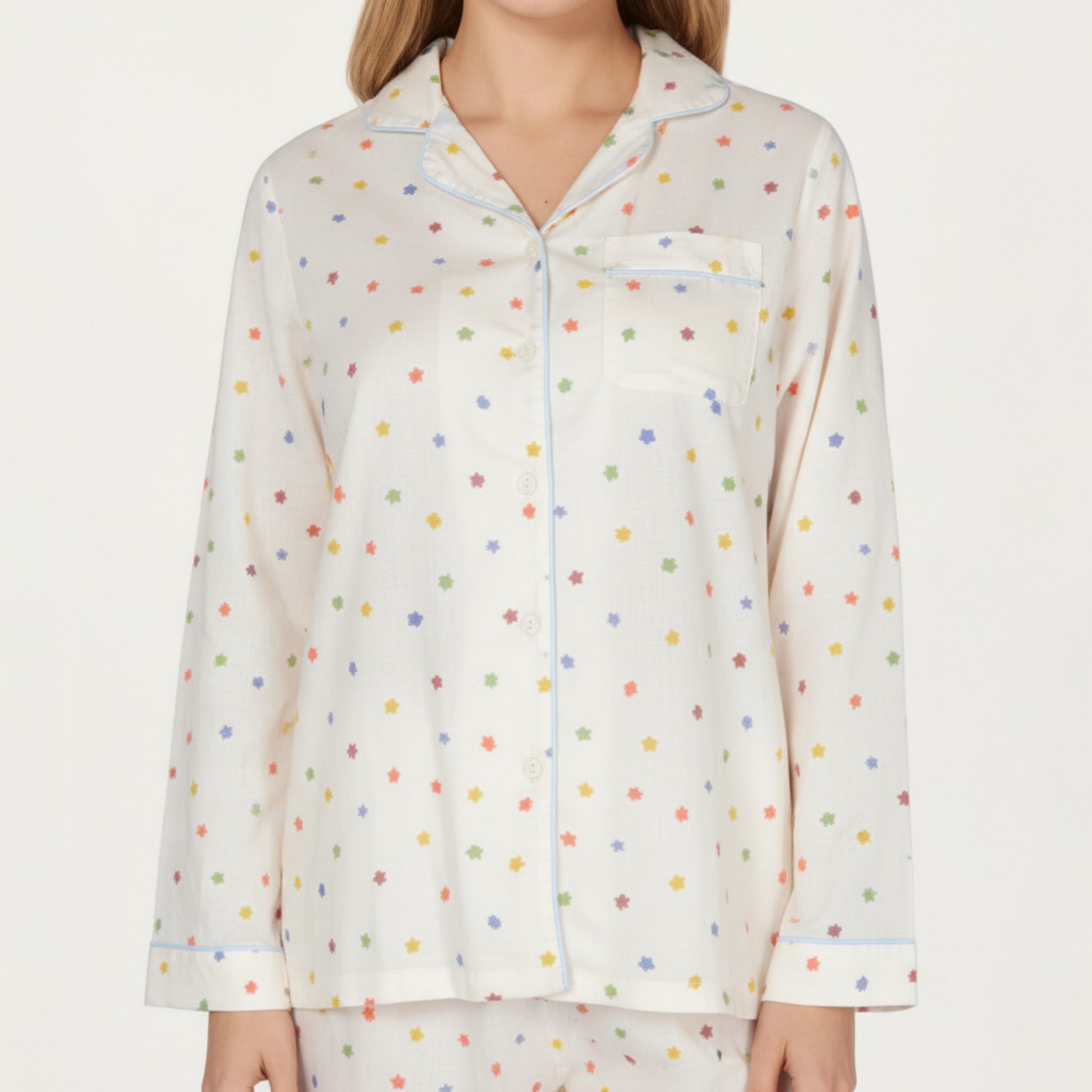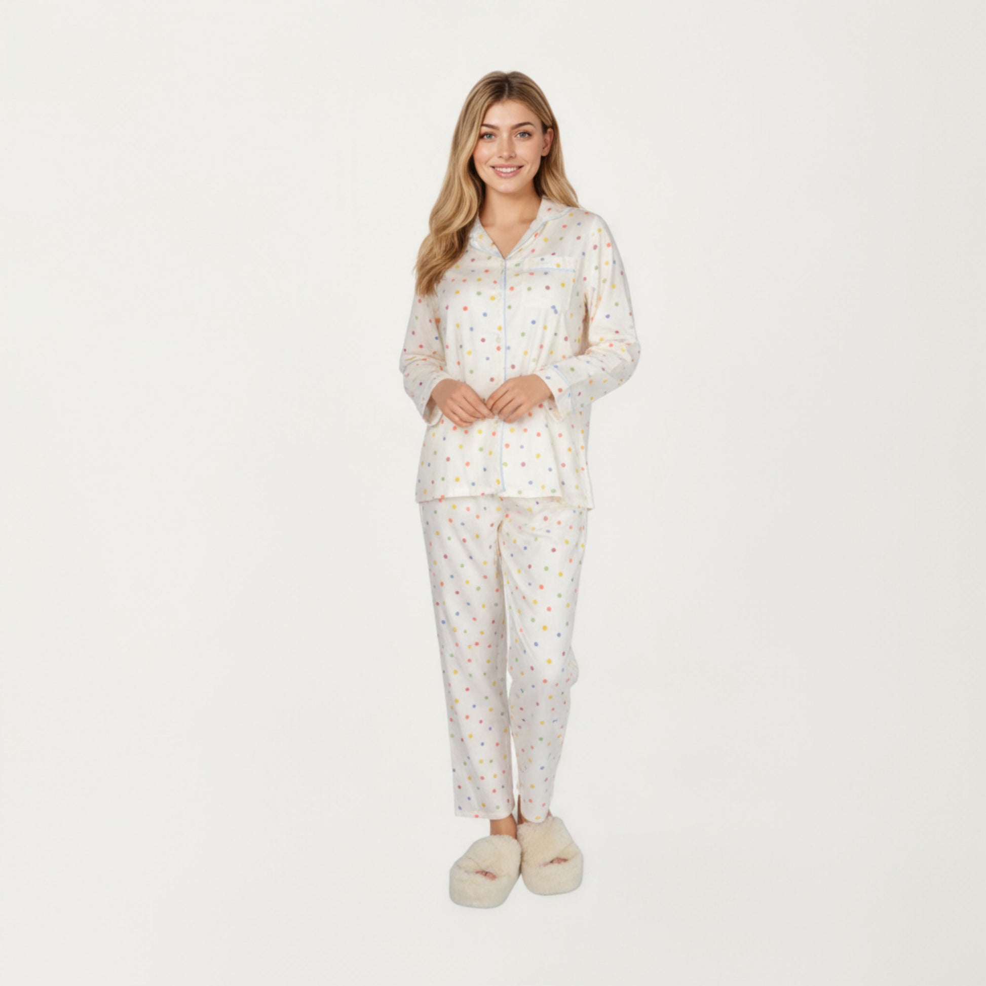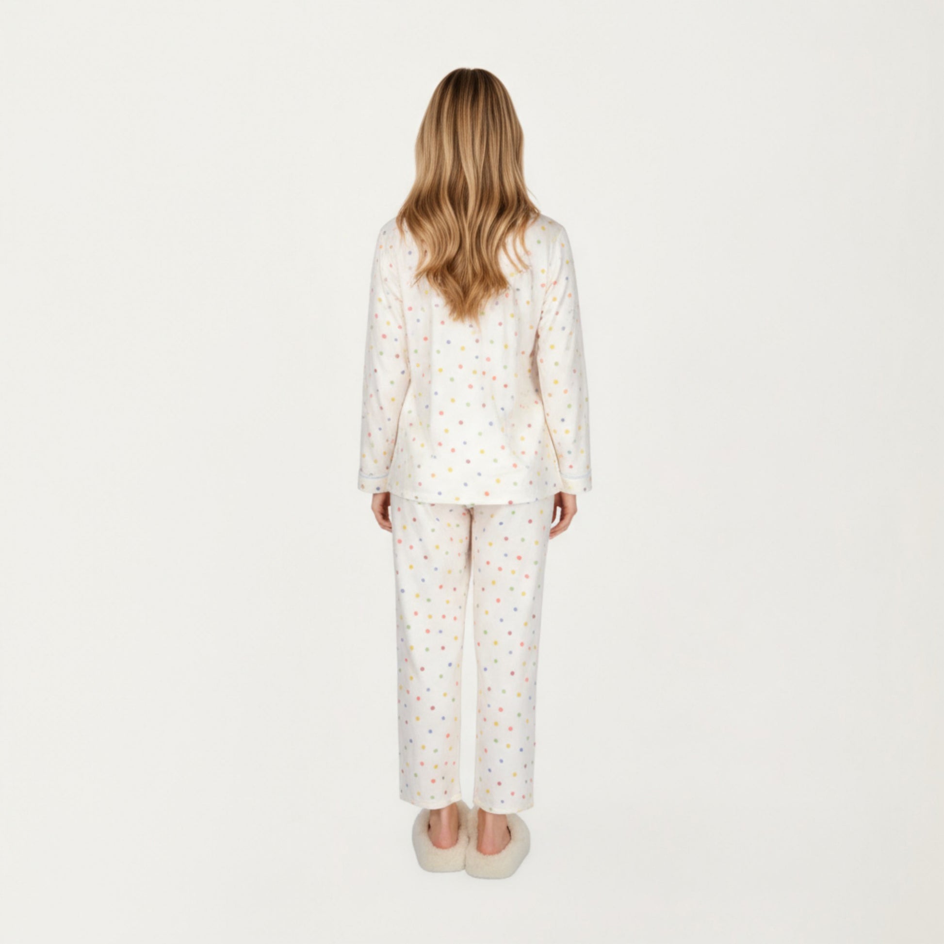 2-Piece Set Polka Dot Print Button-Up Long Sleeve Pajama Top and Matching Pants