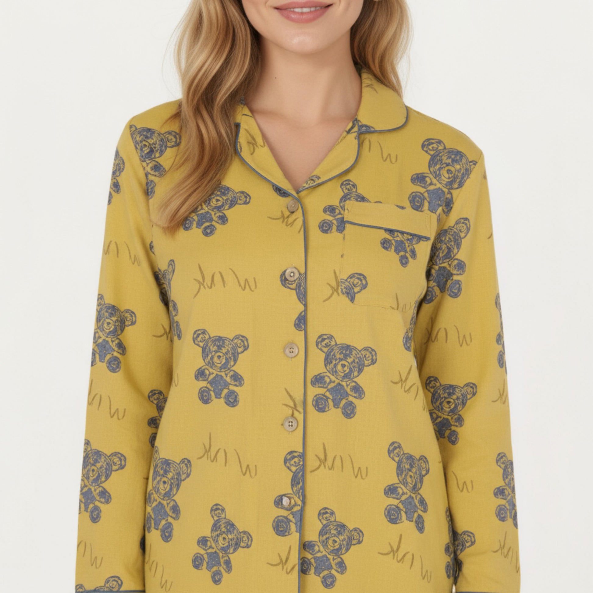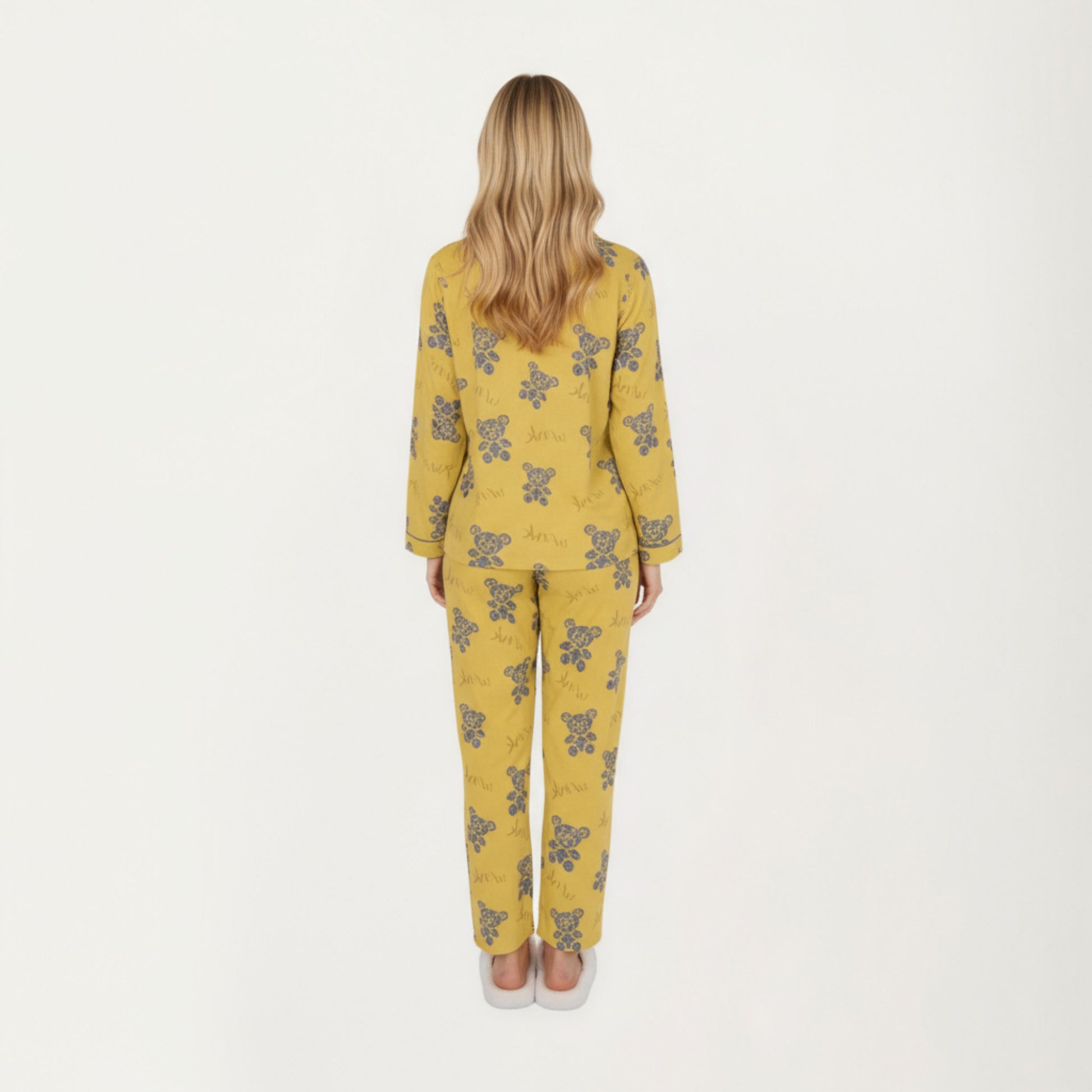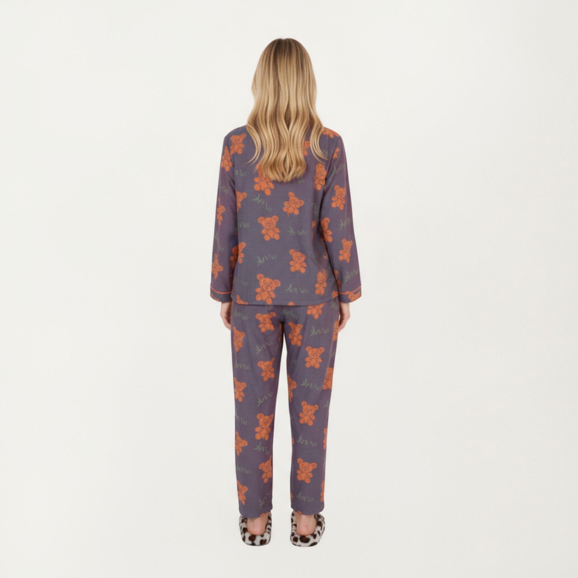2-Piece Set Teddy Bear Print Button-Up Long Sleeve Pajama Top and Relaxed Fit Pants