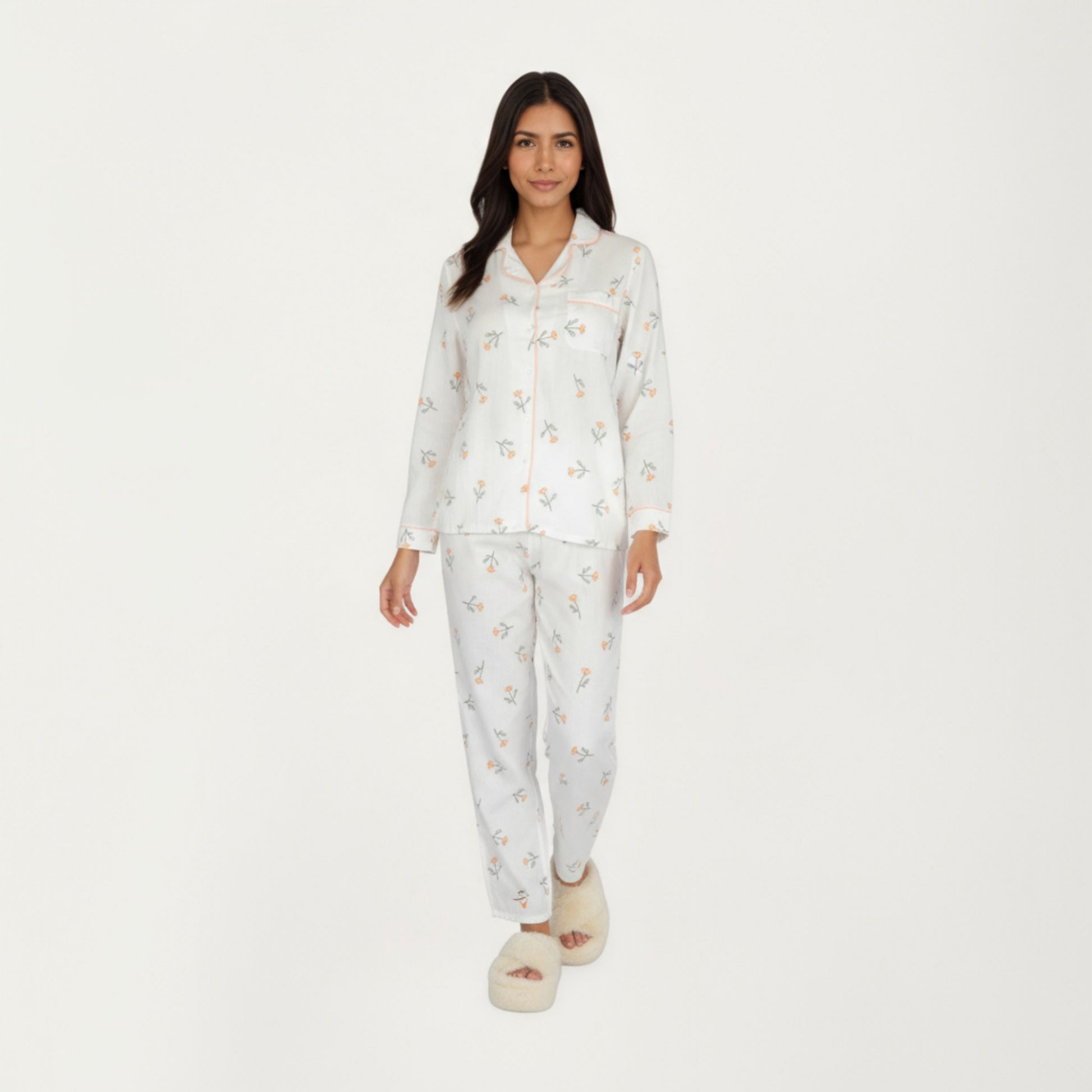 The Anna-Kaci Women's 2-Piece Set Long Sleeve Button Front Pajama Top with Notched Collar and Elastic Waist Pants features a charming floral print design on soft, breathable fabric. The button-front top provides a relaxed fit, while the matching full-length pants with elastic waistband offer all-day and all-night comfort for lounging or sleeping.