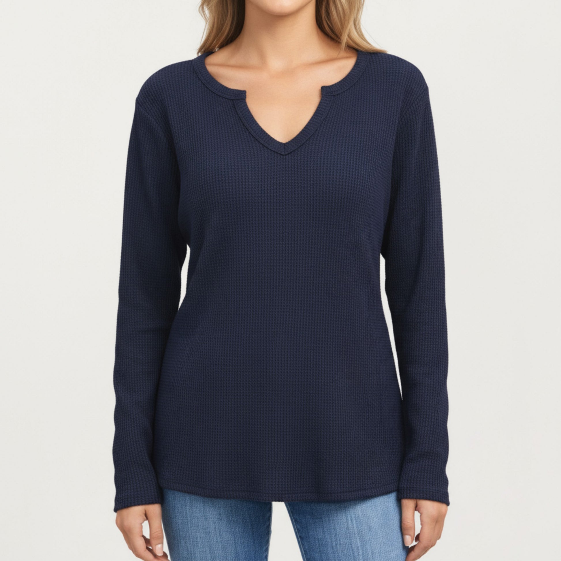 Long Sleeve Waffle Knit Top with Notch V-Neckline and Relaxed Fit