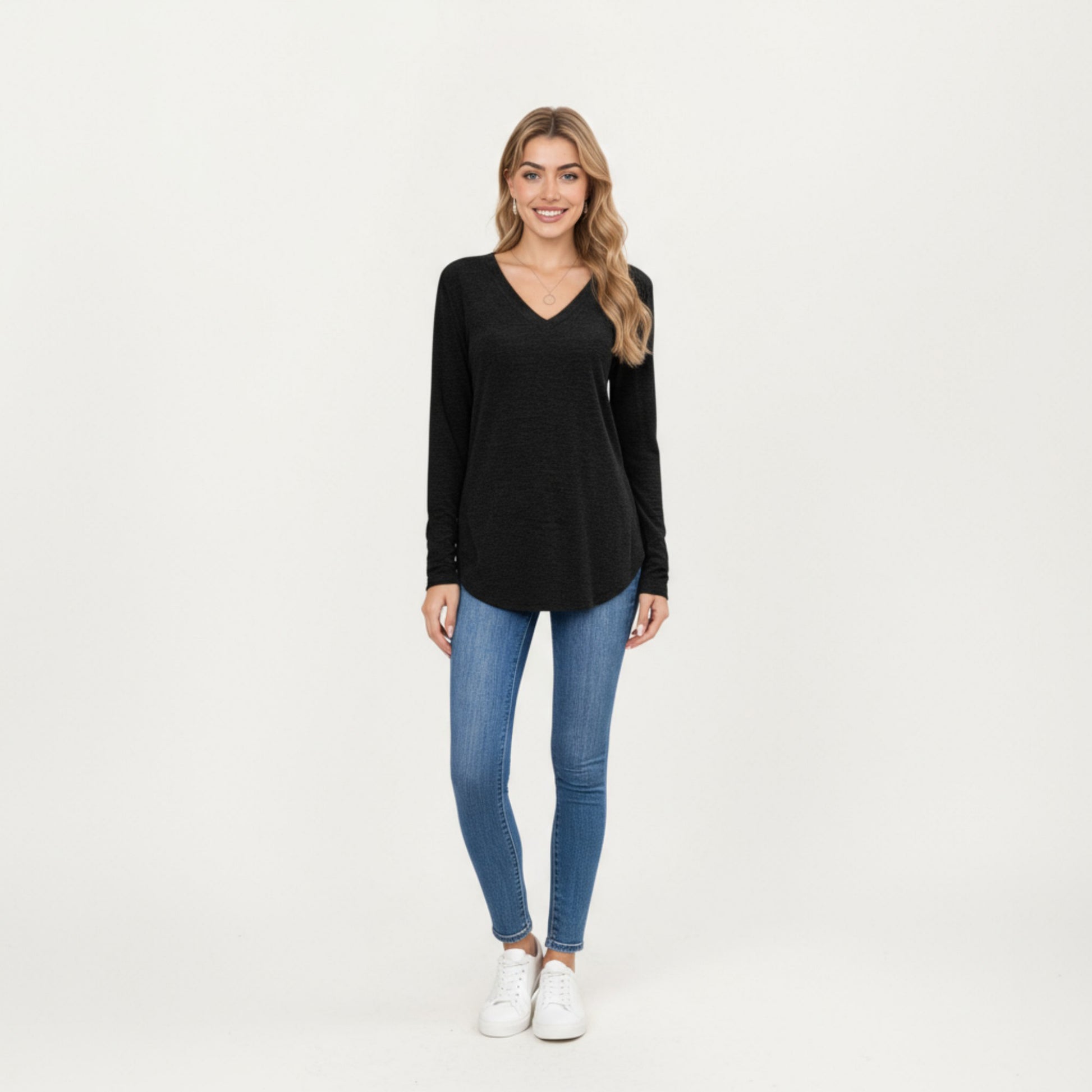 Long Sleeve V-Neck Knit Top with Curved Hem and Relaxed Fit