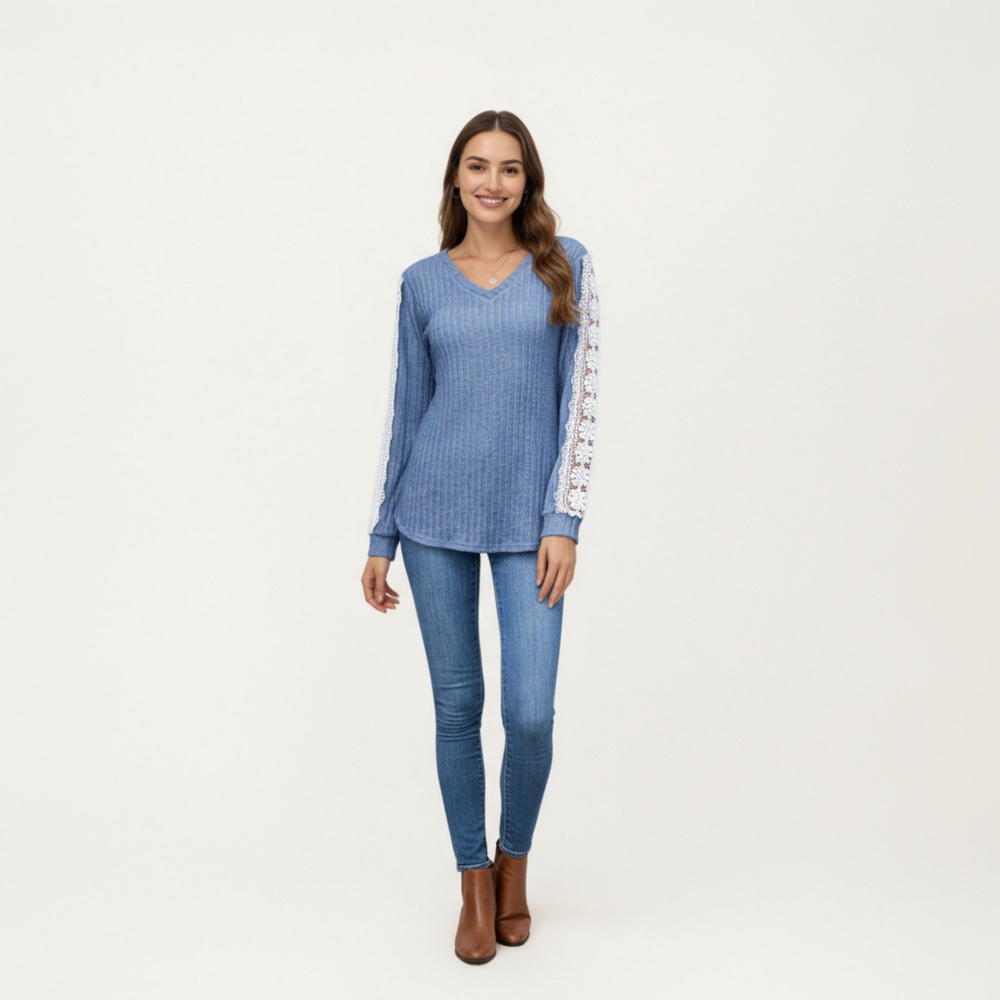 The Anna-Kaci Women's Long Sleeve V-Neck Knit Top features a soft ribbed knit fabric with delicate lace trim running along the sleeves for a feminine touch. The flattering V-neckline and curved hem create a relaxed yet stylish silhouette. Perfect for pairing with jeans or layering under jackets, this versatile top adds a chic detail to any casual outfit.