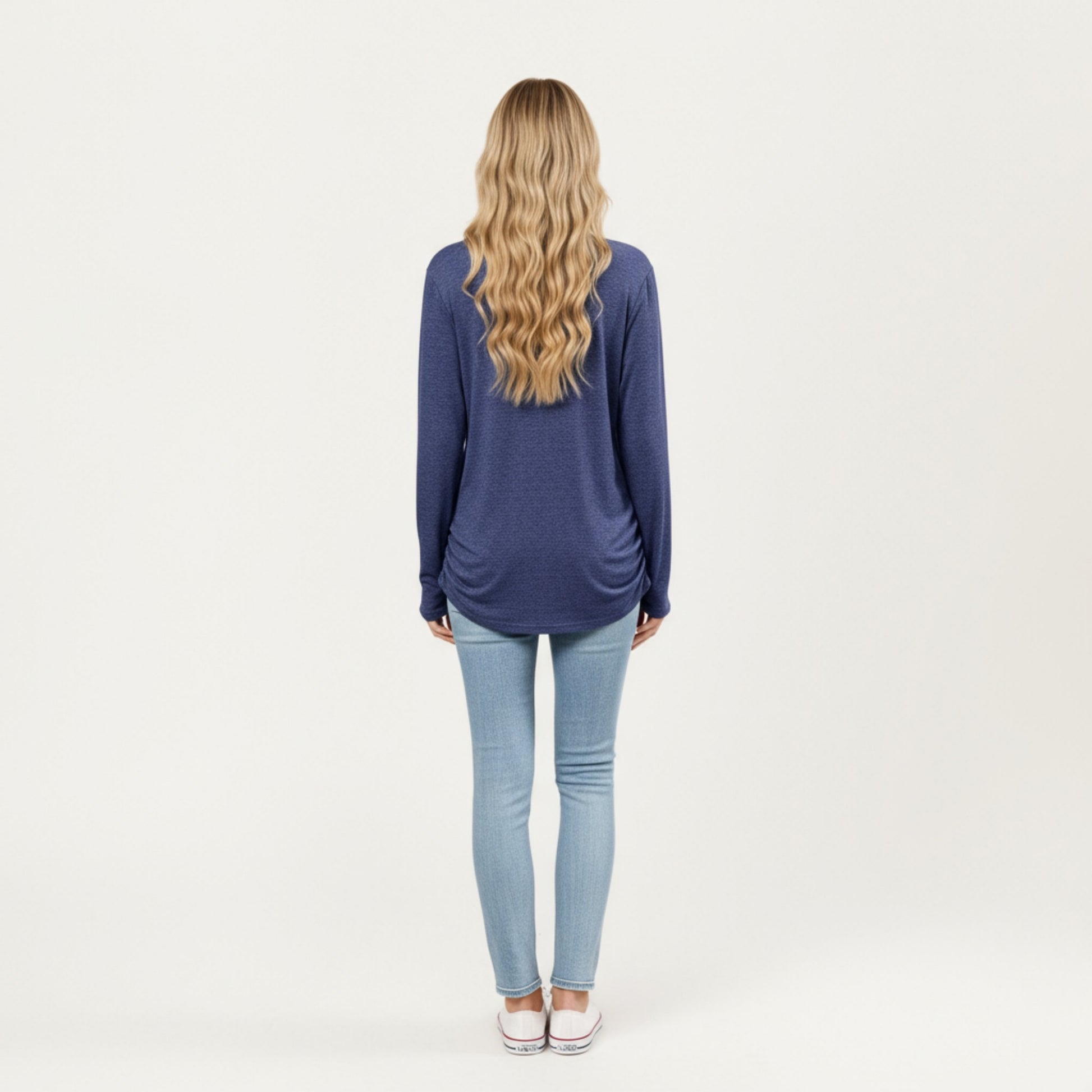 The Anna-Kaci Women's Long Sleeve V-Neck Top features a flattering V-neckline and subtle ruched side detailing for a modern, feminine touch. Crafted from soft, breathable fabric, this versatile top offers both comfort and style, making it perfect for layering or wearing on its own. Designed with a relaxed fit, it pairs effortlessly with jeans or skirts for a polished everyday look.