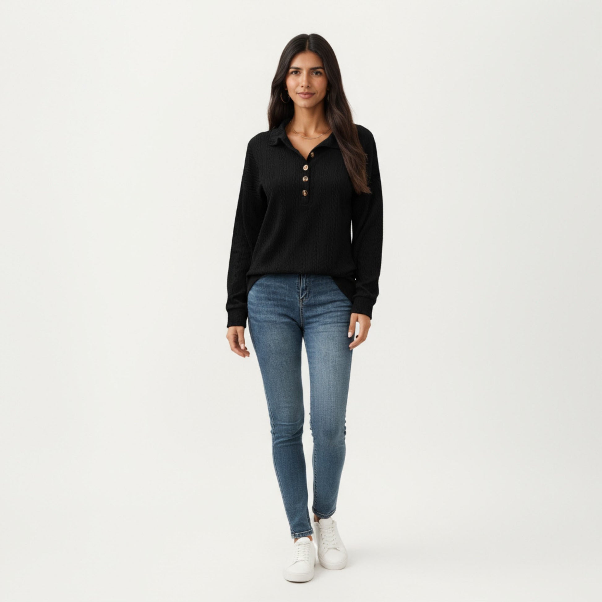 Collared Long Sleeve Button-Up Top with Textured Knit Design