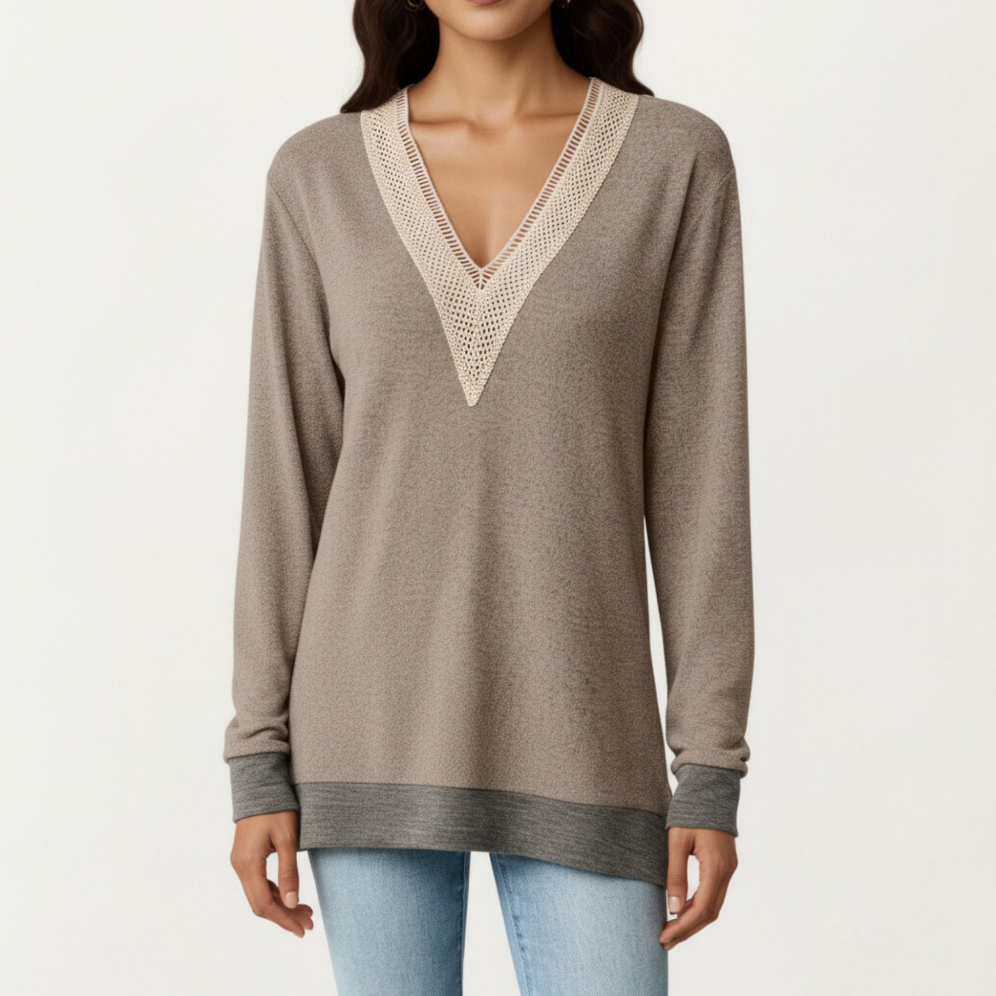 Long Sleeve V-Neck Top with Contrast Crochet Trim and Relaxed Hem