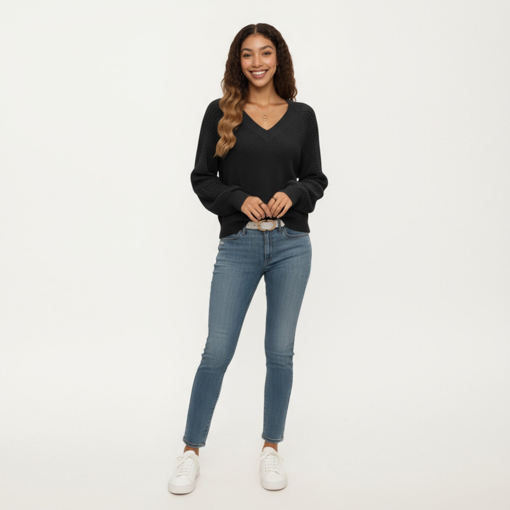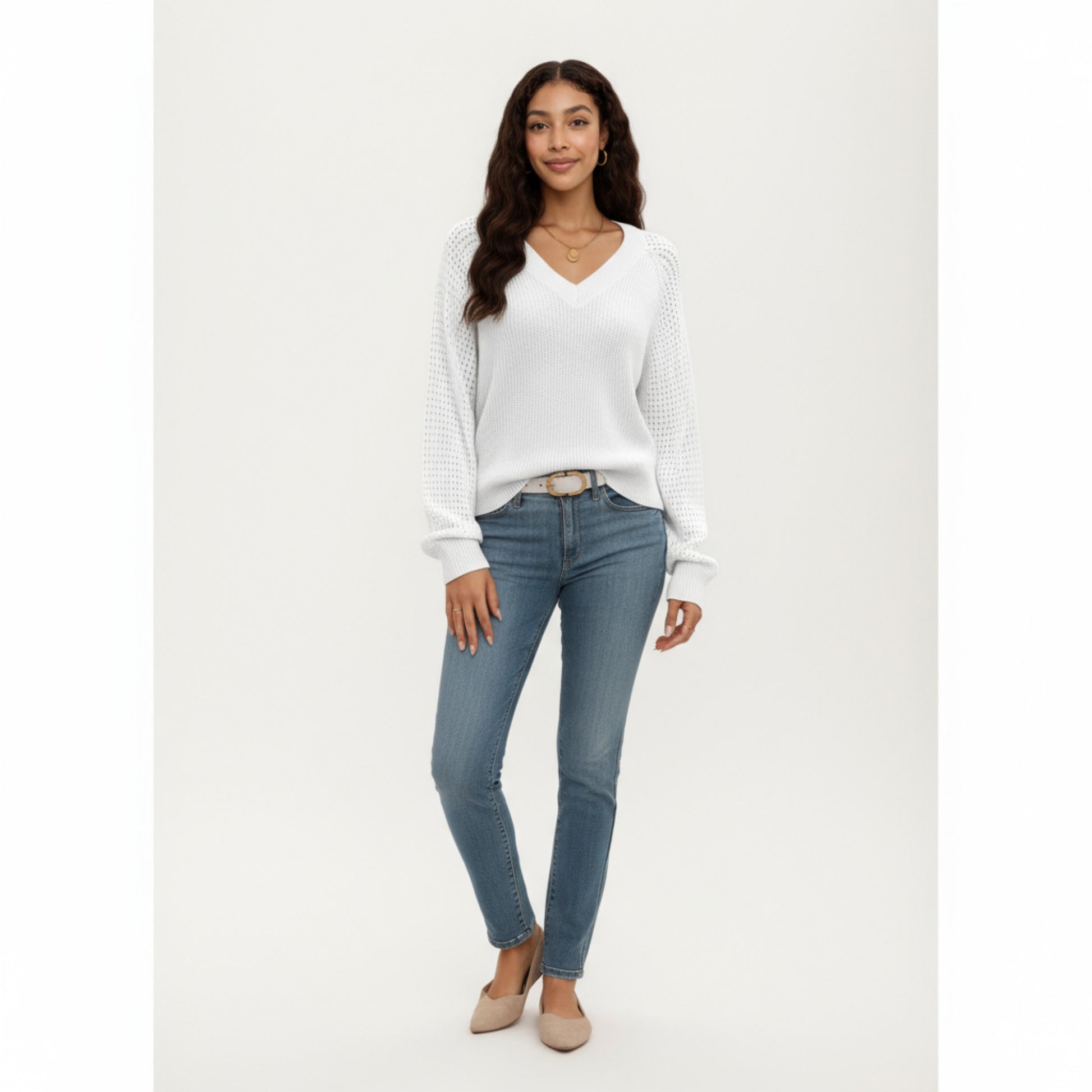 Off-Shoulder Knit Sweater with Pointelle Sleeves and Relaxed Fit
